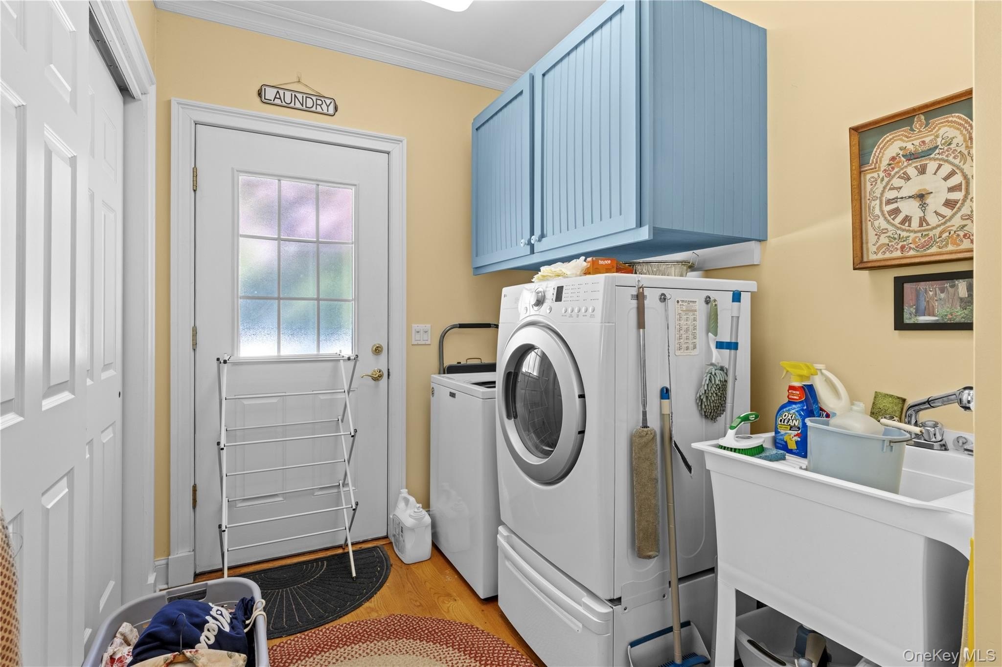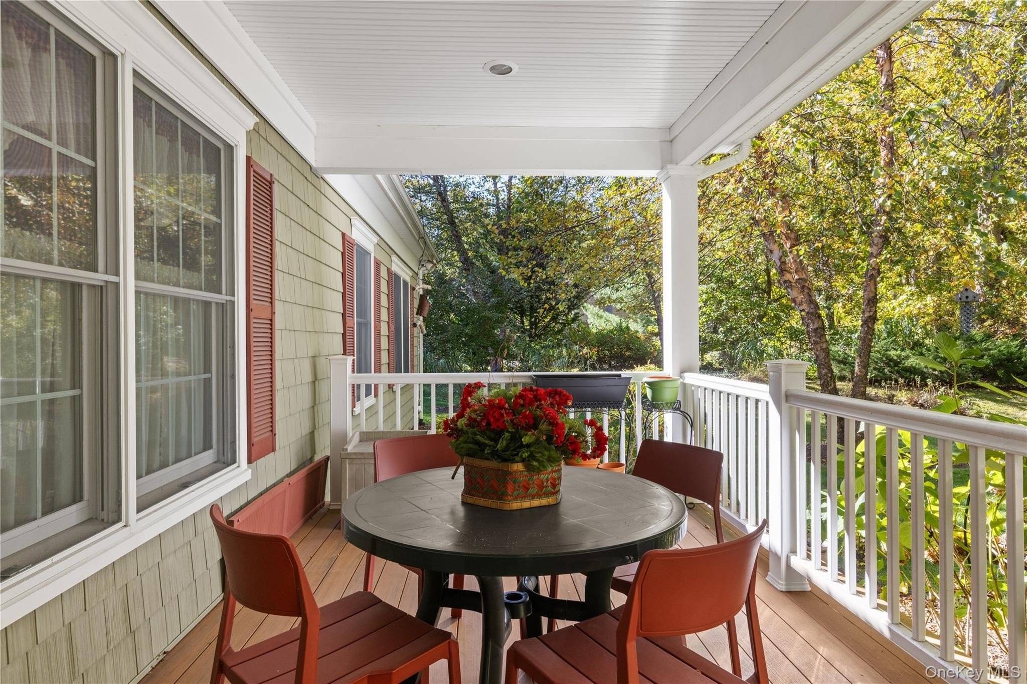 Jamesport, Beautiful traditional ranch style home nicely set on private drive far off of Peconic Bay Blvd on flag lot. This ranch has an open concept floor plan. The great room offers living room with gas fireplace and built in bookshelves, dining room, and snack bar gourmet kitchen. Front and back covered porches are alternate seating options for all weather sitting outdoors. Primary bedroom with en suite bath and walk in closet. Total 3 bedrooms plus additional full bath and separate laundry room. 9' ceilings and hardwood wide board oak floors throughout the home. Spacious 2 car garage and fantastic full basement unfinished with tall ceilings for possible future space. Established gardens .96 of an acre, with room for a pool!!! Close to Peconic Bay, lighted tennis courts, and playground. Begin your new lifestyle here on the North Fork exploring vineyards, craft breweries, farmstands, orchards, and beaches!!!