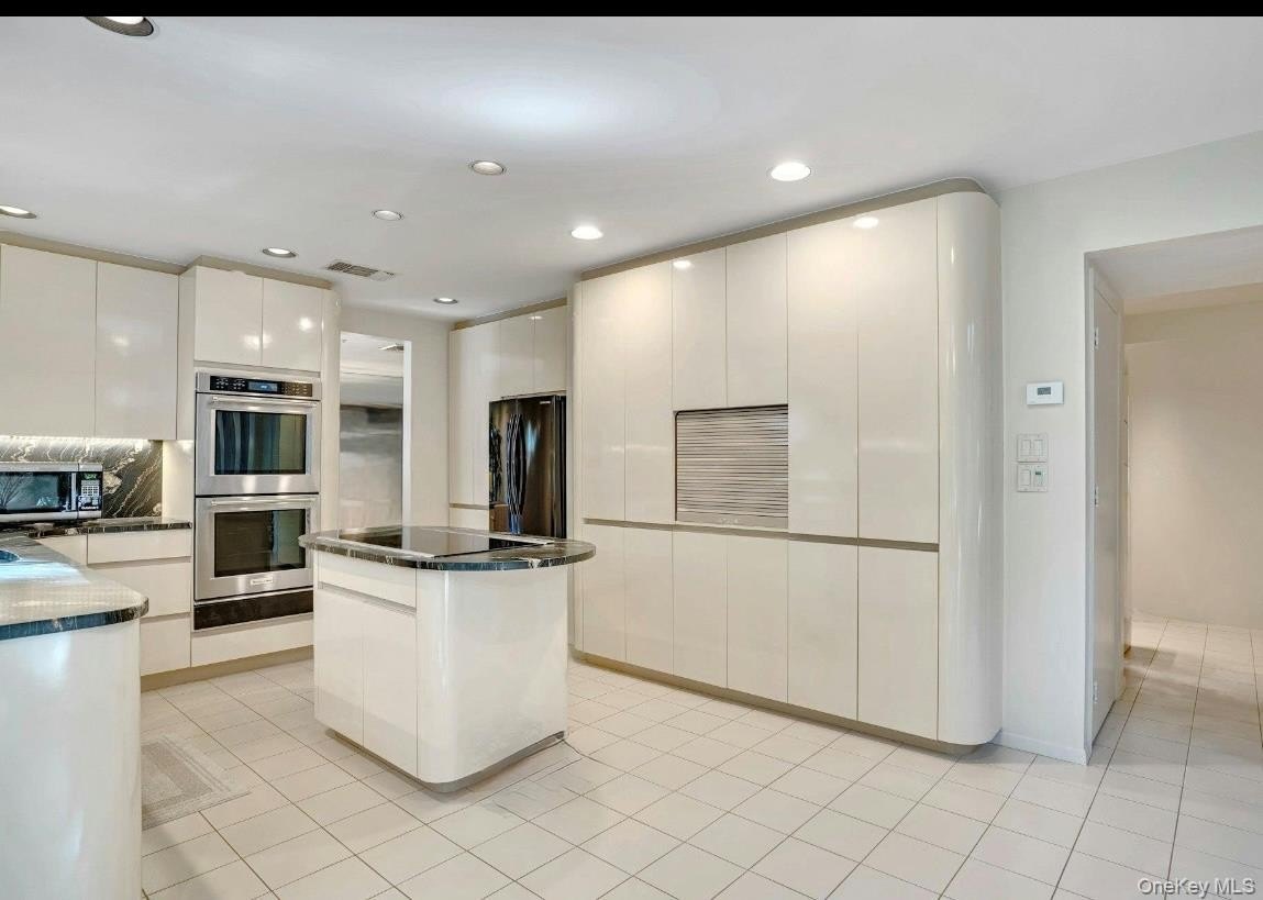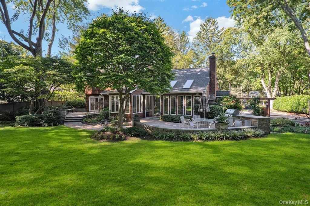 Welcome to this beautifully maintained four-bedroom Colonial, set in the sought-after Village on the Hill community. Situated within the renowned Half Hollow Hills School District, this home combines classic charm with a practical layout for comfortable living and easy entertaining. Elegant French doors open from the dining room onto a stone patio, and hardwood floors lie beneath the carpets in both rooms. The chef's kitchen is equipped with pristine modern cabinetry, new granite countertops, a Bosch stovetop, a Bosch dishwasher, and a barely-used double oven. Enjoy the sunny breakfast nook overlooking the gardens-perfect for year-round views, especially when snow turns it into a serene snow globe scene. Step down into the family room, where you'll find soaring ceilings and a wood-burning fireplace. A wall of glass invites you outside through sliding doors to the patio, and tinted skylights help protect your furnishings from fading. From the family room, access the office, which has its own entryway from the driveway, plus ample storage and a laundry room with a utility sink, as well as access to the one-car garage. The primary bedroom features a private ensuite bath and a wall of closets with custom shelving, while three additional bedrooms offer generous space. The unfinished basement provides plenty of room for storage and utilities. Recent upgrades include central air conditioning, a sprinkler system, a new hot water heater, 150 AMP electrical service, new gutters, landscaping, and professional stonework.