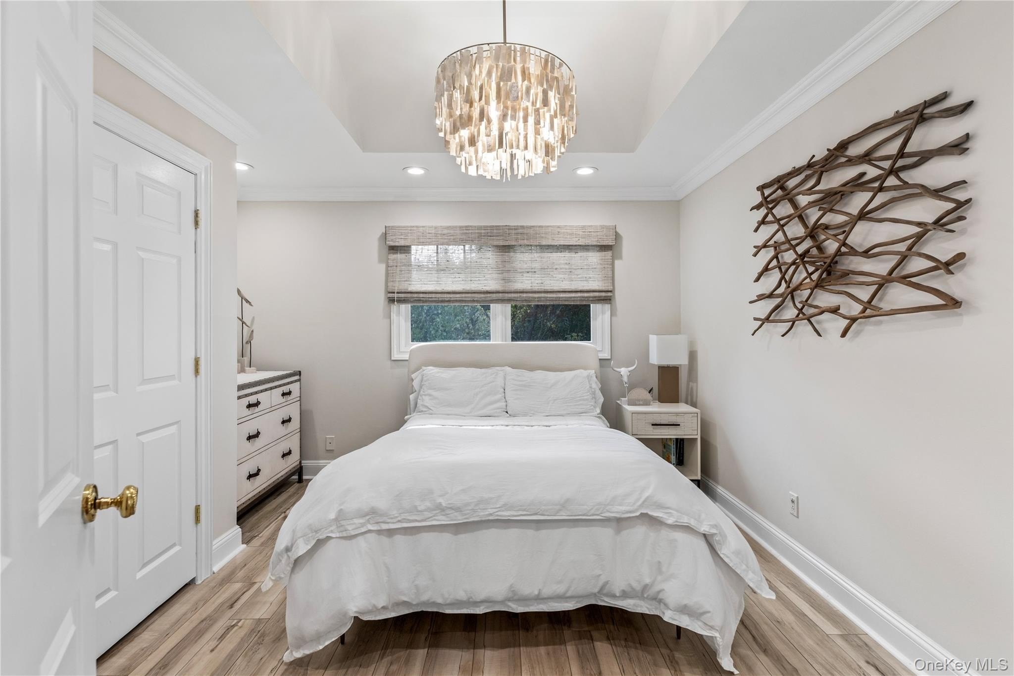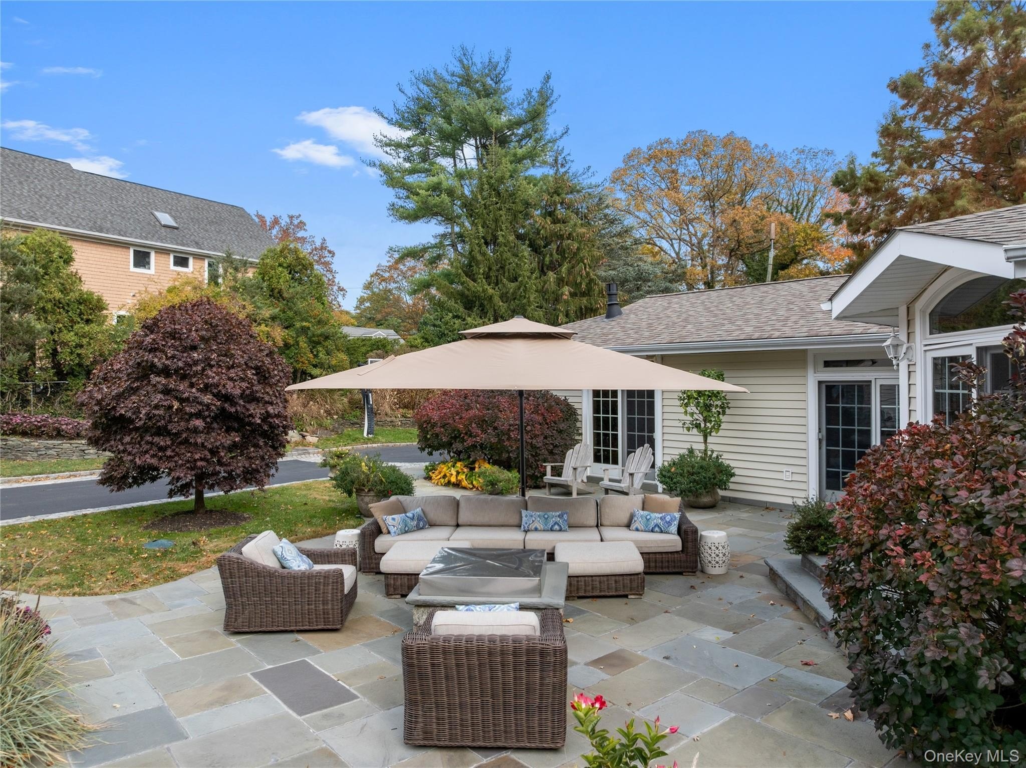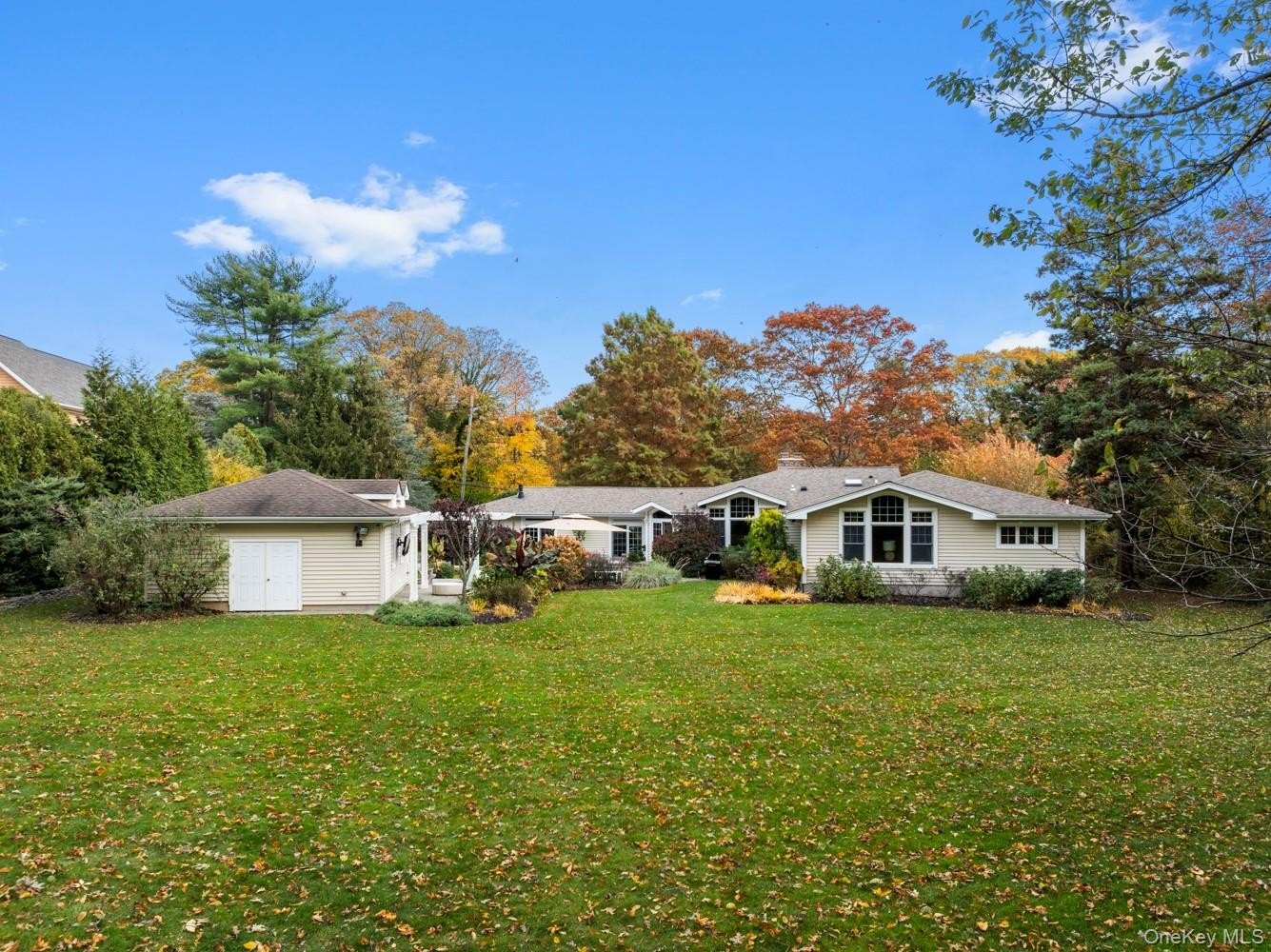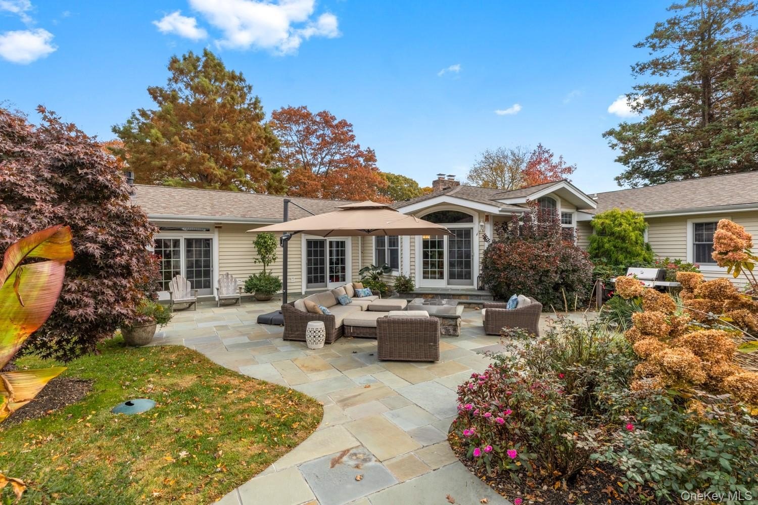 Situated on a perfectly flat, all-usable one-acre parcel, this elegant ranch embodies timeless design, exceptional craftsmanship, and modern comfort in one of Woodbury's most coveted enclaves. A new 40-year architectural roof crowns the residence, setting the tone for the quality and care found throughout. Inside, soaring ceilings and expansive rooms create a bright, open atmosphere ideal for both everyday living and entertaining. The oversized eat-in kitchen is a centerpiece of the home, featuring vaulted ceilings, abundant natural light, and top-of-the-line appliances. The formal living room with fireplace and the refined dining room with tray ceiling offer sophisticated spaces for gatherings, while the family room-framed by coffered ceiling details and sliding French doors-extends seamlessly to the outdoor patio and manicured grounds. Western exposure fills the home with warm afternoon light, highlighting the superior landscaping and specimen trees that define the property. Outdoors, the setting is as serene as it is private, complete with a tranquil waterfall feature that enhances the resort-like ambiance of the backyard. Space For Pool and much more. Luxury extends to every corner, with radiant heating, a snow-melt system, and individually zoned thermostat controls for ultimate comfort. A full French drainage system ensures meticulous property maintenance year-round. The large mudroom includes custom built-in cubbies, while an oversized detached garage offers additional storage with a flexible space that could be converted into a cabana or studio. Set on a quiet street within the prestigious Gates community, this residence also benefits from exceptionally low taxes, making it one of the most compelling offerings in Woodbury. Blending sophisticated finishes with thoughtful functionality, this remarkable home captures the essence of luxury living on Long Island's North Shore.