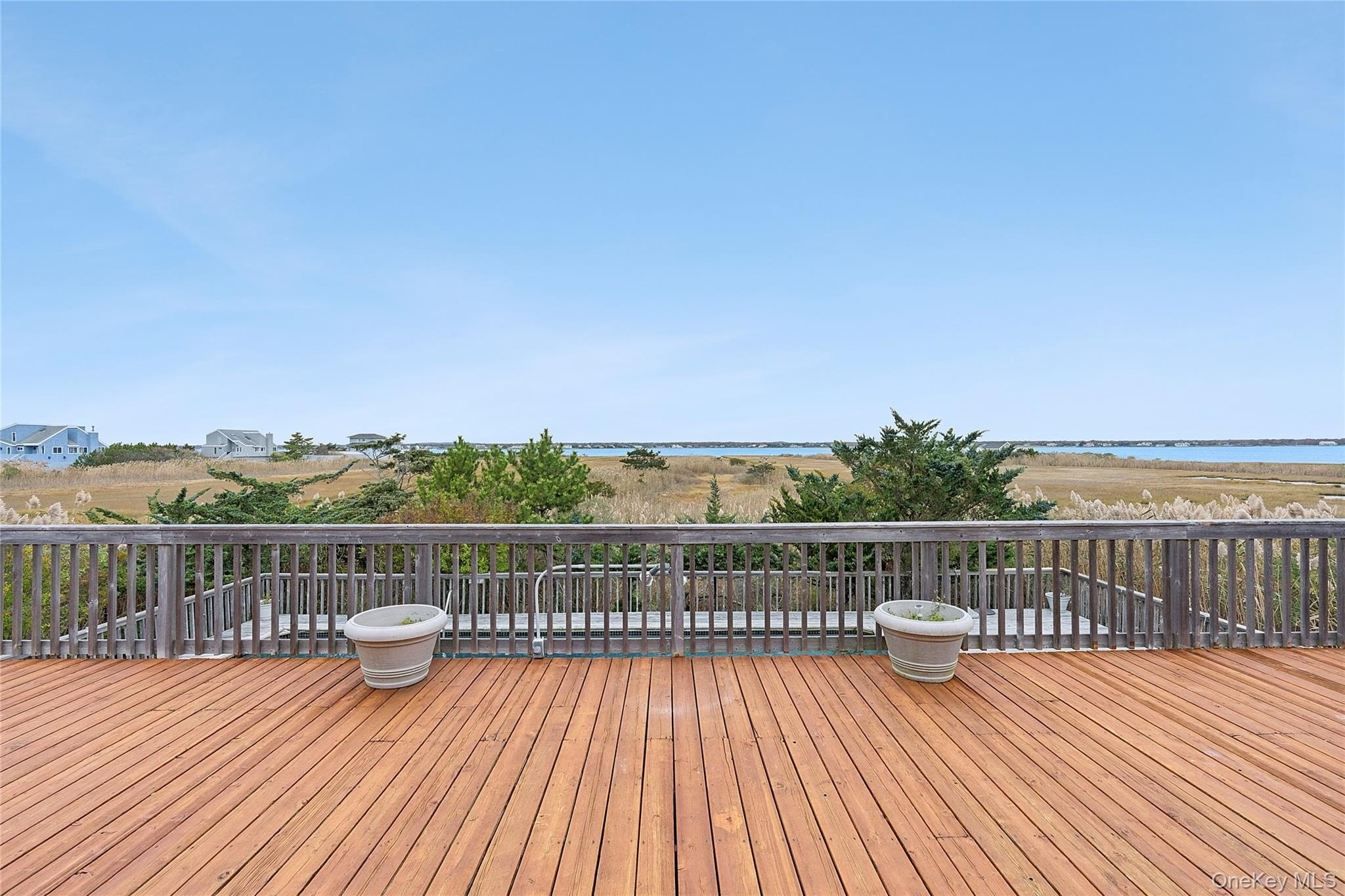 With unobstructed water views over +/-4.2 acres, this Westhampton bayfront beach house is a private oasis of coastal living. Deeded ocean access provides convenience to enjoy Dune Road's white sand beaches. The open floor plan of the house and multiple sliders to the expansive deck perfectly frame the world-class bay views. The great room offers high ceilings and a wood-burning fireplace. The kitchen and dining area open to the deck to offer both indoor and outdoor dining options. Accommodations include four well-sized bedrooms and two full bathrooms. Outdoor amenities include a heated, gunite 18' x 40' pool, ample decking for entertaining and lounging, and a pool bathroom with shower. With a strong rental history and close proximity to Westhampton Beach's restaurants, boutique shopping, Performing Arts Center, and weekend farmers' market make this beach house one not to be missed!