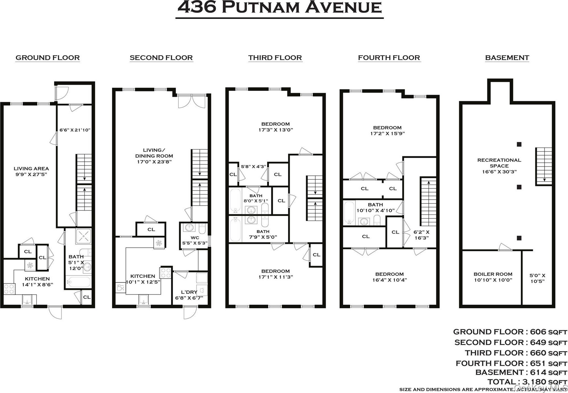 Welcome to 436 Putnam Avenue, a beautifully maintained multi-story brownstone with a finished basement located on a picturesque, tree-lined block in the heart of Bedford-Stuyvesant, Brooklyn. This expansive townhouse offers over 3,432 square feet of living space, blending timeless architectural charm with spacious modern living. The ground floor features a bright living area, updated kitchen, and full bathroom, offering a versatile layout perfect for entertaining or guest accommodations. The second floor boasts an open-concept living and dining space with a powder room and laundry area, ideal for hosting gatherings or relaxing evenings. Upstairs, the third and fourth floors provide a total of four large bedrooms and three full bathrooms, offering flexibility for a growing household or multiple home office setups. The fully finished basement includes a large recreation space and boiler room, adding functional square footage for storage, fitness, or creative use. With high ceilings, large windows, and well-defined rooms across every level, this home delivers both character and comfort. Conveniently located near local cafes, restaurants, and boutique shops, and within easy reach of public transportation (A, C, and G trains), 436 Putnam Avenue captures the best of Brooklyn living-space, style, and location in one exceptional package. Surrogate Court Approval Required before Transfer of Title!