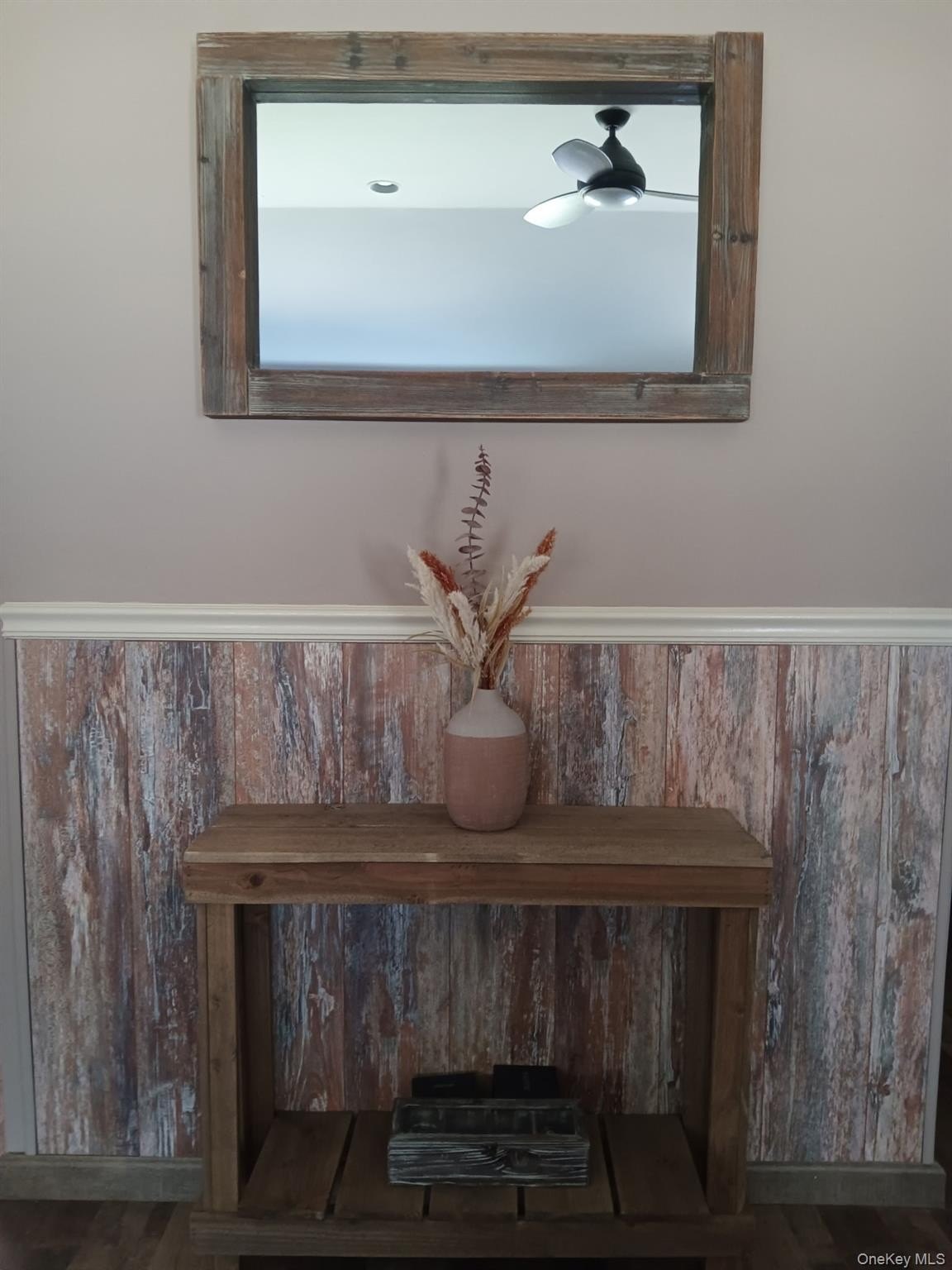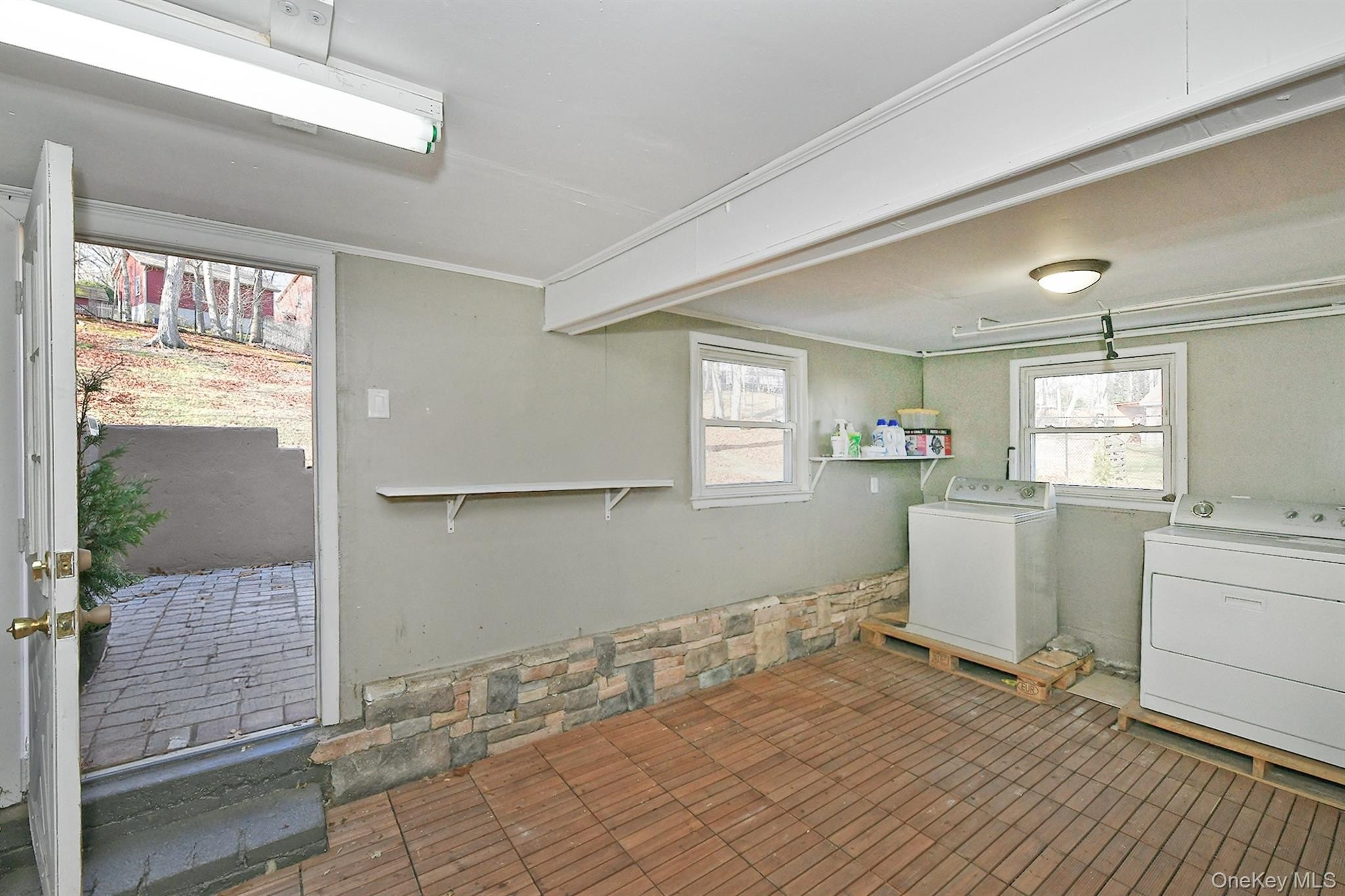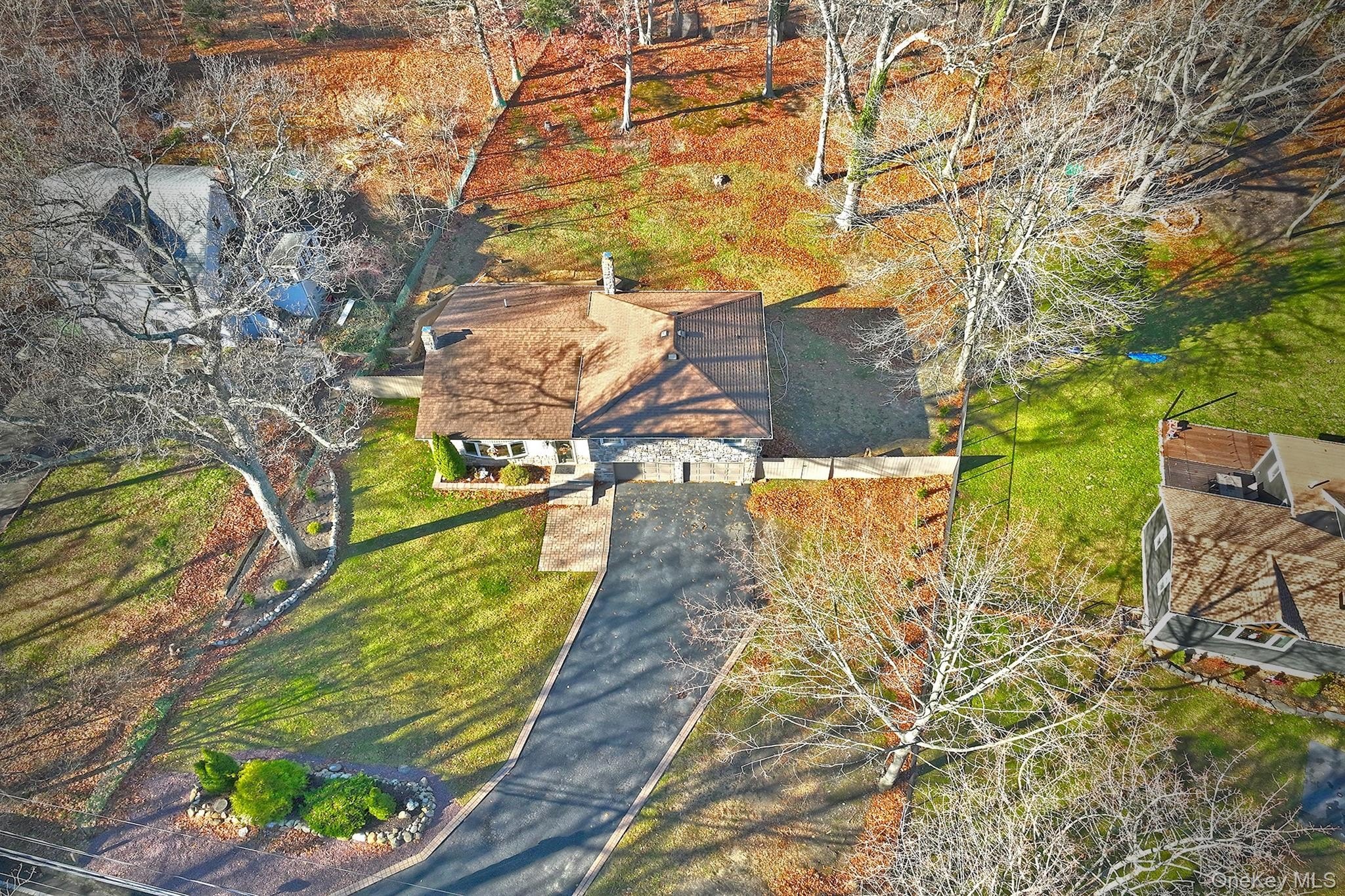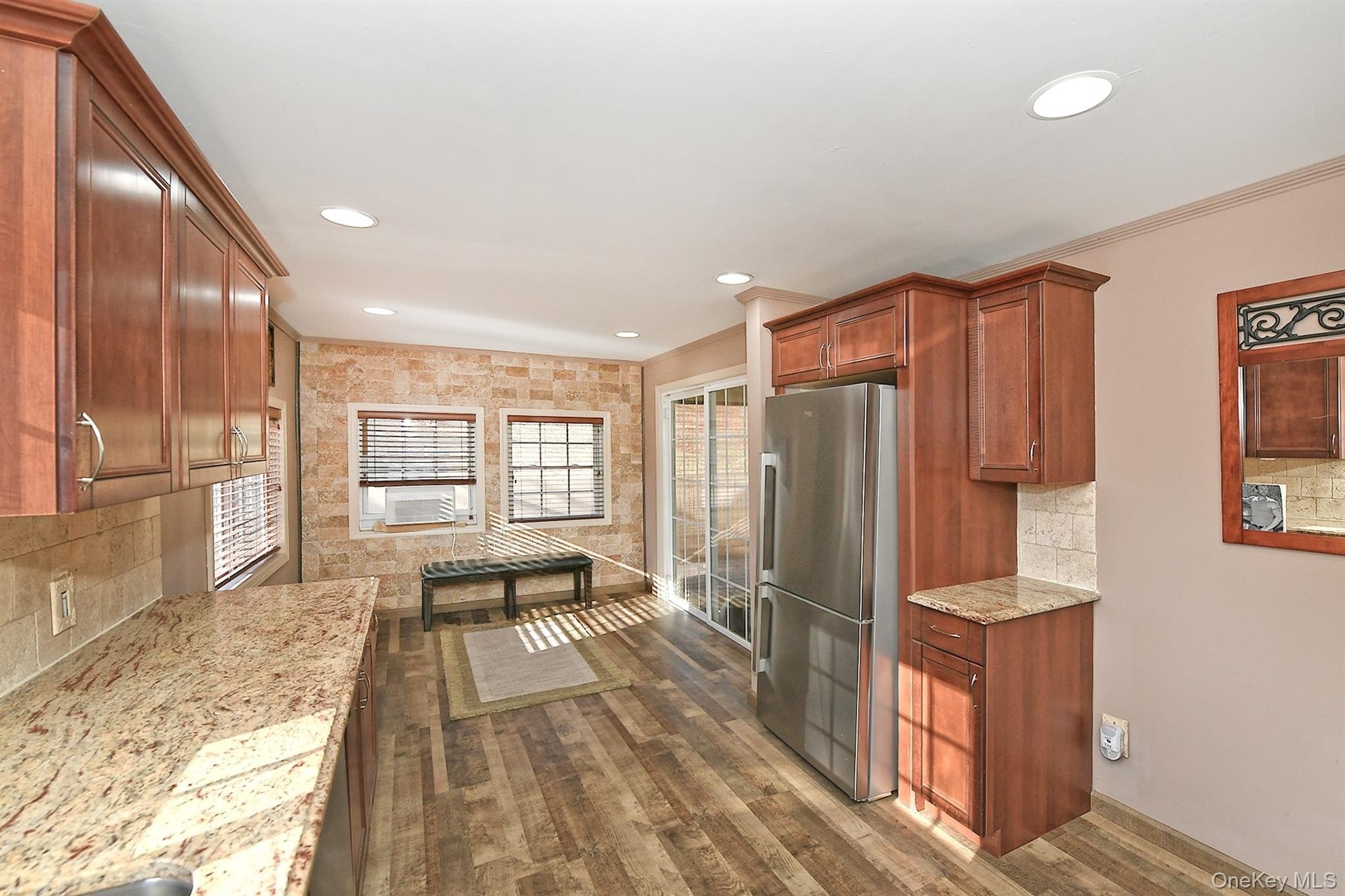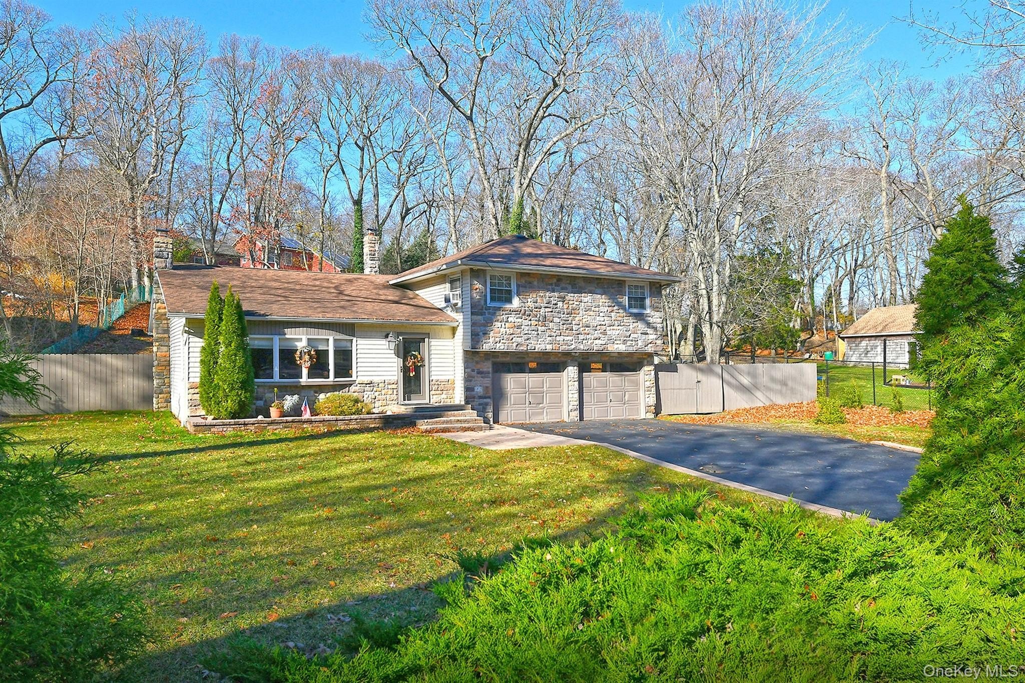 Discover rustic charm and modern comfort in this beautifully updated split-level home, ideally located north of 25A in the sought-after Rocky Point beach community. Just moments from the Long Island Sound, this home offers deeded beach rights and the rare opportunity to enjoy a peaceful wooded setting with coastal conveniences. Step inside to a warm and inviting entry featuring a stained-glass door and custom accent wall leading into a stunning 24' X 15' den with soaring 11' ceilings. The space is anchored by a floor-to-ceiling cultured stone fireplace and a tumbled marble TV surround, perfect for relaxing or entertaining. The spacious eat-in kitchen boasts granite countertops, stainless steel appliances, tumbled stone accents, and access to the enclosed screened porch. Hardwood floors continue upstairs where four generously sized bedrooms feature crown mouldings, custom trim work, LVP accent walls, and ample closet space. Both bathrooms are fully remodeled with LED vanity mirrors, tumbled stone borders, and premium finishes. Outside, enjoy Nicolock pavers, retaining walls, outdoor sensor lighting, and a large 0.40+ acre yard. Additional highlights include an oversized finished 2-car garage with epoxy flooring, extra storage room, attic with plywood flooring, 3-zone sprinklers, and full alarm system. Move-in ready and rich with character-this is beach community living at its finest.