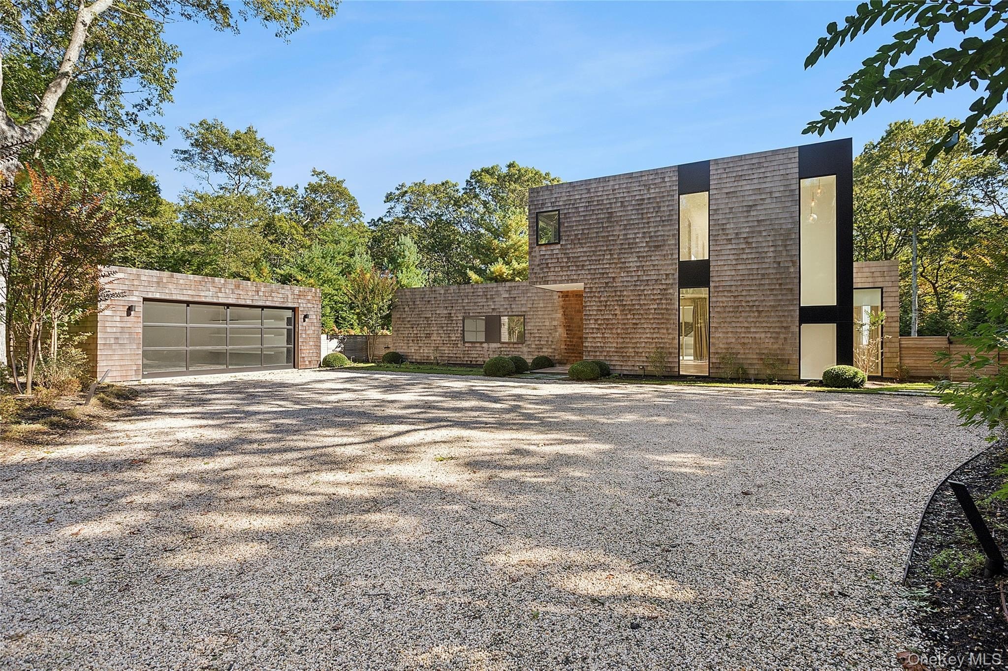 Experience the ultimate in sustainable luxury in this nearly new 4,250 +/- sq. ft. residence on nearly 1.5 acres of very private, lushly landscaped property. A striking blend of glass, cedar, and stucco; the home is approached by a stone driveway framed by mature plantings, offering a grand yet welcoming arrival. Inside, a custom floating steel staircase anchors the entry, leading to an open, light-filled floor plan enhanced by 10' ceilings, expansive sliding glass doors, and a southern orientation that maximizes natural light. The living room, with its sleek gas fireplace, flows seamlessly into the generous dining area-ideal for intimate dinners or stylish entertaining. Just beyond, a large covered mahogany deck creates a true indoor/outdoor experience, complete with a chic al fresco dining area, outdoor TV, bar, and a spacious lounge centered around a dramatic gas fireplace. The state-of-the-art kitchen features custom cabinetry, low-maintenance Silestone counters, a breakfast bar, and premium appliances by Liebherr, Bertazzoni, and Viking. A first-floor junior primary suite-also perfect as a den-includes an en-suite bath, along with a guest powder room. Upstairs, the private primary suite occupies its own wing, offering two walk-in closets and a spa-like bath. Two additional en-suite bedrooms and a full laundry room complete the level. The impressive lower level, with 9' ceilings, offers a large multi-use great room-perfect for a media area, bar, or gaming space-plus a secluded fifth bedroom and full bath ideal for guests, family, or staff. The fenced, resort-style grounds include expansive lawns, vibrant landscaping, a fire pit, a chic outdoor shower, and a stunning 16' x 32' saltwater gunite pool. A detached two-car garage completes the offering. Located minutes from Sammy's Beach, Three Mile Harbor, and a quick drive to East Hampton and Sag Harbor villages, the home offers easy access to world-class dining, shopping, and water activities. As a bonus, this property is designed as a Net Zero home, integrating geothermal heating, solar energy, high-efficiency systems, and passive solar design to dramatically reduce operating costs.