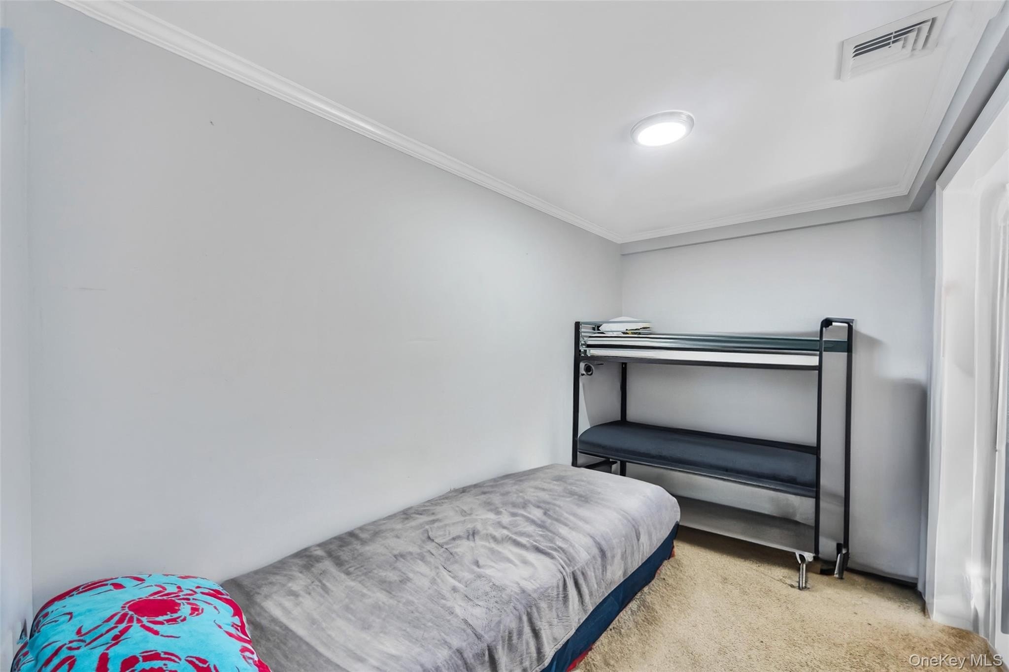 An incredible opportunity awaits! This magnificent, sprawling ranch, just a stone's throw from Canaan Lake, boasts an oversized horseshoe driveway with ample off-street parking. Featuring five oversized bedrooms and two spa-like bathrooms with tubs, showers, and elegant white vanities. This home shines with a brand-new roof, stunning vinyl siding, and beautiful windows with lots of natural light. The chef's kitchen is a showstopper with stainless appliances, stainless steel oven, dishwasher, white refrigerator, white cabinetry, granite countertops, and abundant counter and storage space. Enjoy beautiful, updated flooring, crown molding, custom trim work, high ceilings, a sleek coffered ceiling, recessed lighting, and ceiling fans in the bedrooms. Step outside onto your wooden deck or the large front concrete patio, perfect for relaxing or entertaining. Cobblestone flowerbeds are on the front patio adding to the home's charm. With a part unfinished basement, young central AC, and a forced hot air system, this home truly has it all nestled in the sought-after Patchogue-Medford School District!