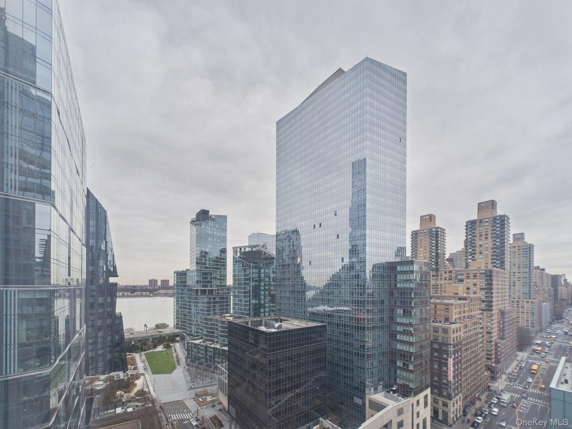 Residence 20B at 10 West End Avenue combines river views, impressive scale, and exceptional convenience at the crossroads of the Upper West Side and Midtown. This 1,329-square-foot corner home features approximately 11-foot ceilings and floor-to-ceiling windows with striking north and west exposures, capturing the Hudson River and stunning sunset views. The expansive living and dining area stretches nearly 25 feet and offers a natural setting for entertaining or relaxing. The open galley kitchen is finished with Sub-Zero, Viking, and Bosch appliances, black absolute and jet mist granite countertops, and custom cabinetry, creating a sleek and functional culinary space. The private bedroom wing includes a west-facing primary suite with generous closet space and an en-suite bath finished in a modern blend of marble and wood. The second bedroom receives excellent natural light and sits adjacent to the home's additional full bath, providing flexibility for guests, a home office, or additional living needs. A private balcony overlooks the river, offering the perfect place to unwind and enjoy the sunset. 10 West End Avenue is a full-service luxury condominium featuring a 24-hour concierge, a 50-foot glass-enclosed lap pool, a state-of-the-art fitness center, and a playroom designed by the Children's Museum of Manhattan. Additional amenities include on-site parking (subject to availability), cold storage, and bike storage. Located on West 60th Street, the building offers immediate access to the Hudson River Greenway, Lincoln Center, Columbus Circle, multiple transit options, and the recreational spaces of Riverside Park and Central Park.