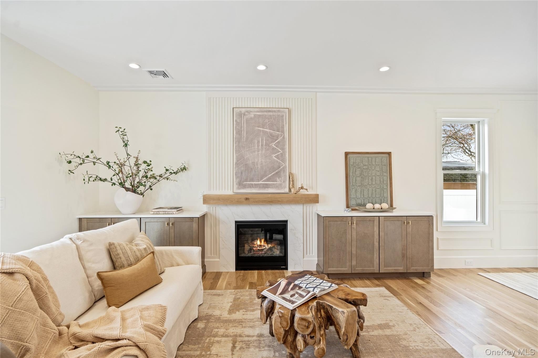 This brand-new construction blends modern farmhouse style with timeless elegance, offering 5 bedrooms, 5.5 baths, and a fully finished basement with outside entrance. The first floor features a dramatic double-height entry with custom raised panel detailing that flows into the formal dining room with built-in hutch, complete with a coffered ceiling and dry bar-perfect for entertaining. Wide-plank white oak hardwood floors, 9-foot ceilings, and custom crown molding create a seamless sense of luxury. A spacious first-floor bedroom or office, full bath, ideal for extended family. The chef's kitchen boasts gas cooking, an oversized island, premium stainless-steel appliances, and LED accent lighting. The adjoining family room includes a gas fireplace with built-in cabinets on either side, and sliders leading to a professionally landscaped, fenced yard with paver patio. Second floor features four oversized bedrooms, including a primary suite with decorative ceiling, coffee bar, walk-in closets, and a spa-like bath with soaking tub, glass-enclosed shower, double vanities, plus make-up vanity, and radiant heated floors. A laundry room, and 3 additional bedrooms, two more full bathrooms complete the second level. The fully finished 1,600 sq. ft. basement with a full bath and outside entrance offers endless possibilities-home gym, media room, bar, or more. East Meadow School District