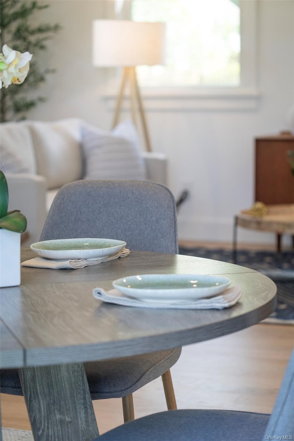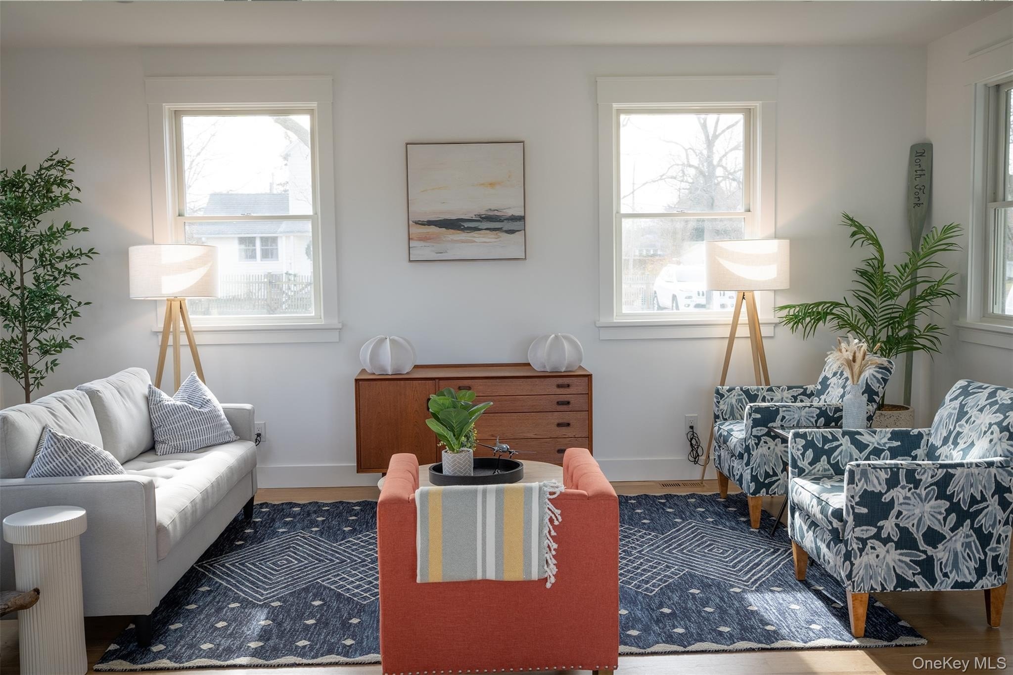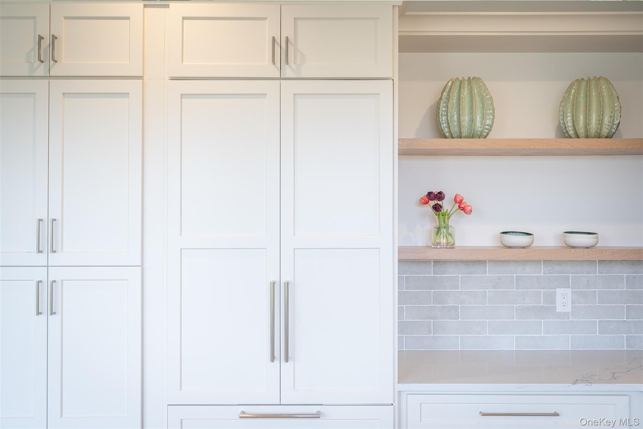 Okay, so the first thing, you get out of the car and this farmhouse style has the front porch that actually has room for a side table and chair to have my morning coffee in peace that I have wanted so badly. Then inside, the half bath is right next to the front door, but it's tucked far enough away from the open living room and kitchen that it doesn't feel awkward when all of us are hanging out. The kitchen has the paneled fridge, a real panty closet and open shelves that I have always liked. The kitchen sink is setup where I am staring out to the backyard when I am stuck doing dishes, so good. They even say there is room for a pool. Then the dining room has this full glass slider to the yard, so the whole back of the house is just filled with light, you can even see the view of the yard from the living room. Upstairs, the ensuite bathroom is honestly my favorite surprise, the floor is so interesting, and the whole space feels calm with the finishes they picked. Even the downstairs bathroom has this beautiful wallpaper that makes this new construction feel intentional, not an afterthought. What I love is this location makes you feel like you found a secret corner of Greenport. You're literally tucked up against the maple tree forest, so it's quiet and green in the best way. The backyard is fully fenced so if the decision is for the pool, it doesn't feel tight. And because this one is New Construction, everything just feels solid and reliable. Best part, the house is also a half mile away from the LIRR train station and Hampton Jitney stop to get to NYC. I think this might be the one, you have to come see it.