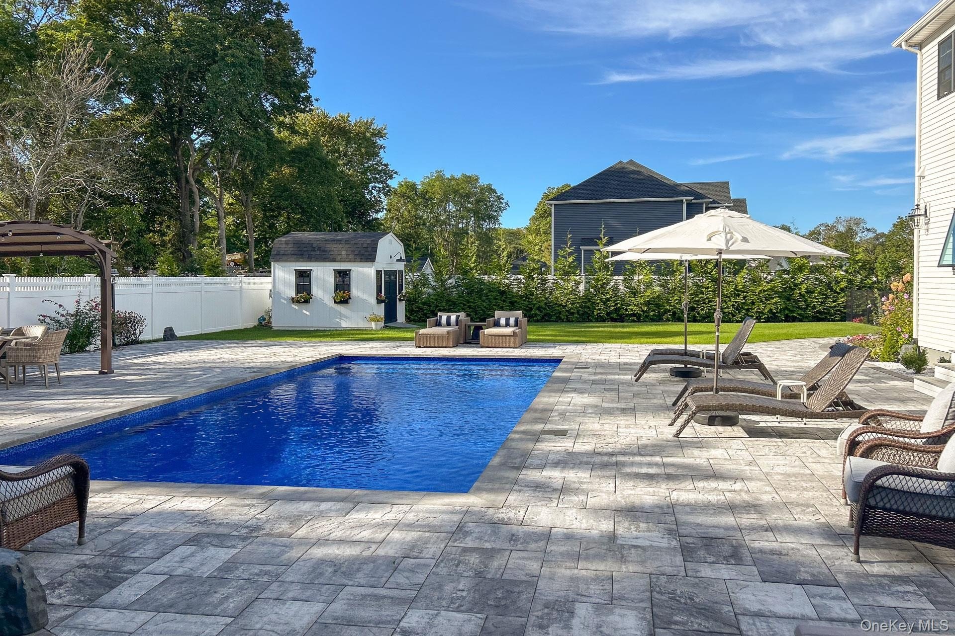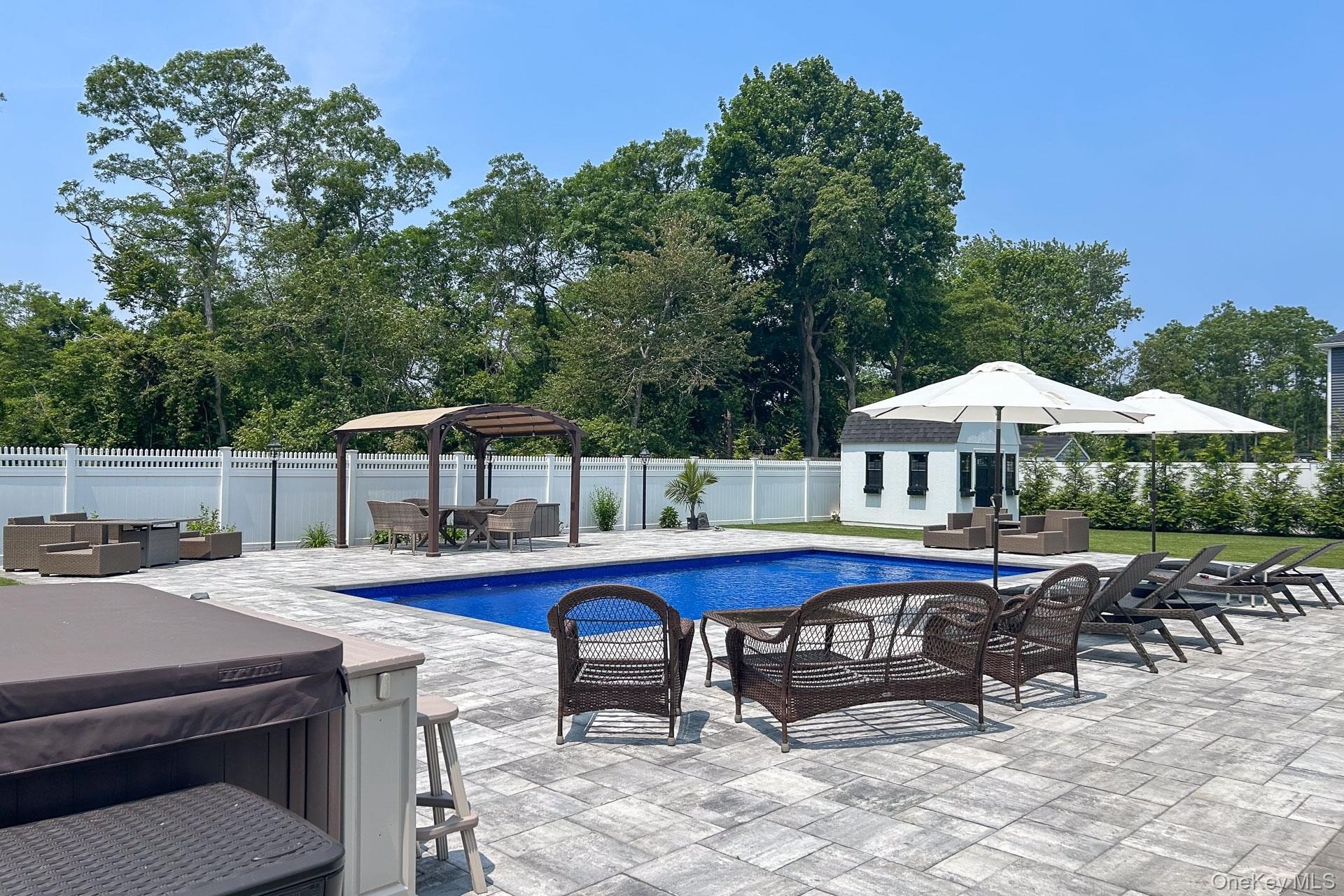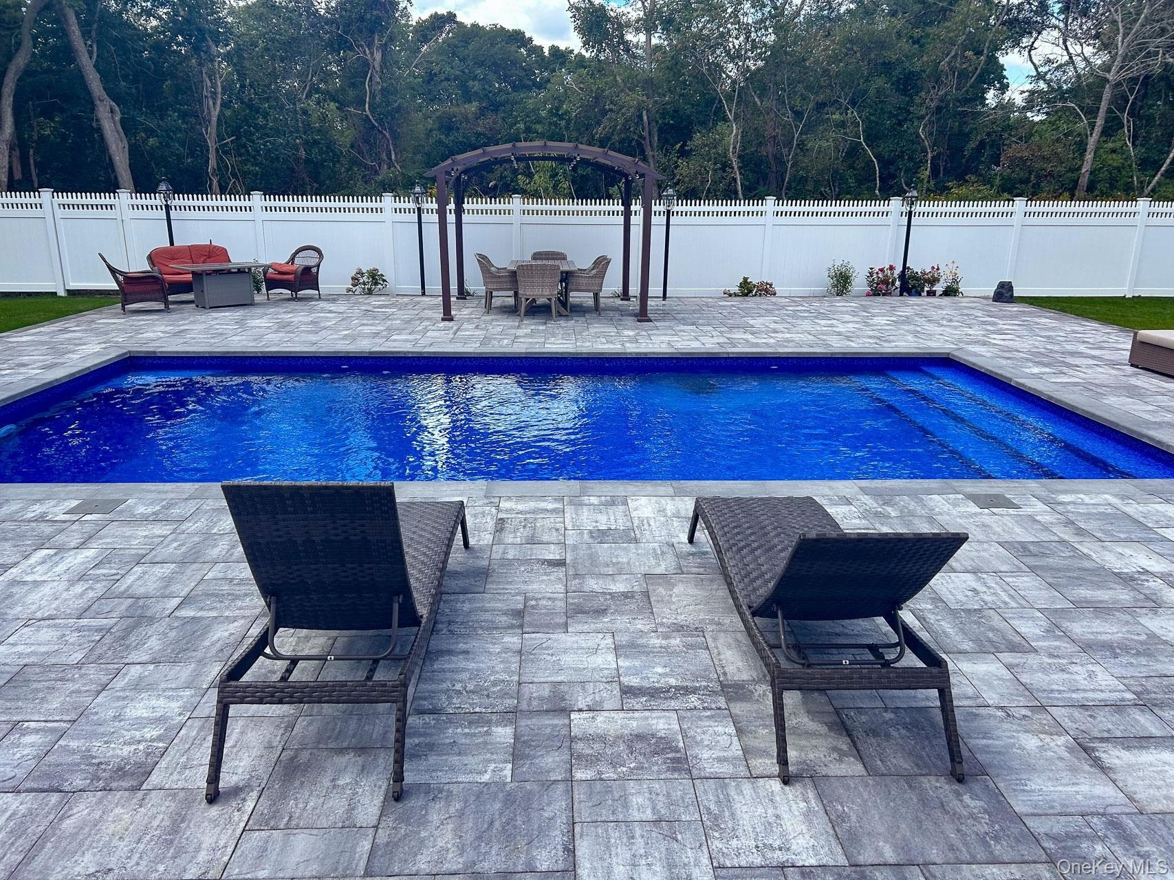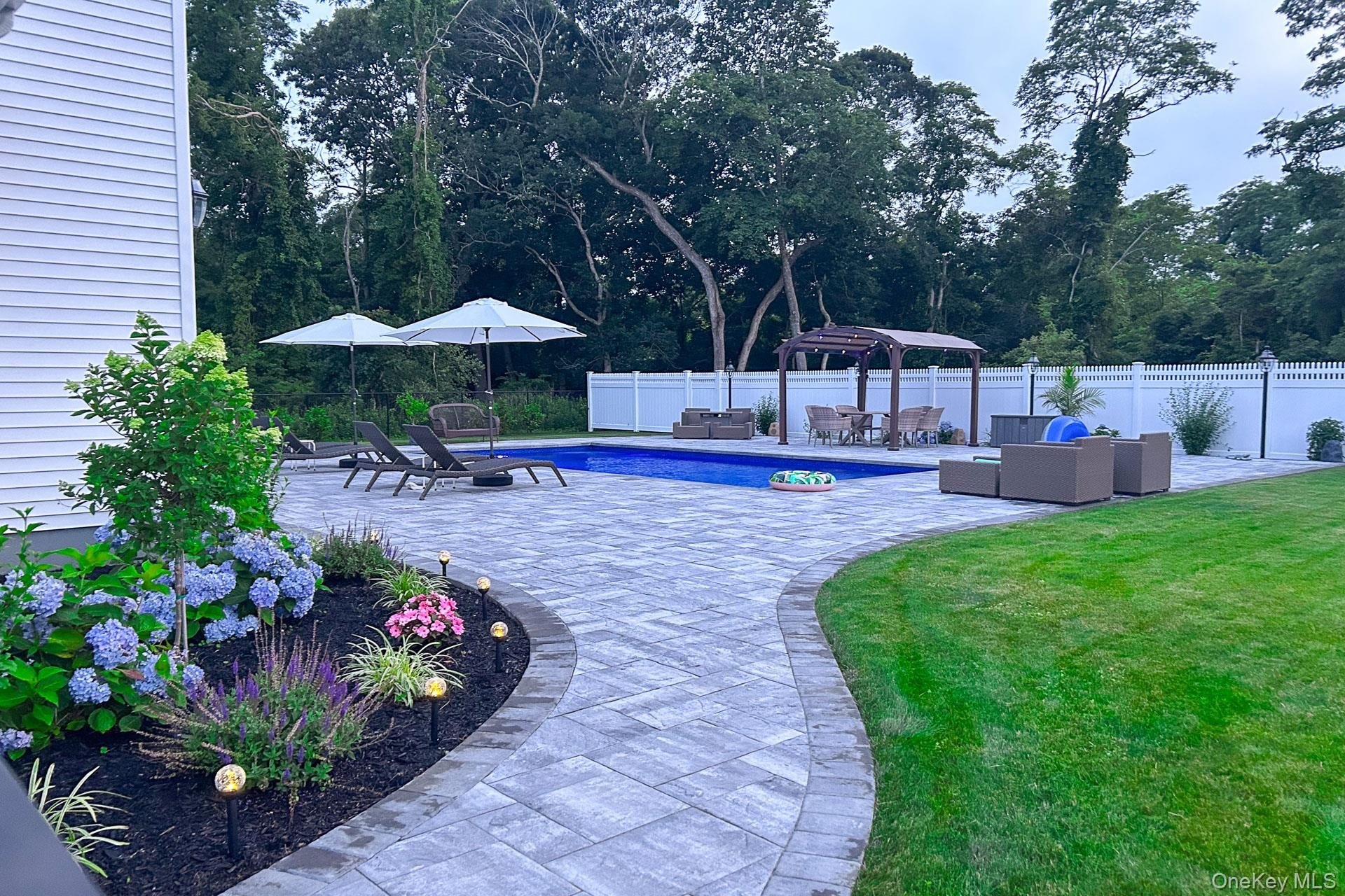 Tucked away at the end of a cul-de-sac block on a newly developed street, this exceptional residence built in 2023 offers modern comfort, luxury finishes, and a dream outdoor oasis. Enjoy the privacy of only having one neighbor next to you. The heated, saltwater inground pool, installed in 2024 by Swim King, is the highlight of the property, surrounded by a gorgeous paving stone patio that is perfect for arranging many different sitting and dining areas. Paver walkways lead you to the beautifully landscaped yard, creating a serene and elegant outdoor setting. The home's exterior features upgraded black-frame windows and a stylish metal front porch roof, enhancing its modern curb appeal. There is plenty of room for your guest to park with the extended driveway that wraps to the side of the home. Step inside to a bright and airy interior designed with additional windows to fill each room with natural light. A dramatic two-story entry foyer welcomes you, leading to spacious living areas all with hardwood floors throughout. The kitchen is equipped with a center island with built-in microwave, free standing hood and adjoining Butler's Pantry complete with a beverage/wine refrigerator that is perfect for entertaining. Upstairs, you'll find upgraded bathroom tilework and showers, along with the convenience of a second-level laundry room. A full basement with outside entrance (OSE) offers endless potential for future customization. Located in the highly regarded East Moriches School District, offering a choice of ESM, Center Moriches, or Westhampton Beach High School. East Moriches is known as the gateway to the Hamptons, providing easy access to all the beauty and amenities the South Fork has to offer. This young, meticulously finished home is truly turn-key and ready to enjoy both inside and out.