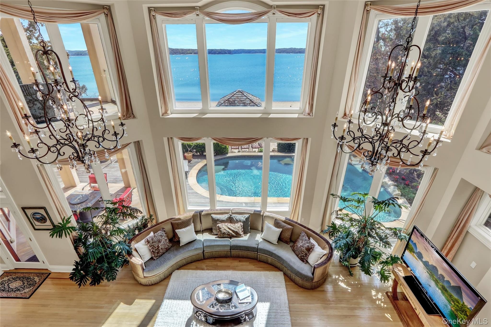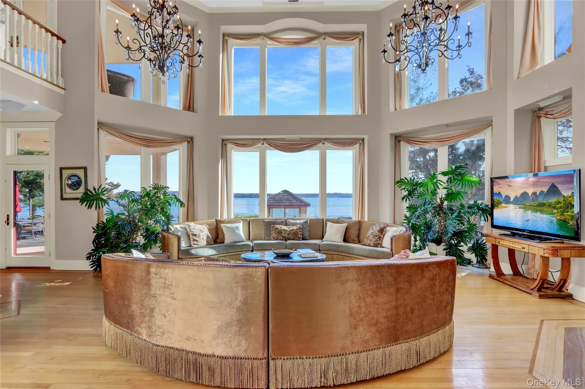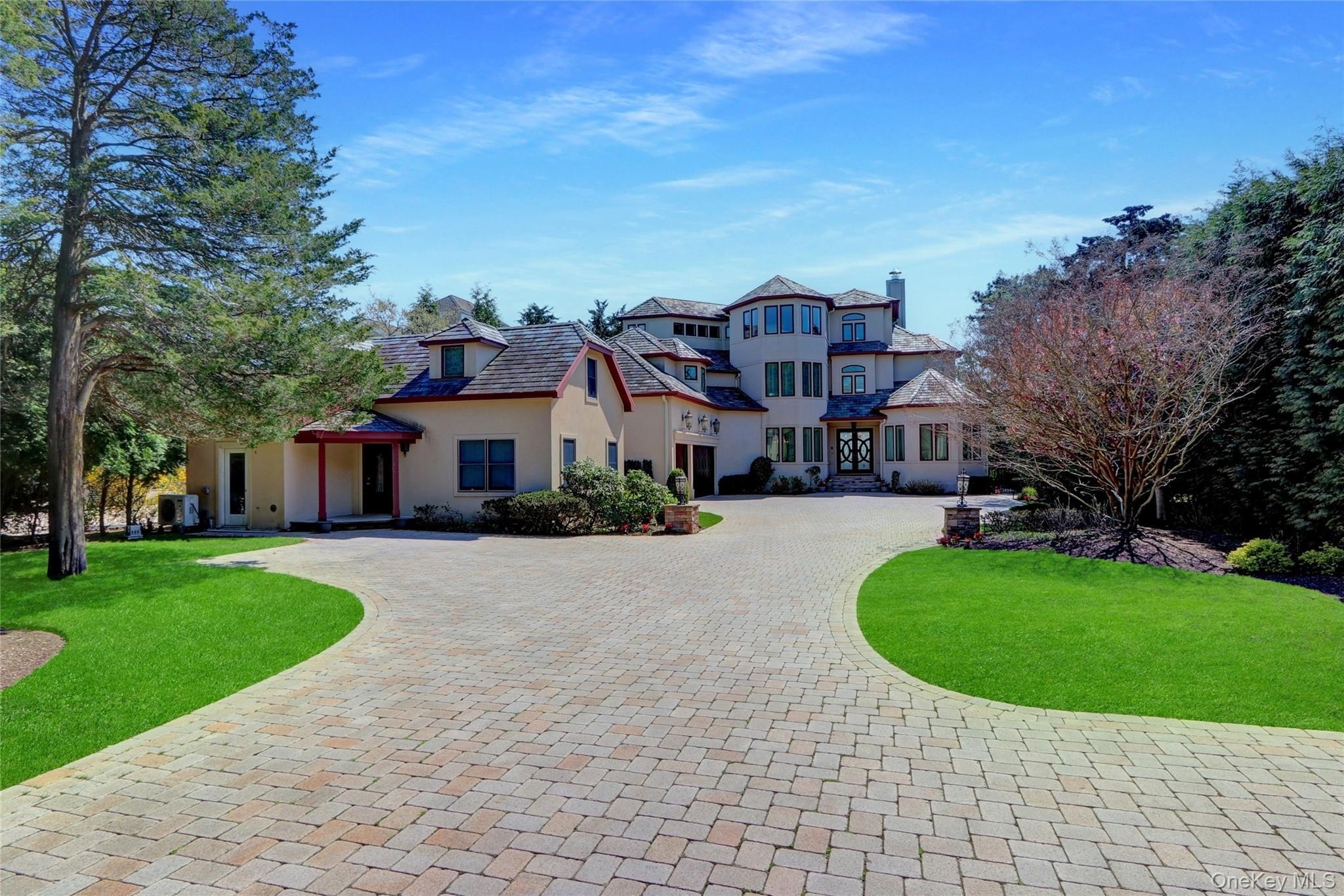 Experience luxury coastal living in this breathtaking 3-level Mediterranean-style estate, perfectly positioned on the shores of Northport Bay. Designed for both grand entertaining and intimate relaxation, this home offers 4 ensuite bedrooms, 5.5 bathrooms, and timeless architectural elegance throughout. The third-floor primary suite is a private retreat, featuring a balcony with panoramic water views, a spa-inspired bath with a soaking Jacuzzi tub, steam multi-jet shower, and dual walk-in closets, gas fireplace and home gym. A private elevator provides seamless access to all three levels. The main living area boasts a dramatic great room with 20-foot ceilings and floor-to-ceiling walls of glass that flood the home with natural light. Additional living and formal dining rooms provide versatile spaces for gatherings of any size. The chef's eat-in kitchen is outfitted with premium Thermador appliances, including a tower refrigerator, freezer, and wine cooler system, as well as a Wolf commercial-grade stove-ideal for both everyday cooking and culinary entertaining. Outdoors, enjoy the heated inground salt water pool with a cascading waterfall, or unwind in the beachside cabana. Completing this remarkable waterfront compound is a charming 2-bedroom, 2-bathroom cottage-perfect for guests, extended family, or a private office. An oversized 3-car garage provides ample space for vehicles and storage. This is coastal Mediterranean luxury at its finest-where every detail is designed to impress and just one hour from NYC.