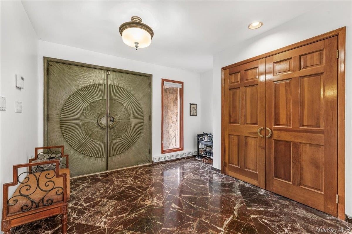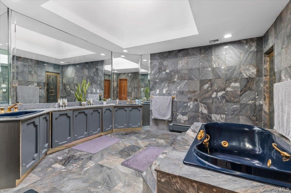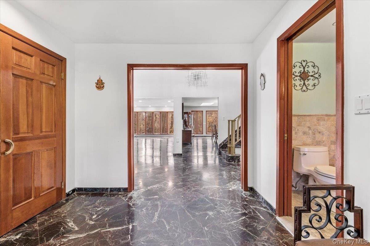Set on just shy of a one-acre parcel, backing directly onto Lake Garrison, this impressive stone mansion offers an extraordinary opportunity to create a truly exceptional luxury residence within the incorporated Village of Lake Success. Encompassing over 7,000 square feet of living space, the home is defined by grand scale, striking architectural elements, and sun-drenched interiors throughout. A dramatic 30-foot entry foyer welcomes you with a custom domed skylight and soaring ceilings, setting the tone for the home's elegance. Floor-to-ceiling windows throughout the main level bathe the interior in natural light. The first floor features an expansive living room ideal for entertaining, a formal dining room, an eat-in kitchen with center island and breakfast nook, a large private office, two generously sized bedrooms, one full bathroom, a powder room, and direct access to a covered patio overlooking the property's serene, park-like grounds. The second level offers exceptional bedroom accommodations, including five additional bedrooms and two full bathrooms, plus a spacious primary suite complete with a walk-in closet and private en-suite bath. The fully finished lower level expands the home's versatility, featuring a large recreation room, exercise room, wet bar, second kitchen, bedroom, full bathroom, laundry area, and ample storage-ideal for extended living, entertaining, or guest quarters. Additional highlights include a two-car attached garage and a premier setting with unparalleled privacy and tranquil lake views. While the home reflects its original grandeur and scale, it is in need of updates and thoughtful restoration, presenting a remarkable opportunity to customize and elevate a true estate property at a coveted luxury price point. An exceptional canvas for those seeking space, location, and long-term value in one of Long Island's most desirable villages.