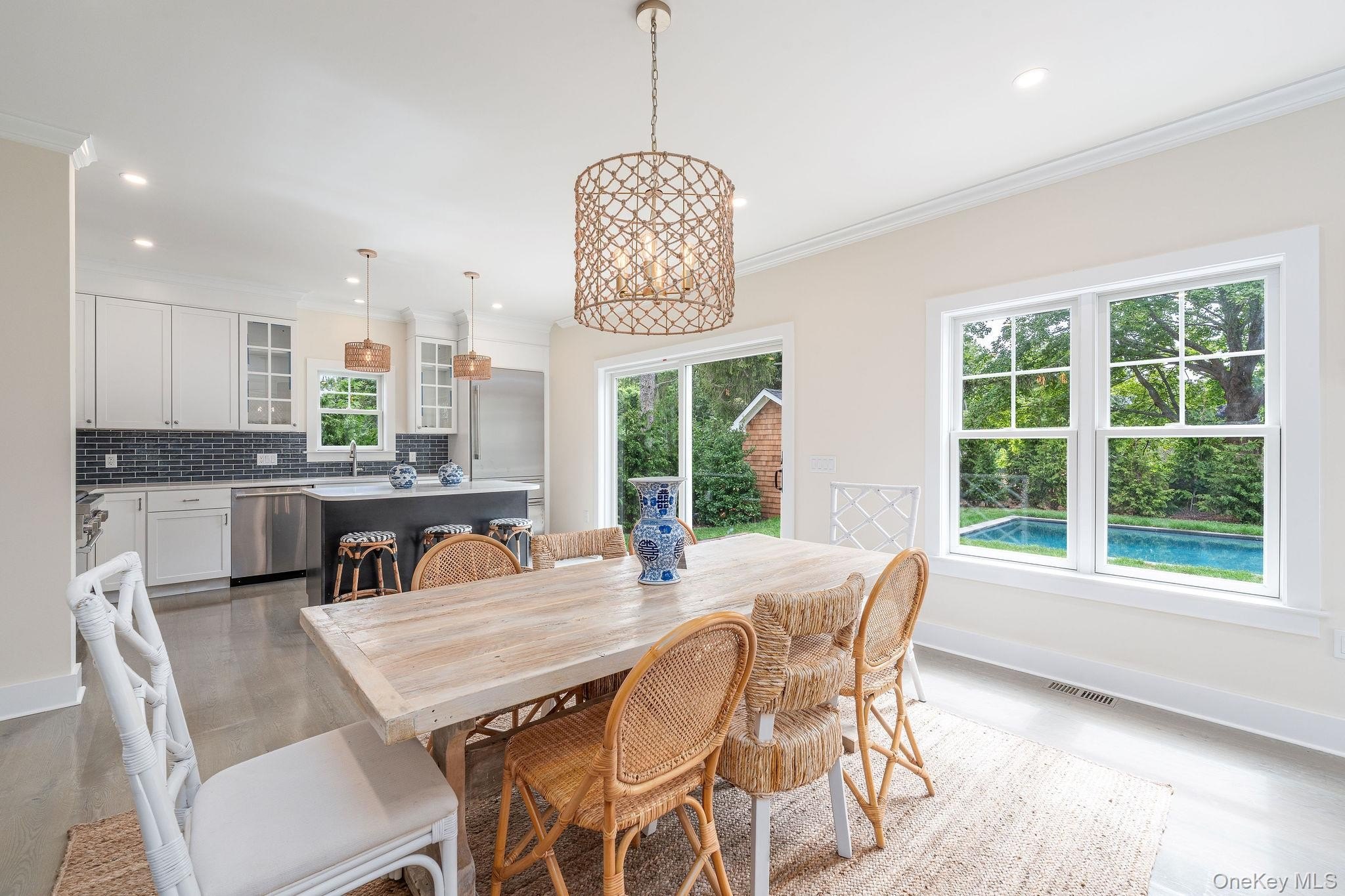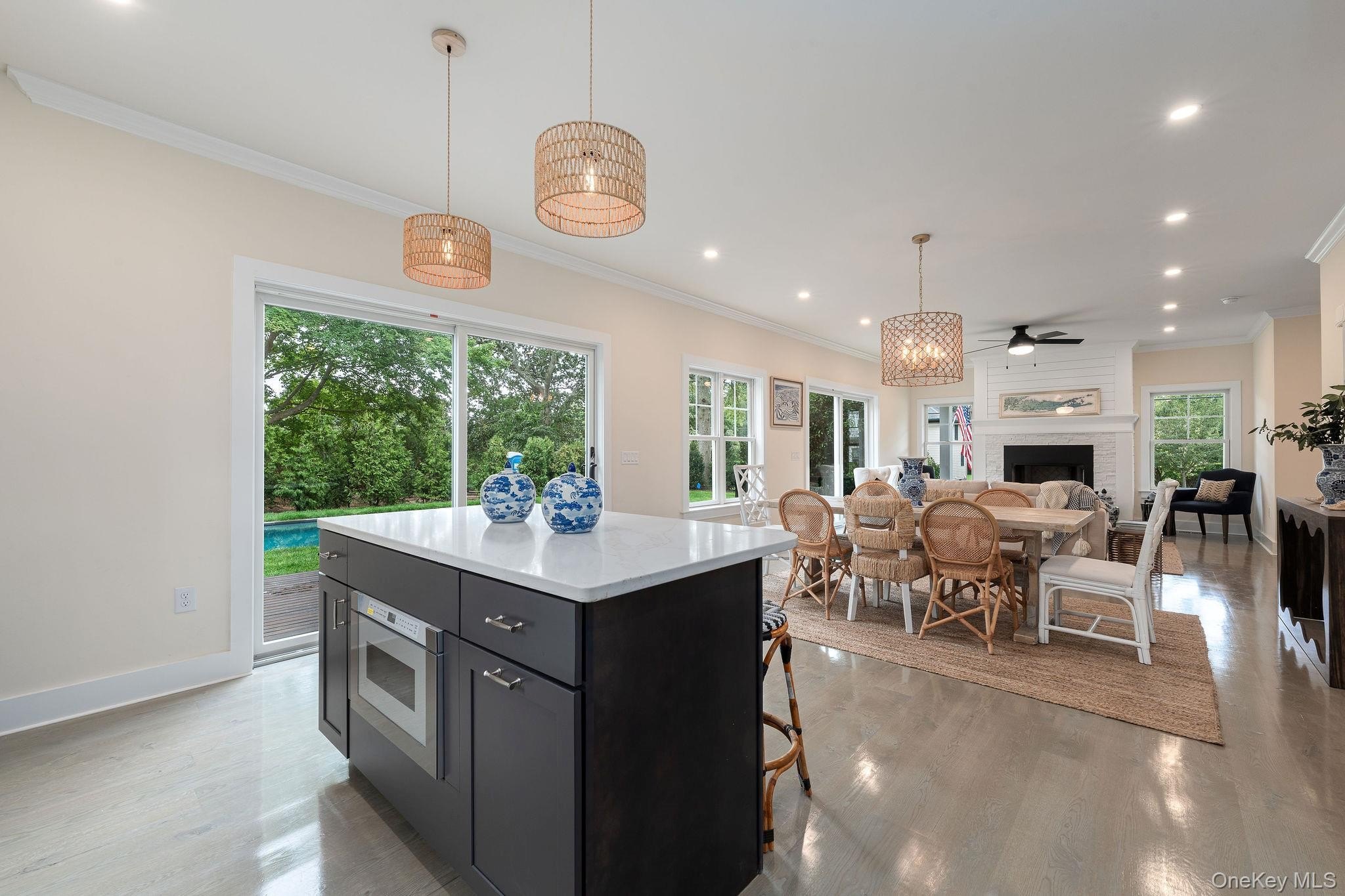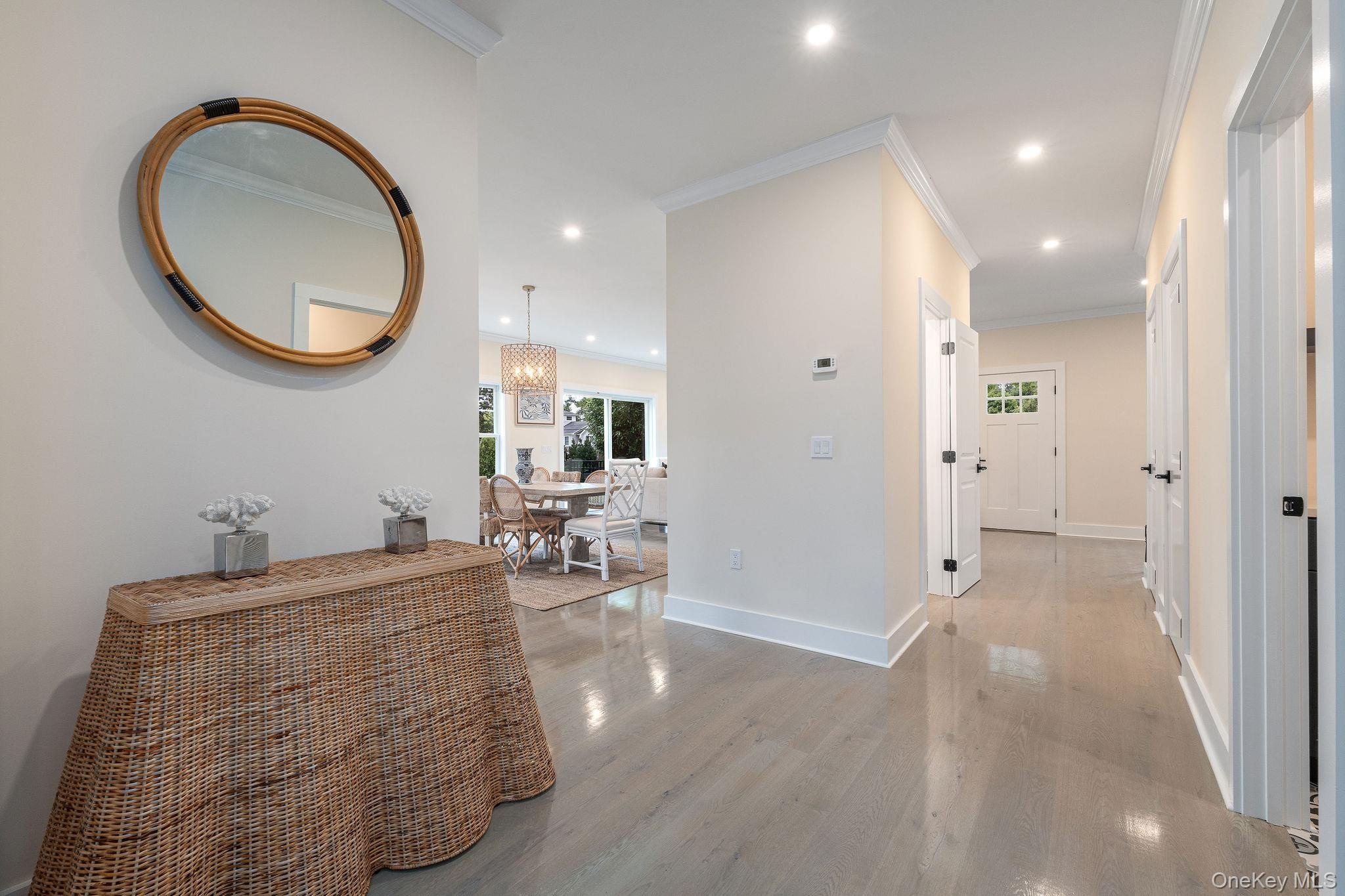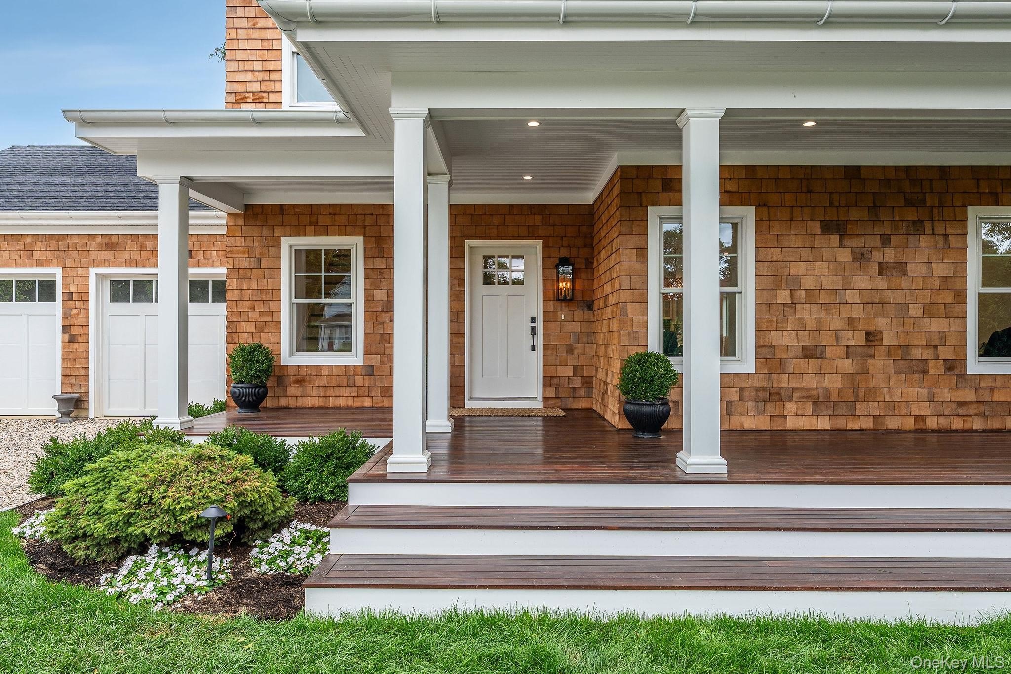Welcome to this luxurious new construction in the heart of South Jamesport, just half a mile from the beach and 200 yards from deep-water marina. Located in an exceptional neighborhood, this beautifully crafted home features 3 spacious bedrooms and 2.5 elegant bathrooms, including a stunning primary ensuite with a marble bathroom, double vanity, and large custom closets. Designed with an open-concept layout, the entire home boasts 7-inch wide oak wood floors, a cozy gas fireplace, and a gourmet kitchen equipped with premium Thermador appliances. The full basement, with 9-foot ceilings and two egress windows, offers the potential to add up to two additional bedrooms-perfectly aligned with the septic system already approved for five bedrooms. Step outside to enjoy a 16x32 heated inground gunite saltwater pool, surrounded by professional landscaping, landscape lighting, and an irrigation system. A charming front porch with a tropical wood deck completes this exceptional offering, blending refined interior design with resort-style outdoor living.