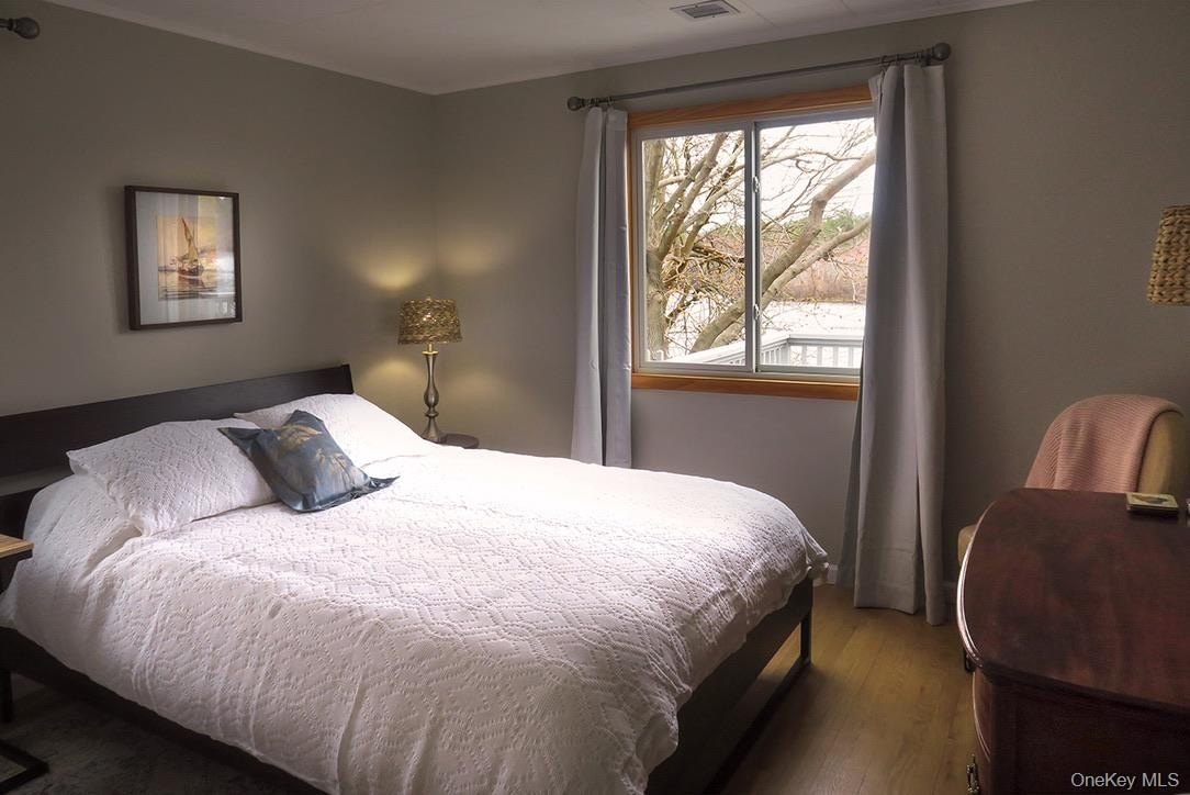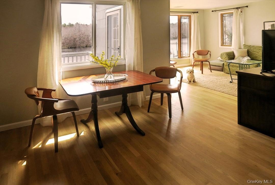 Updated waterfront cottage with dock on the Peconic River, ideally located on West Main Street in Riverhead and offering a strong rental history. Originally built in 1939, this two-story home features 2 bedrooms and 2 full baths with approximately 1,032 square feet of living space and beautiful water views throughout. The main level includes an eat-in kitchen with granite countertops and stainless steel appliances, a living and dining area, two bedrooms, and a full bath. A welcoming foyer provides the perfect space for a home office. The finished walk-out lower level offers a recreation room, full bath, laundry, and a flexible art studio or multi-purpose space, ideal for summer entertaining. Enjoy exceptional outdoor living with a covered front porch, back deck, patio, yard, and private 12' x 16' dock. Additional highlights include central air conditioning, gas hot-air heat, hardwood floors, rear canopy with slab, shed, ample parking, and a .19-acre waterfront setting. A rare opportunity for personal enjoyment, rental income, or both perfect for all your East End activities.