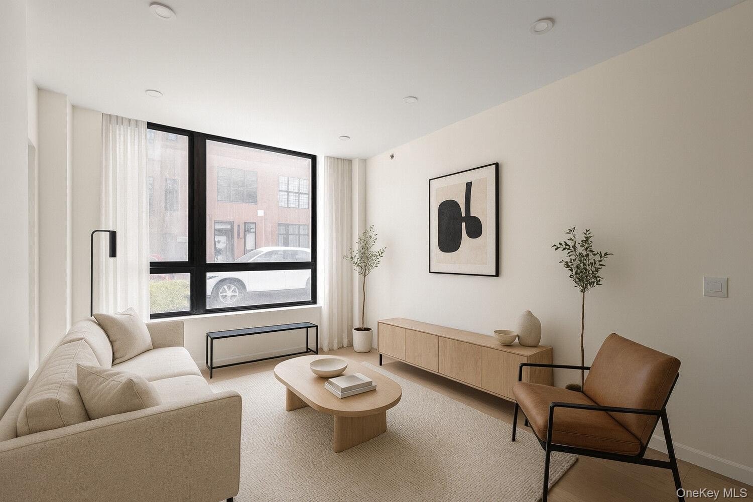 At Ora, It's a Vibe. Where Modern Minimalism Comes to Life in Prime Williamsburg. Enjoy your dynamic, tech-savvy lifestyle in this luminous 1-bedroom, 1.5-bathroom duplex condo with a deeded parking spot, cellar storage, and sleek finishes throughout. On the upper level, a bright living and dining area leads into a lovely kitchen. Natural light pours through oversized windows with bold black frames, while wide plank engineered wood floors add warm, organic tones. The kitchen boasts custom cabinetry, polished quartz countertops, and premium stainless-steel appliances from Cafe, Liebherr, and Bosch. The bedroom includes a large reach-in closet, and the bathroom has stylish ceramic tilework, modern fixtures, a Toto toilet, and a deep Kohler soaking tub. The lower level is completely open with a powder room and separate entrance, making it ideal as an office, gym, crafts space, and more. Finishing the home are a convenient in-unit Bosch washer and dryer and Spectrum internet pre-wiring. Ora is an exciting new boutique condominium bringing contemporary sophistication and elevated design to Brooklyn's most sought-after destination neighborhood. Imagined by Angelo Ng + Anthony Ng Architects Studio, Ora offers a collection of stunning homes and thoughtful amenities centered on themes of light, energy, and innovation. Ora's amenities include a shared backyard for serene outdoor relaxation, a live-in super to ensure efficient building management, and on-site parking spots available for purchase. The building is seconds from an endless choice of trendy restaurants, cafes, bars, and shops. Nearby greenspaces and live music venues include McCarren Park, Msgr. McGolrick Park, Cooper Park, Brooklyn Steel, Our Wicked Lady, and the Williamsburg Waterfront. Accessible subway lines include the 6 and L. Pets are welcome. The listing images represent various units in the building. NYS Department of Law File No. CD22-0211. Equal Housing Opportunity. THE COMPLETE OFFERING TERMS ARE IN AN OFFERING PLAN AVAILABLE FROM SPONSOR. FILE NO. CD24-0149. SPONSOR: 229 WITHERS STREET LLC, 75 ECKFORD STREET, BROOKLYN, NY 11222.