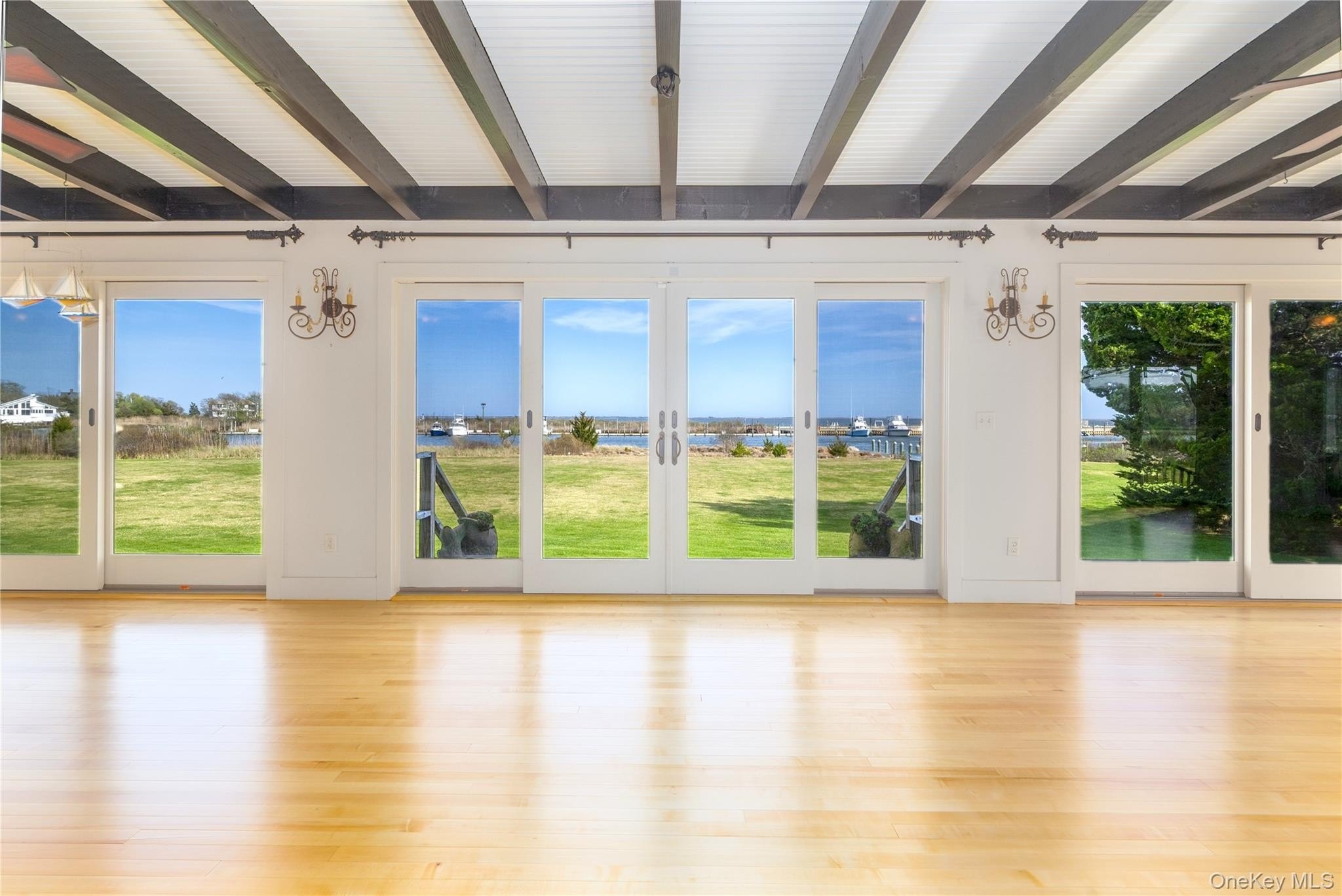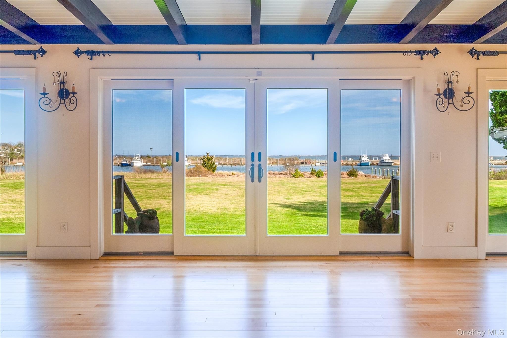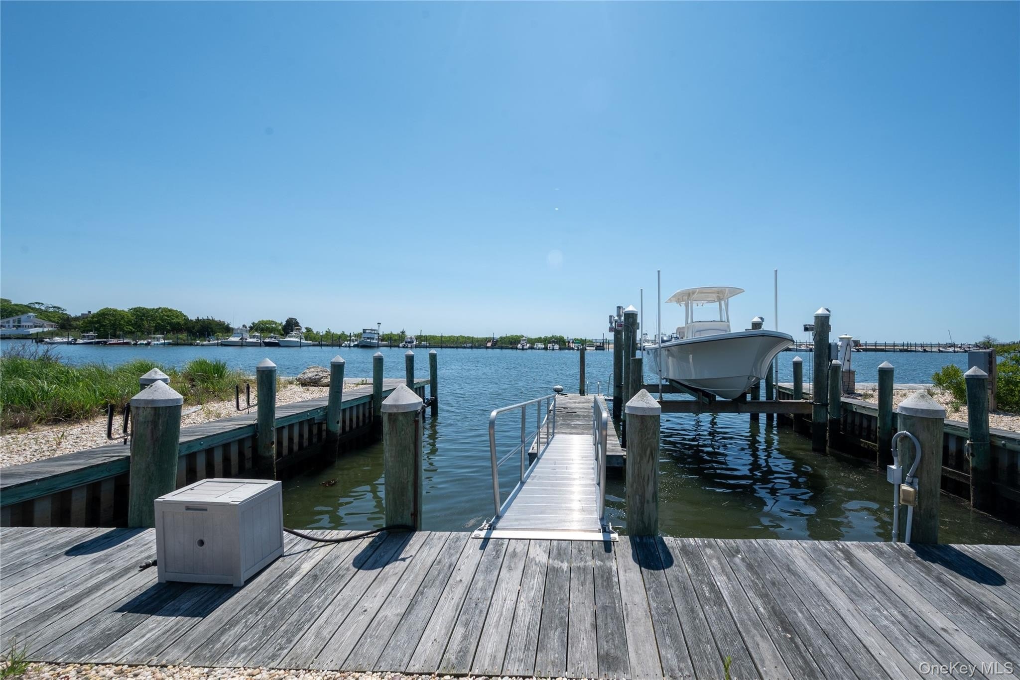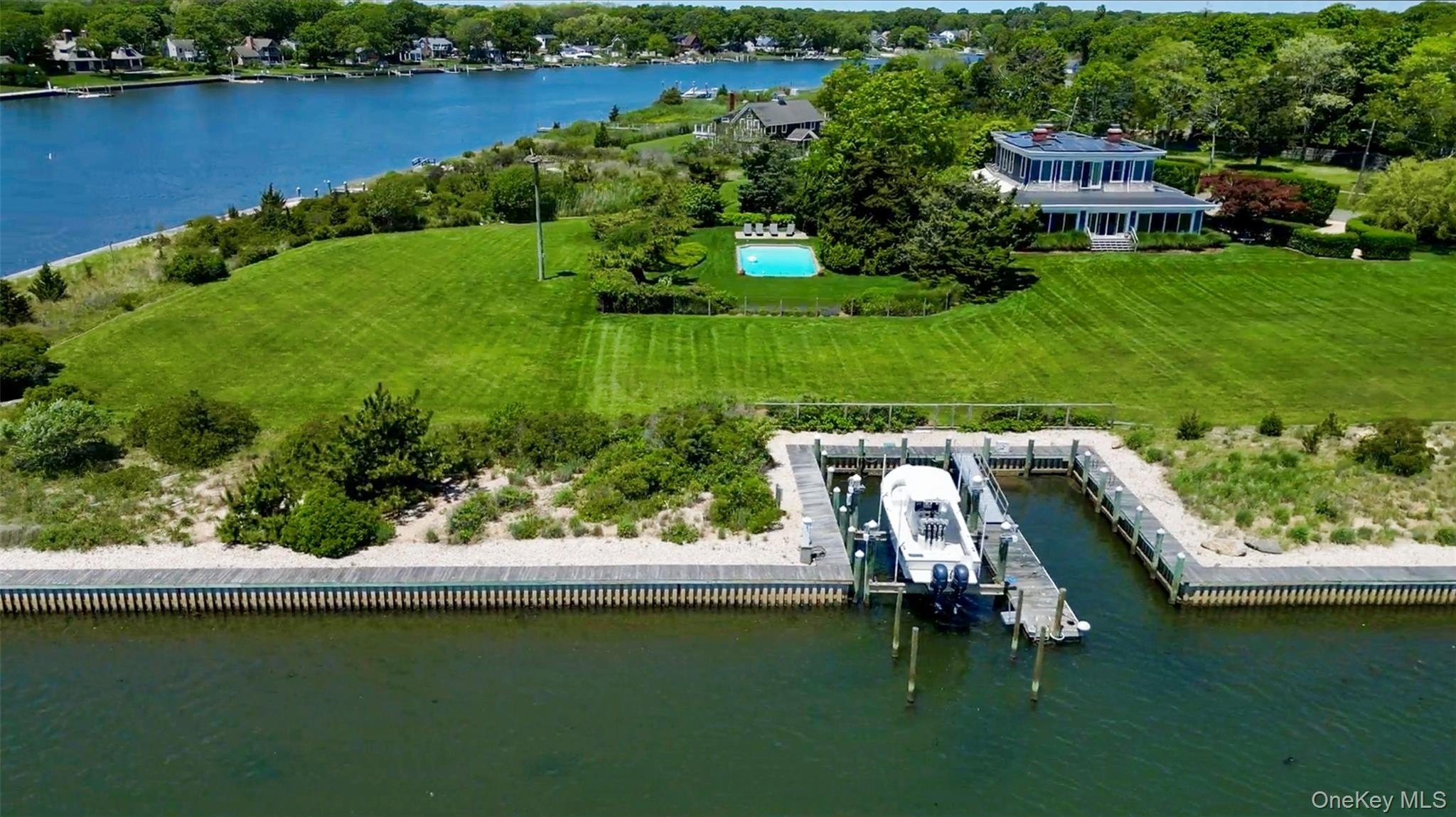 Welcome to this remarkable 5 bedroom, 3.5 bath custom residence offering refined elegance, luxurious comfort, and panoramic water views throughout. With 10 fireplaces and thoughtfully curated design elements, this home is truly one of a kind. The designer kitchen features high-end finishes, a spacious center island, and custom cabinetry-perfect for culinary creativity. Dining area with sliding glass doors opening to a generous west-facing deck, complete with two retractable awnings for year-round enjoyment. The living room, adorned with two Helmsley Palace polished brass chandeliers and two fireplaces, opens seamlessly into a grand great room, showcasing expansive views, and sliding glass doors that lead directly outside - perfect for entertaining or simply enjoying the waterfront setting. Upstairs, the primary suite features 2 fireplaces in the bedroom and southern facing sliding glass doors leading to panoramic views of the bay and Fire Island. The primary bath boasts a spacious walk-in shower, pedestal tub and an additional fireplace. The wrap second floor landing leads to a full bath and 2 additional bedrooms each with water views and fireplace. Step outside to your private retreat: a 20x40 in-ground pool, professionally landscaped grounds with irrigation covering two-thirds of the property, and a 1100 sq. ft. bulkhead with two boat basins. One features a 30,000 lb. Hi-Tide boat lift and floating dock; the other accommodates an additional vessel-just 2.5 nautical miles from Moriches Inlet. Sustainability meets sophistication with a 48-panel solar system, Sonnen battery backup, and a Hydro Action IA septic system (installed in 2023). Comfort is year-round with five ductless Daikin A/C-heat units, radiant heat in the great room, foyer, guest bath, kitchen, and primary bath, and a high-efficiency Buderus oil hot water heating system. A rare blend of privacy, luxury, and waterfront access-this home is a boater's dream.