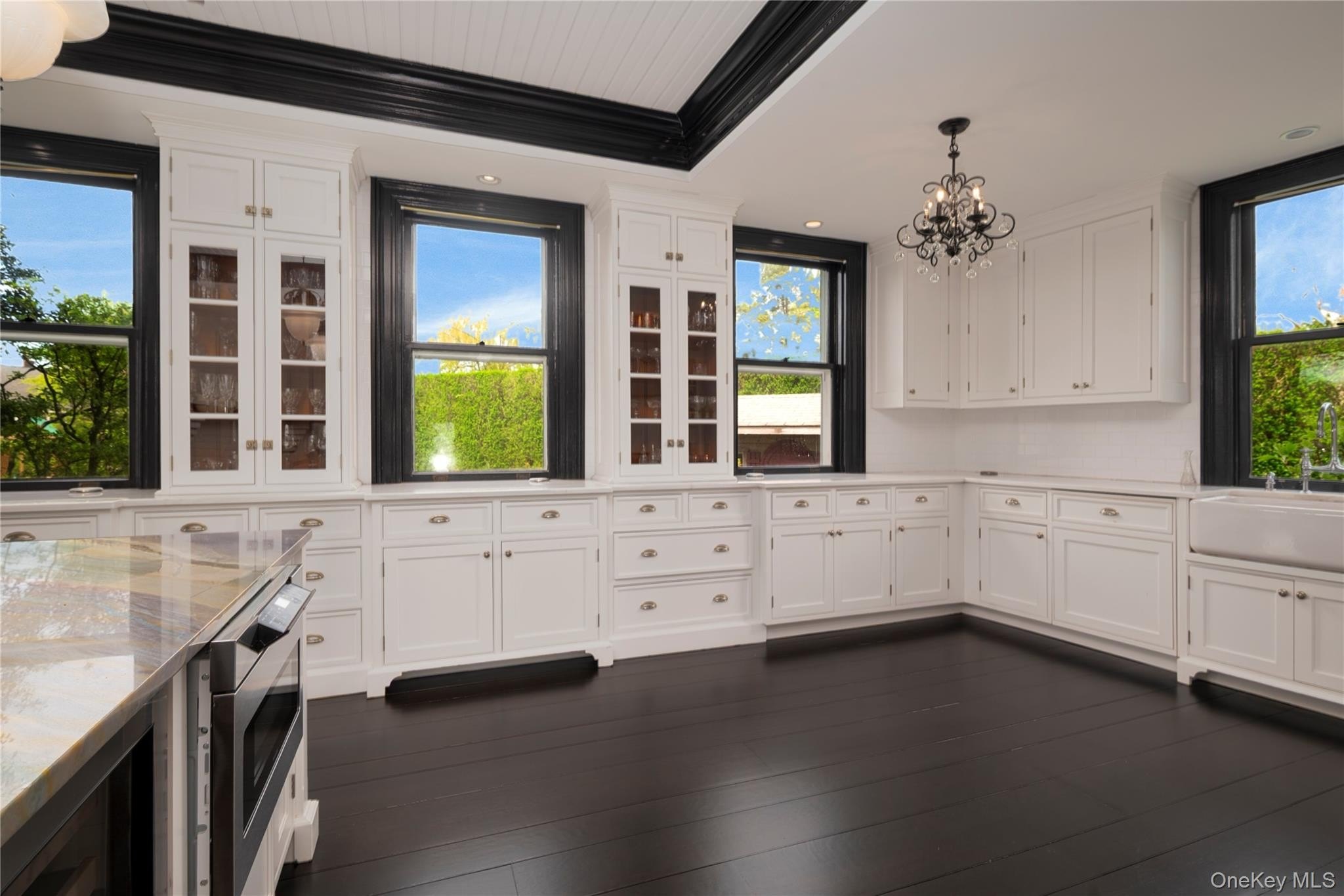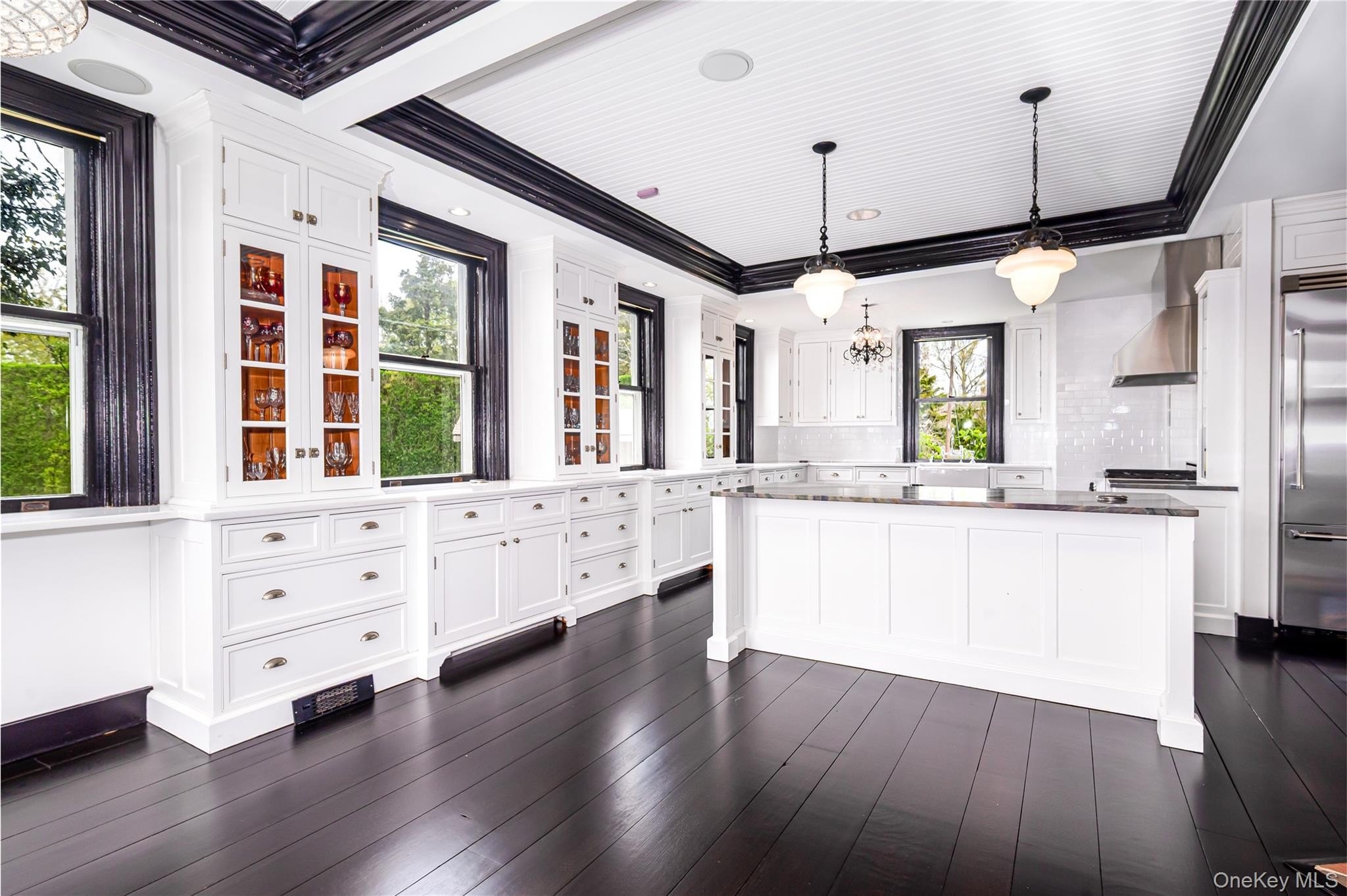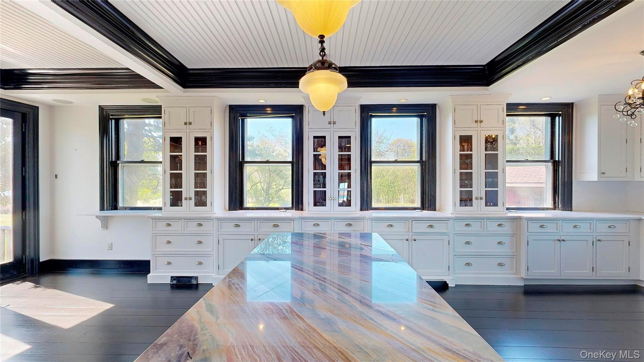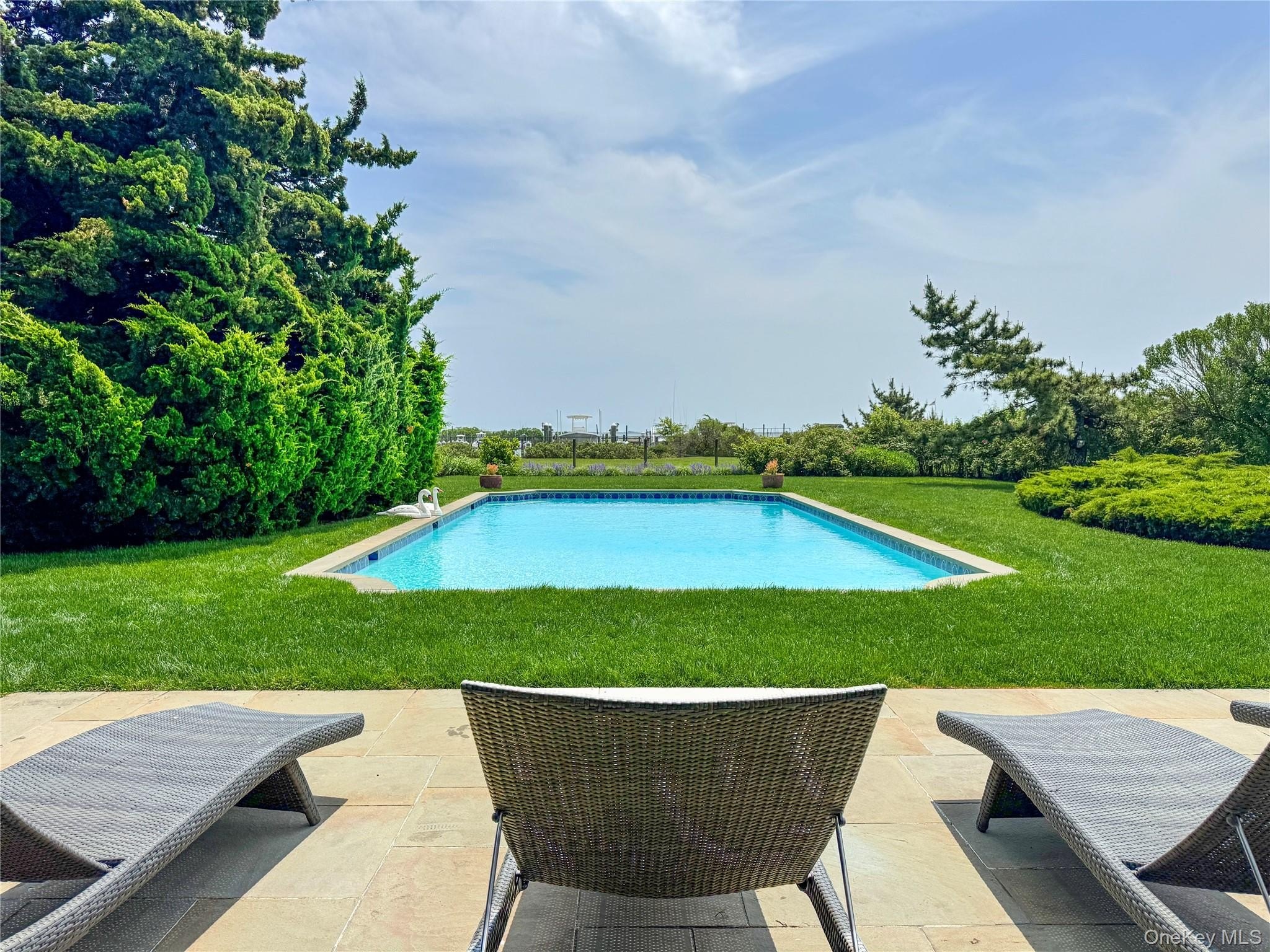 Welcome to this remarkable 5 bedroom, 3.5 bath custom residence offering refined elegance, luxurious comfort, and panoramic water views throughout. With 10 fireplaces and thoughtfully curated design elements, this home is truly one of a kind. The designer kitchen features high-end finishes, a spacious center island, and custom cabinetry-perfect for culinary creativity. Dining area with sliding glass doors opening to a generous west-facing deck, complete with two retractable awnings for year-round enjoyment. The living room, adorned with two Helmsley Palace polished brass chandeliers and two fireplaces, opens seamlessly into a grand great room, showcasing expansive views, and sliding glass doors that lead directly outside - perfect for entertaining or simply enjoying the waterfront setting. Upstairs, the primary suite features 2 fireplaces in the bedroom and southern facing sliding glass doors leading to panoramic views of the bay and Fire Island. The primary bath boasts a spacious walk-in shower, pedestal tub and an additional fireplace. The wrap second floor landing leads to a full bath and 2 additional bedrooms each with water views and fireplace. Step outside to your private retreat: a 20x40 in-ground pool, professionally landscaped grounds with irrigation covering two-thirds of the property, and a 1100 sq. ft. bulkhead with two boat basins. One features a 30,000 lb. Hi-Tide boat lift and floating dock; the other accommodates an additional vessel-just 2.5 nautical miles from Moriches Inlet. Sustainability meets sophistication with a 48-panel solar system, Sonnen battery backup, and a Hydro Action IA septic system (installed in 2023). Comfort is year-round with five ductless Daikin A/C-heat units, radiant heat in the great room, foyer, guest bath, kitchen, and primary bath, and a high-efficiency Buderus oil hot water heating system. A rare blend of privacy, luxury, and waterfront access-this home is a boater's dream.