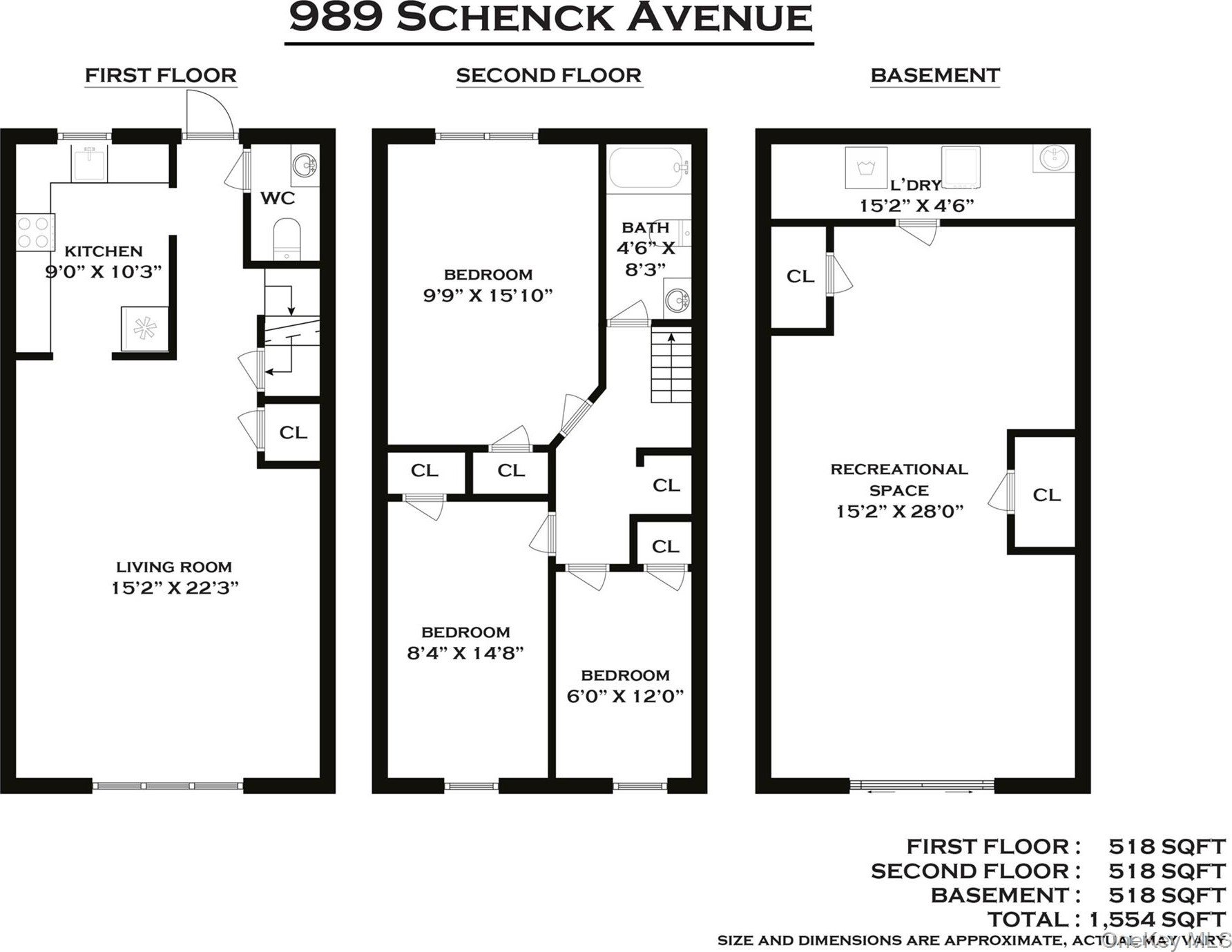 Welcome to 989 Schenck Avenue, a well-maintained brick single-family home offering comfortable and flexible living space across three levels. This residence features 3 bedrooms and 1.5 bathrooms with a practical layout ideal for everyday living and entertaining. The first floor offers a spacious living room, a functional kitchen, and a convenient half bathroom. The second floor provides three bedrooms and a full bathroom, creating comfortable private living quarters. The finished basement adds valuable bonus space with a large recreation area, laundry, and storage, perfect for a family room, home office, or gym. Additional highlights include a private driveway for convenient off-street parking. Ideally located near transportation, shopping, and neighborhood amenities, 989 Schenck Avenue presents an excellent opportunity for homeowners or investors seeking space, functionality, and long-term value.
