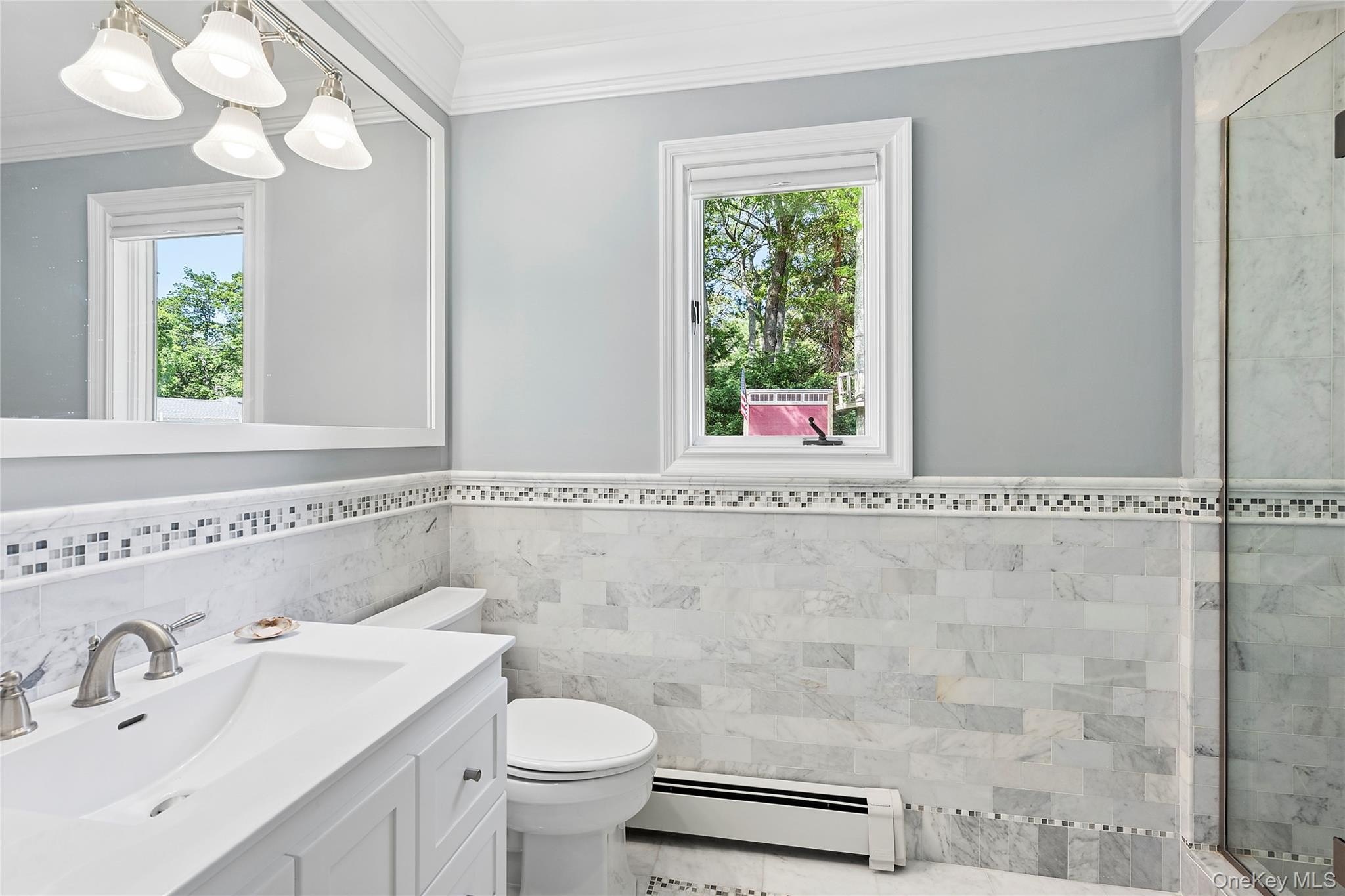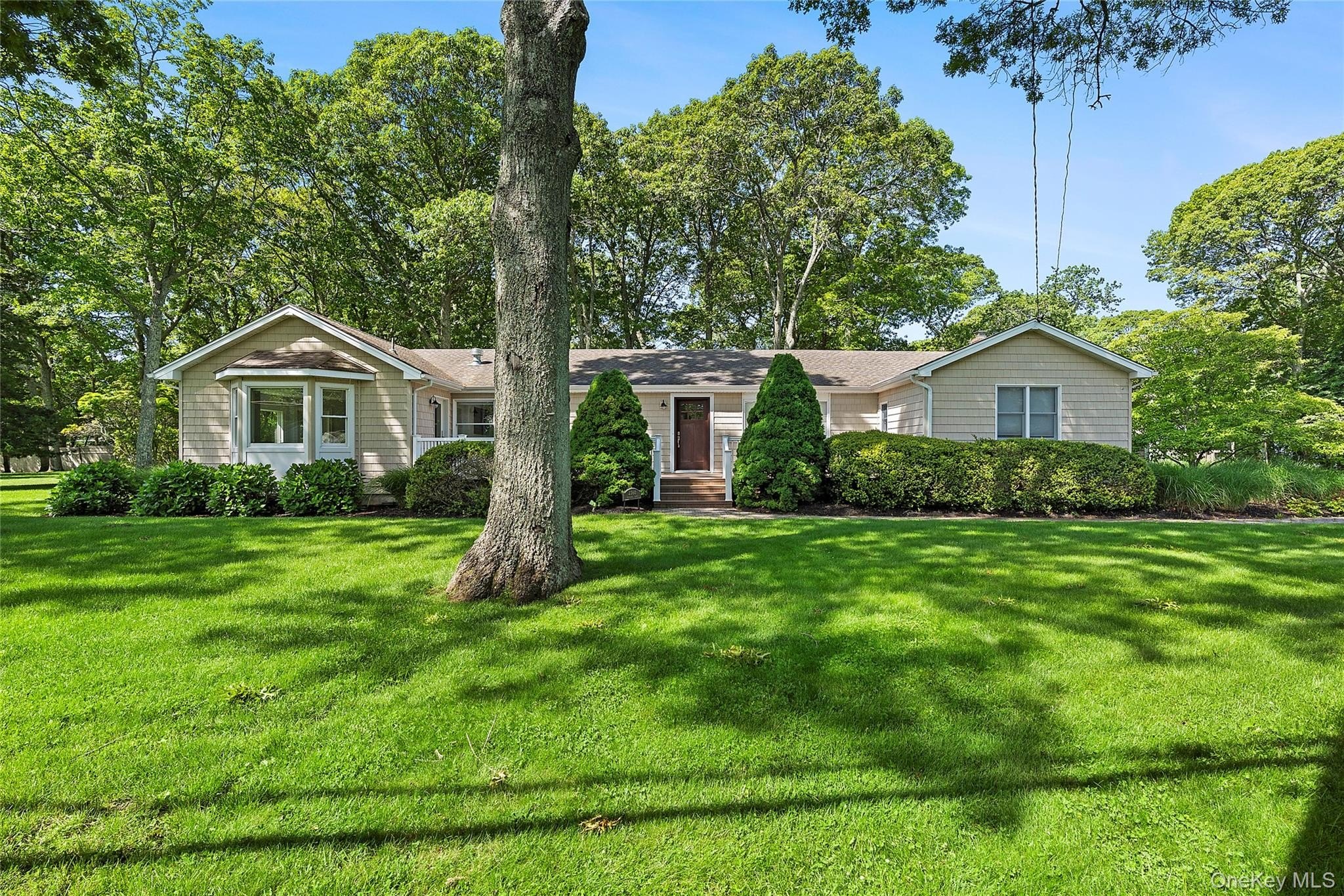 This stunning expanded ranch in the heart of Mattituck offers breathtaking views of Peconic Bay and is just a short distance from its gorgeous private deeded beach. Boasting over 2,600 square feet of living space, the home is perfectly situated on two-thirds of an acre. Upon entering, you'll find a welcoming front deck that leads into a bright foyer showcasing an open floor plan. This area is anchored by a double-sided, stacked white stone gas fireplace, creating a cozy yet stylish atmosphere. Comfortable lounge seating and a charming dining area are filled with natural light and feature beautiful wood floors. The custom kitchen is adorned with granite countertops, custom cabinetry, stainless steel appliances, and a center island with seating, making hosting and entertaining a breeze. An expansion has added a spacious great room designed with a vaulted ceiling and radiant flooring. The oversized focal point window captures the bold blue water views, while glass partition track sliding panels allow the main rooms to be opened up for larger gatherings or closed off for more intimate settings. The great room also features open stairs that lead to a finished lower level, which can serve as a media room or game room, complete with a new bathroom and additional storage space. A breezeway leads to the north wing of the home, beginning with a separate laundry area and flowing into the primary ensuite bedroom, which includes double closets and a spa-inspired bathroom. Down the hallway, three additional bedrooms share access to a newly renovated bathroom. Outdoor living is equally impressive with a beautifully crafted rear mahogany deck perfect for al fresco dining, a lower-level patio with a fire pit, and a spacious lawn ideal for relaxing with a hammock or designing a pool. The property also includes a separate outdoor remote workspace, an enclosed garden with irrigation for gardening enthusiasts, and an oversized driveway with a detached two-car garage. The vibrant hamlet is conveniently located near vineyards, farm stands, the renowned Love Lane for local shopping, and Veterans Beach.