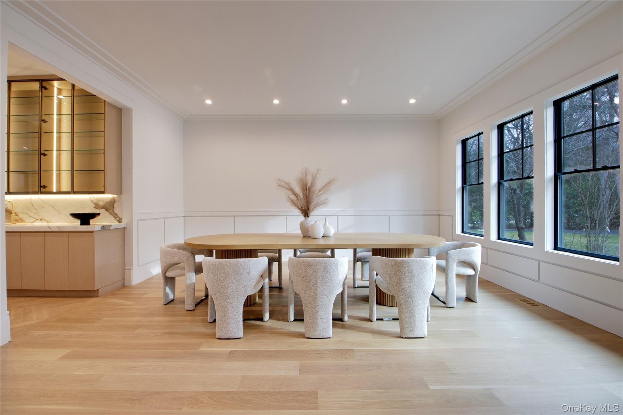 Set on two private acres in the heart of Brookville and located within the Locust Valley School District, 63 Fruitledge Road offers refined luxury living on Long Island's prestigious Gold Coast. This newly completed 6,880 Sq ft residence features a striking modern Colonial exterior with expansive windows and 10-foot ceilings throughout, creating an airy, light-filled atmosphere and large-scale rooms ideal for both everyday living and entertaining. A grand foyer introduces the home's elegant flow. The formal living room includes a fully equipped custom marble wet bar, while the open-concept den is framed by floor-to-ceiling windows overlooking the backyard and anchored by a marble fireplace.The custom kitchen opens seamlessly to the formal dining room and is complemented by thoughtful storage cabinetry, a large center island, Gaggenau gas appliances, double Bosch dishwashers, and a Sub-Zero refrigerator/freezer. Upstairs, all six bedrooms are en suite, offering privacy and comfort for family and guests alike. The extra-large primary suite serves as a private retreat, featuring dual outfitted custom walk-in closets and a luxurious marble bath with a steam shower, soaking tub, and two vanities. A spacious laundry room is conveniently located on this level. A well-designed service area beyond the kitchen includes a mudroom, a walk-in pantry, a full bath, and convenient access to the three-car garage, back staircase, and steps leading to the basement. The main level also features a generously sized bedroom, ideal for guests or extended stays. Radiant heated floors are featured in all bathrooms and the mudroom. The outdoor space is equally impressive, featuring a heated 40' x 20' Gunite saltwater pool, paver patio, and outdoor kitchen-perfect for entertaining or enjoying the serene, private grounds.