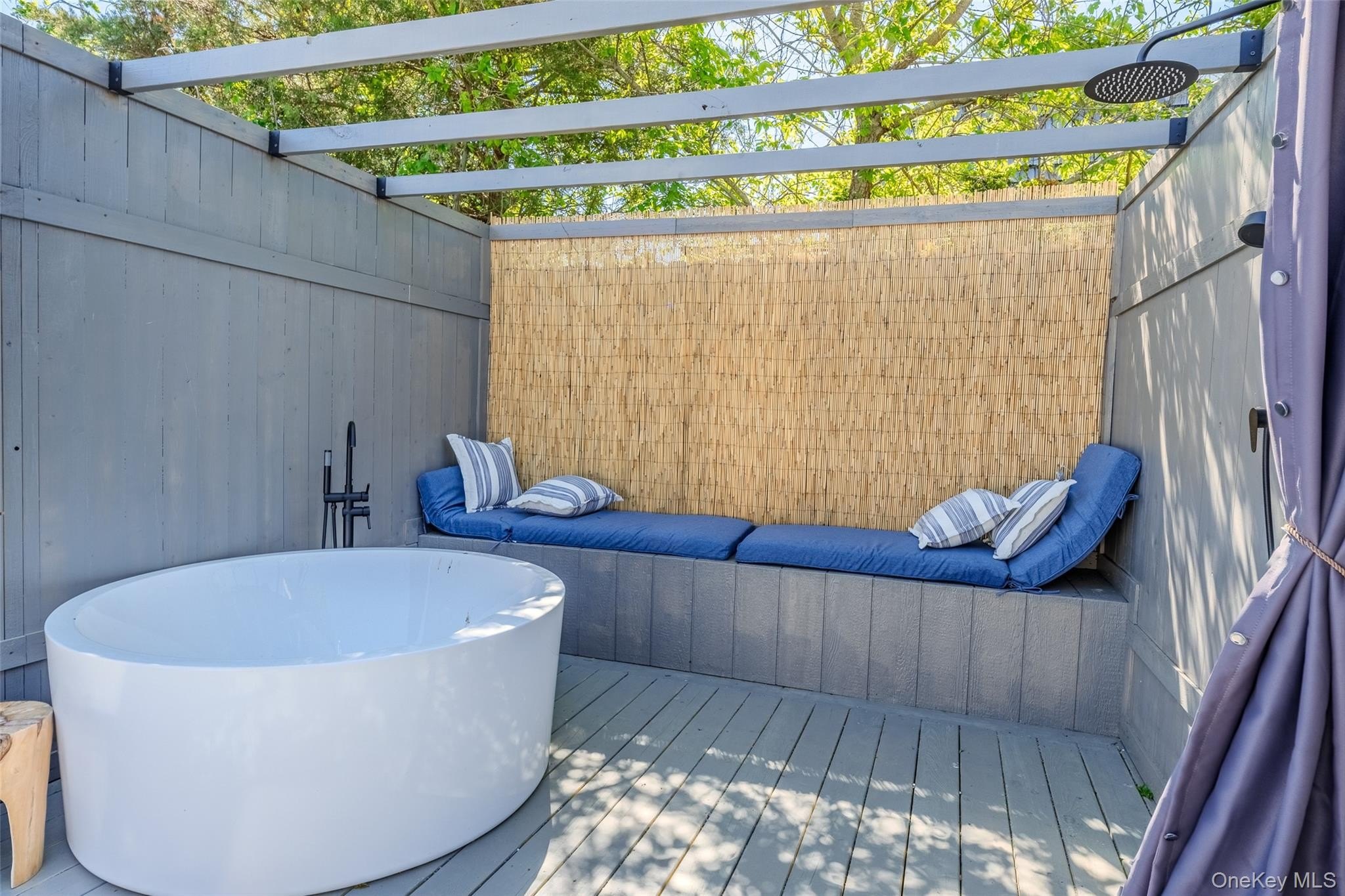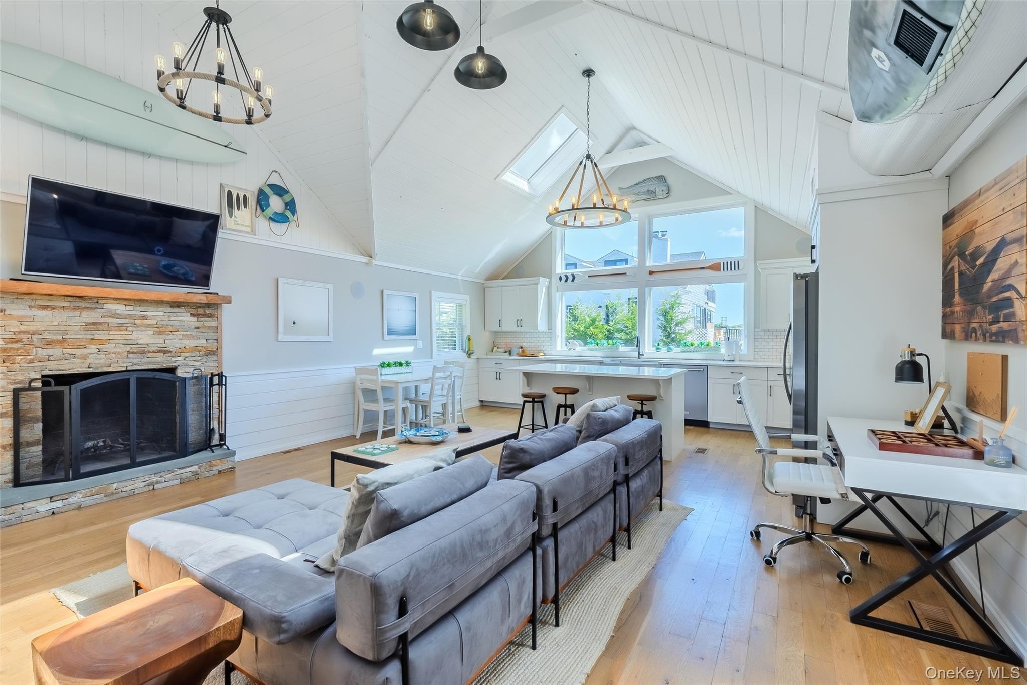 Experience the ultimate in coastal living with this extraordinary waterfront compound, privately nestled in the sought-after Holiday Beach community. This rare offering features a spacious main residence & a fully renovated guest cottage, perfectly designed for luxurious living and effortless entertaining.The main house welcomes you with a flowing layout that includes a dramatic great room, formal living room, elegant dining area, and a bright eat-in kitchen. The expansive primary bedroom boasts its own private terrace with stunning water views, while two additional bedrooms, a dedicated home office with its own bathroom, 2.5 more baths, and a full laundry room complete the interior. Step outside onto multiple levels of decks that offer panoramic views and unforgettable sunrises over the water. The guest cottage is a retreat in itself, beautifully renovated with vaulted ceilings and sophisticated finishes. It features a large ensuite primary bedroom with a generously sized walk-in closet, a versatile second bedroom/loft, and an open-concept family room with a cozy fireplace and dining area. The high-end eat-in kitchen is a chef's dream, outfitted with sleek stone countertops, custom Ciuffo cabinetry, and premium stainless steel appliances. The cottage also includes its own laundry area and private garage. Outdoor living is just as impressive, with a stylish cabana with shower, a cold plunge pool or tub, and expansive decking that invites relaxation and entertaining. A deepwater dock extends 150 feet and includes water and electric, offering easy access to the inlet and bay for boating enthusiasts. Additional features include ductless air conditioning, central vacuum system, and deeded beach rights to Holiday Beach. Located just minutes from the Hamptons, this exceptional property provides easy access to world-class shopping, dining, and pristine beaches, all while offering the privacy and tranquility of a waterfront sanctuary. Call today for a private showing.