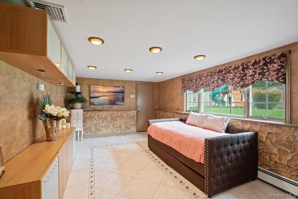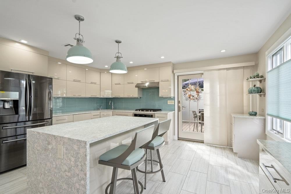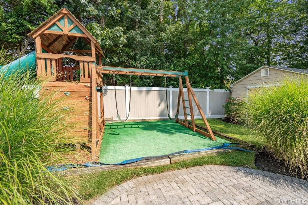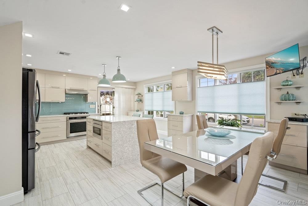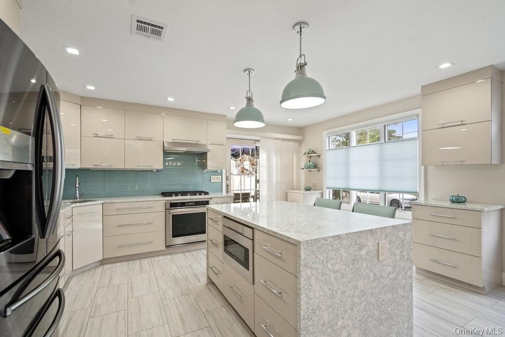 Discover exceptional living at 939 Manor Lane in Bay Shore, where thoughtful design meets impressive functionality. This beautifully cared-for 4-bedroom, 2.5-bath split-style residence is packed with high-end updates and spaces designed for both everyday comfort and memorable entertaining. At the center of the home is a show-stopping, oversized custom kitchen renovated in 2022. Featuring a striking Cambria quartz waterfall island with built-in microwave drawer, sleek European-style cabinetry with pantry pull-outs, stainless steel appliances, under-cabinet lighting, and durable porcelain plank tile flooring, this kitchen is as practical as it is beautiful. Radiant heat throughout the entire main level adds an extra layer of luxury and warmth. The open-concept layout continues into the living room, where vaulted ceilings enhance the sense of space and light. Sliding Andersen doors lead out to a Trex deck, creating an effortless transition to outdoor dining and entertaining. The lower level offers a comfortable den highlighted by a custom granite window ledge, along with a tiled bathroom. A dedicated laundry room with new washer and dryer provides additional storage and convenience. This home is equipped with a new three-zone heating system, a separate new hot water heater, 200-amp electrical service, generator connection box with transfer switch, ductless and central air conditioning, in-ground sprinkler system, security camera system, and waterproof luxury vinyl plank flooring. Outside, the private backyard delivers resort-style living with an 18' x 36' heated L-shaped in-ground pool featuring a new liner, new heater, and solar cover. Brick paver patios surround the pool, while a screened-in gazebo with electric offers shaded relaxation. A designated play area with a Wood Kingdom playset completes this impressive outdoor space. A rare opportunity to own a move-in-ready home with standout upgrades in Bay Shore-this property truly offers the best of indoor and outdoor living.