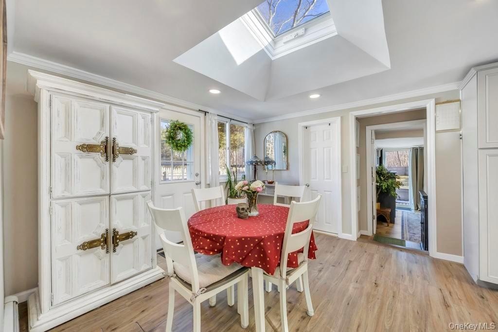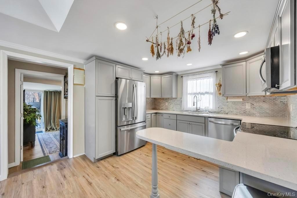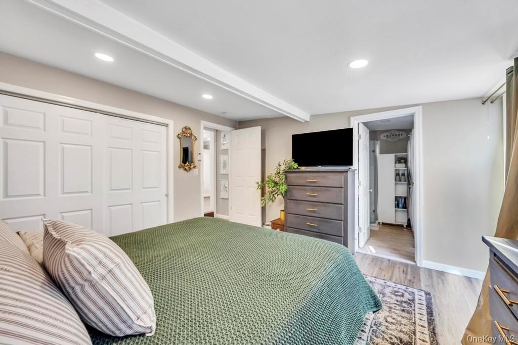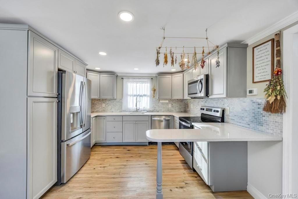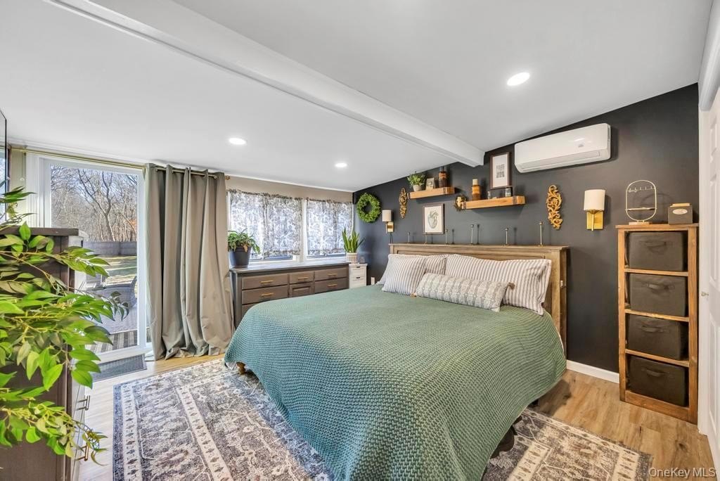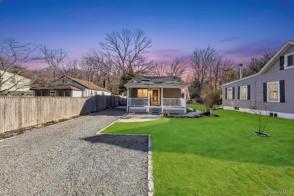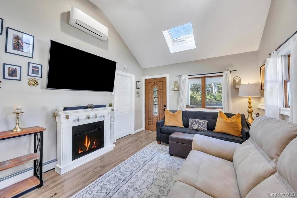 Welcome to 143 Wood Road in Centereach! This beautifully maintained and thoughtfully updated 2-bedroom, 2-bath ranch offers comfort, character, and versatile living space-perfectly complemented by a full basement and inviting outdoor areas. Step inside to a bright and cozy living room featuring vaulted ceilings, skylights and a modern mini-split system for efficient heating and cooling. The open layout flows seamlessly into the dining area and updated kitchen, which boasts granite countertops, stainless steel appliances, ample cabinetry, and recessed lighting-ideal for everyday living and entertaining. The spacious primary bedroom offers a peaceful retreat with stylish accent walls, generous closet space, a full bath en-suite and direct access to the backyard. The second bedroom is equally well-sized and filled with natural light. Both full bathrooms have been tastefully updated, featuring clean contemporary finishes. The full basement adds tremendous value and flexibility, offering plenty of room for storage, a home gym, recreation space, or future finishing possibilities. Outside, enjoy relaxing on the charming covered front porch or hosting gatherings in the fully fenced backyard, complete with a patio, lush lawn, and shed for additional storage. The property offers privacy and space while still being conveniently located near shopping, dining, parks, and major roadways. Move-in ready, full of charm, taxes under $4k and offering flexible living space-143 Wood Road is a wonderful place to call home!