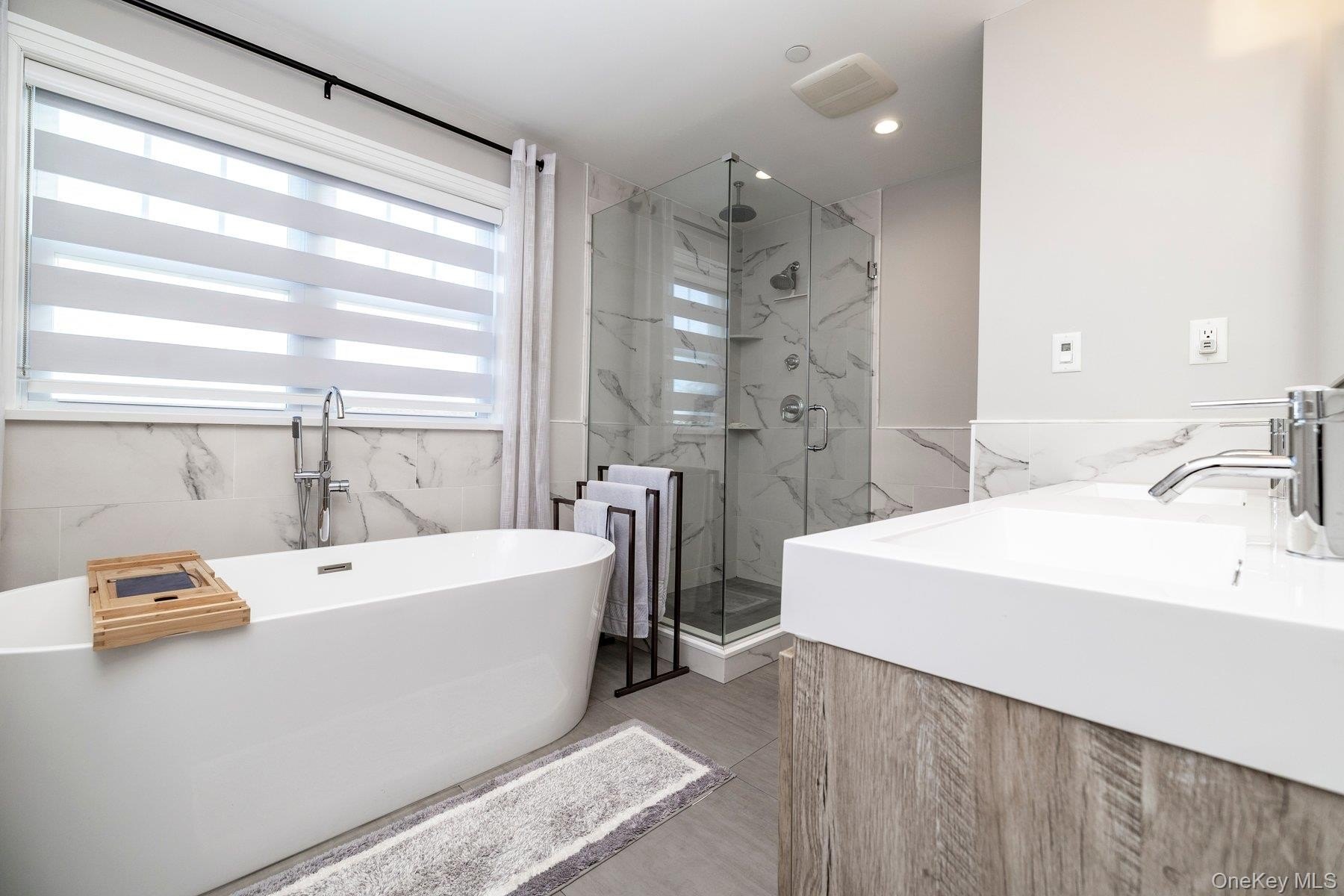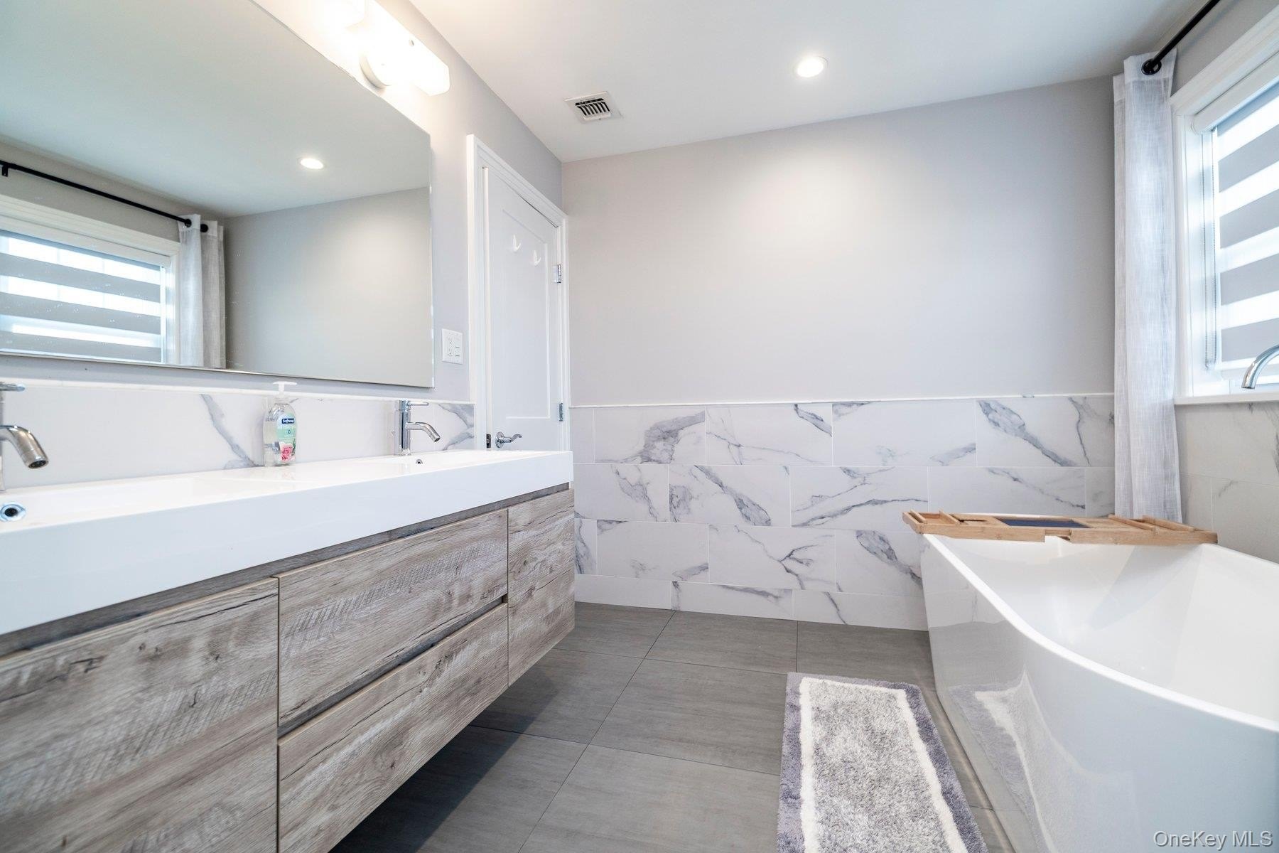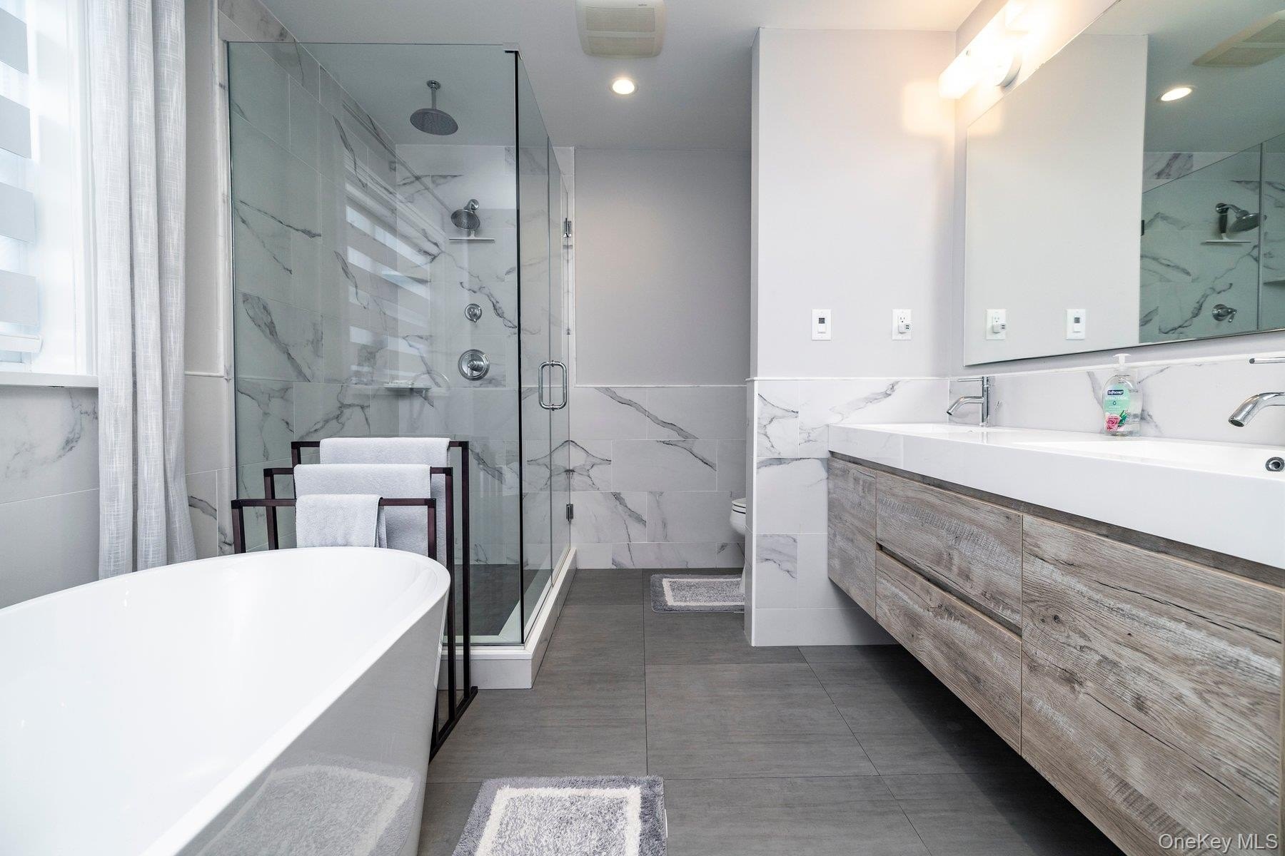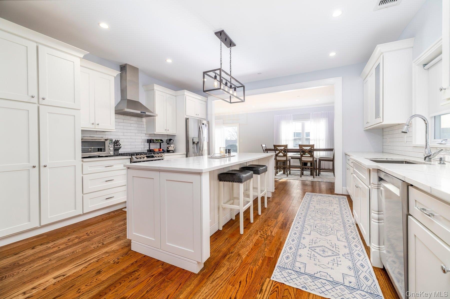 This stunning contemporary home, built in 2020, features an open floor plan with luxurious details throughout. The bright, sunny second level boasts 9-foot ceilings and features a beautiful living and dining room with crown molding, recessed lighting, and hardwood floors. The kitchen features quartz countertops and top-of-the-line, energy-efficient stainless steel appliances. Entertaining is effortless with the family room, a convenient half bath, and a large, low-maintenance Trex deck. The third level includes a spacious primary bedroom with a tray ceiling, as well as a luxurious ensuite bathroom with double sinks, a shower, a separate tub, and radiant-heated flooring. Additionally, there are three more bedrooms, a full bath, and a laundry room, providing ample space for everyone. Enjoy the beauty of the professionally landscaped backyard and side yard as you entertain on your spacious paved outdoor patio. The street-level first floor is FEMA-compliant and offers abundant storage, high ceilings, and a garage. This home also includes gas heating, Anderson windows, central air conditioning, and a central vacuum system. Don't miss the opportunity to make this house your home!