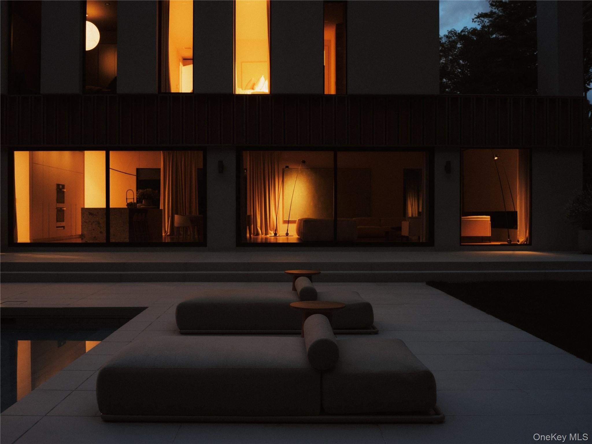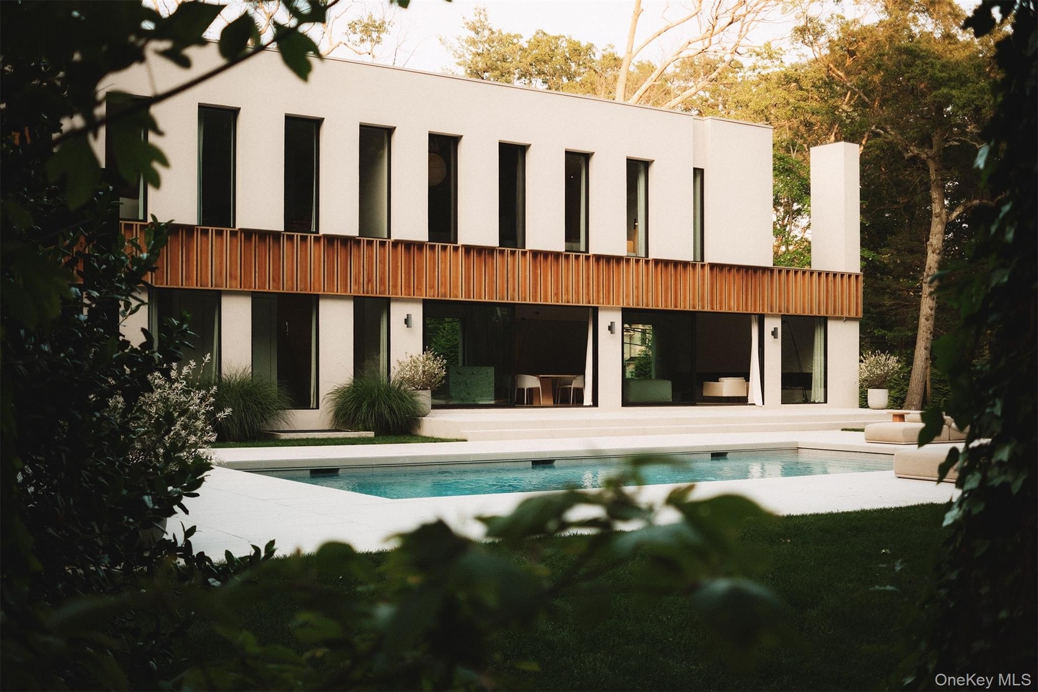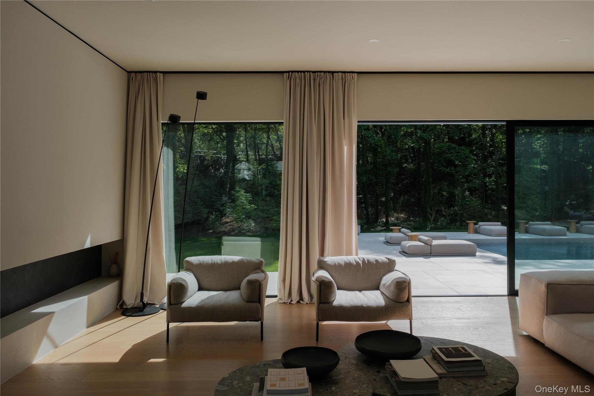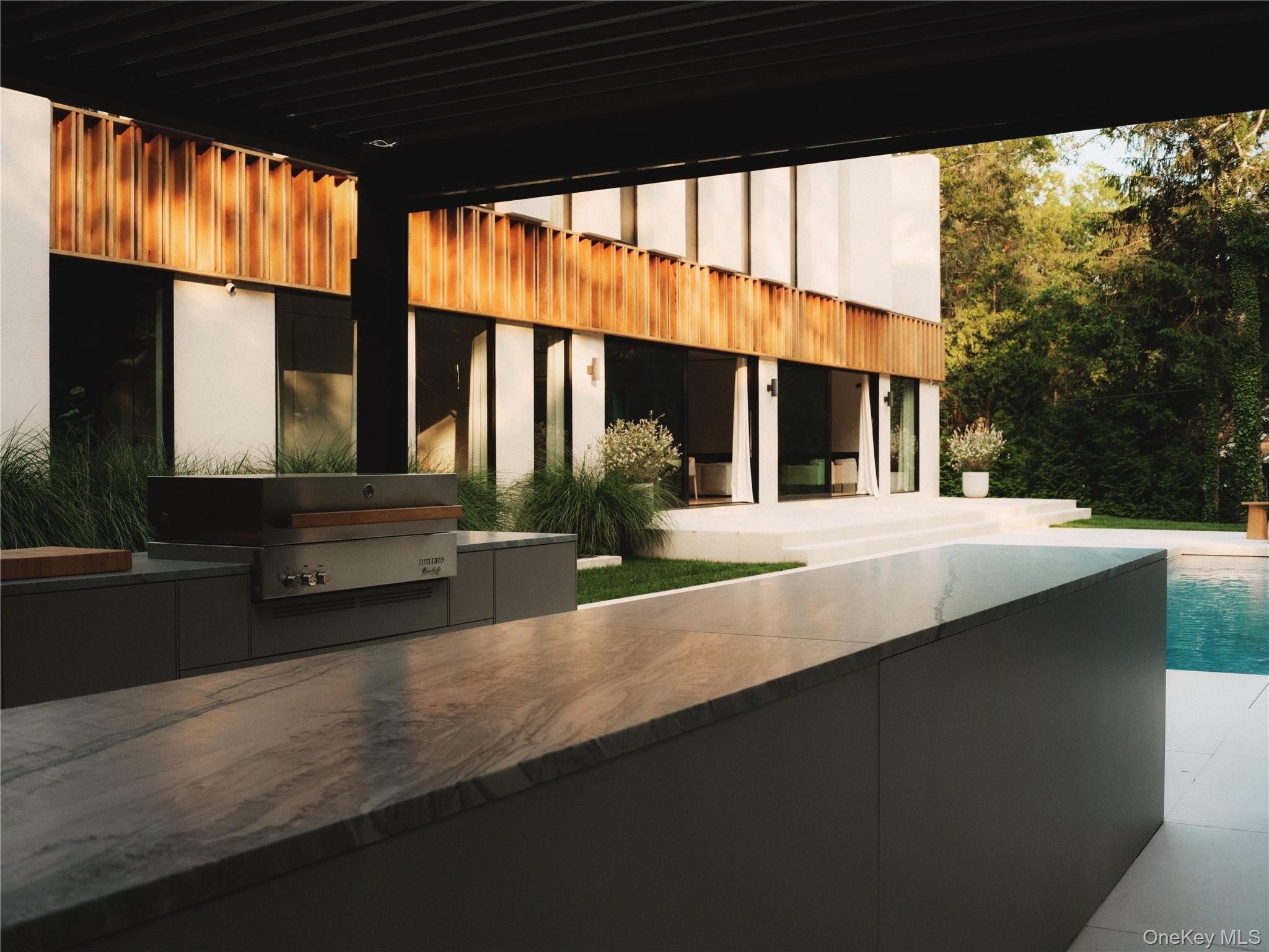 Discover a rare offering that blends modern luxury with spa-like serenity. This residence was designed to be both a retreat and a showpiece, combining high-end luxury finishes, seamless indoor-outdoor living, and tranquil natural surroundings. Walls of glass invite light and greenery into every room, creating a constant connection to nature. The open floor plan features a chef's kitchen with professional-grade appliances, custom cabinetry, and expansive island seating-ideal for both entertaining and everyday living. Living and dining spaces flow effortlessly to outdoor patios, where landscaped gardens and serene seating areas extend the home's livable footprint. The primary suite is a true sanctuary with floor-to-ceiling windows, spa-inspired bath with soaking tub and dual sided rainfall shower, with floor to ceiling windows overlooking lush grounds. Additional bedrooms offer the same level of comfort and style, ideal for guests or family. Every bathroom has been designed with European natural stone & micro-cement, luxury designer fixtures, and a focus on wellness and relaxation. Outdoors, curated landscaping and multiple gathering spaces set the stage for morning coffee, evening cocktails, or hosting under the stars. Enjoy a dip in the in-ground gunite, heated, saltwater pool surrounded by approximately 4,000 sq ft of patio space. Every corner of this property has been crafted to evoke calm, beauty, and a lifestyle of understated luxury. This is not just a home-it's an escape, ready to be lived in and loved every day.