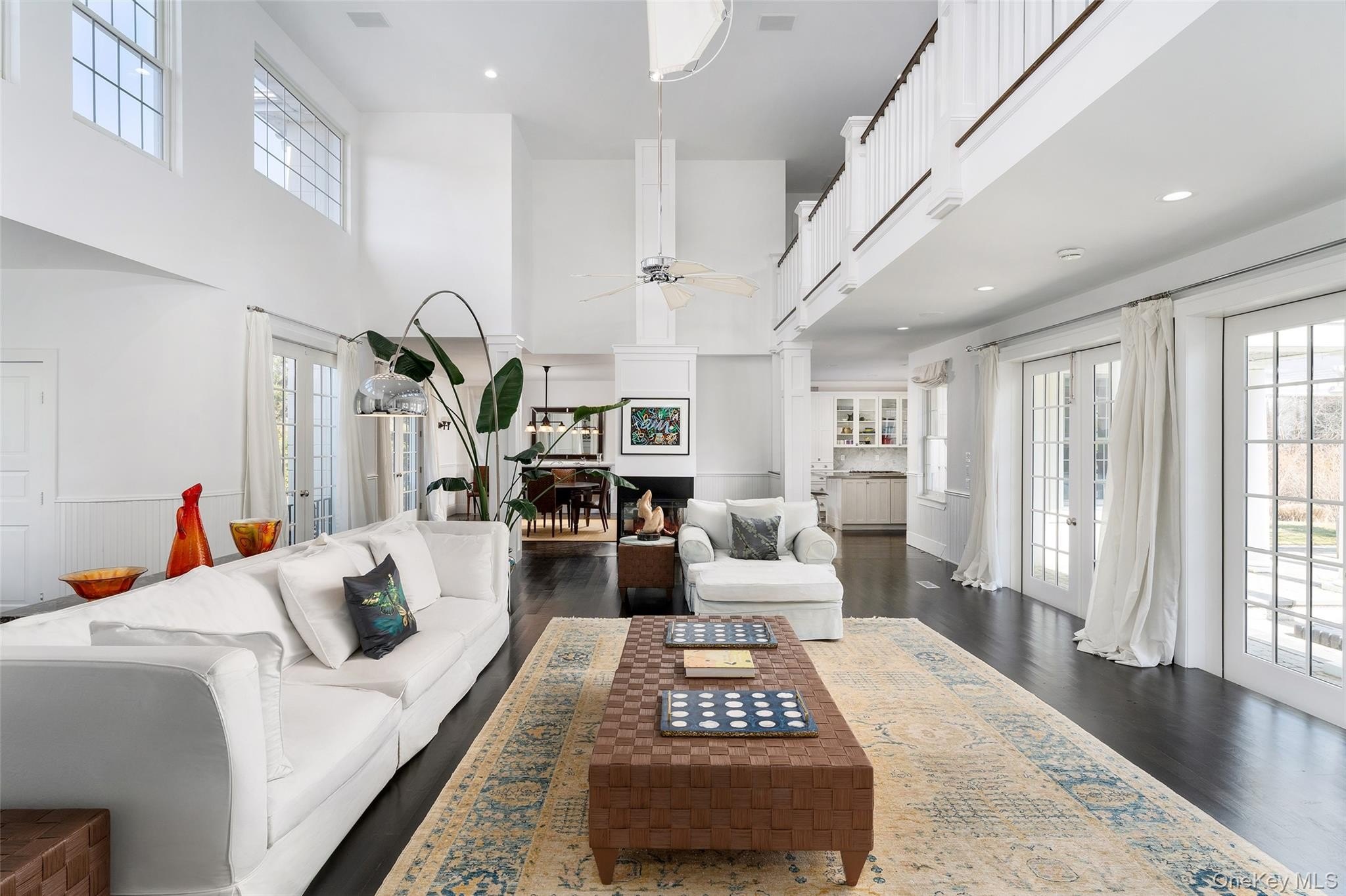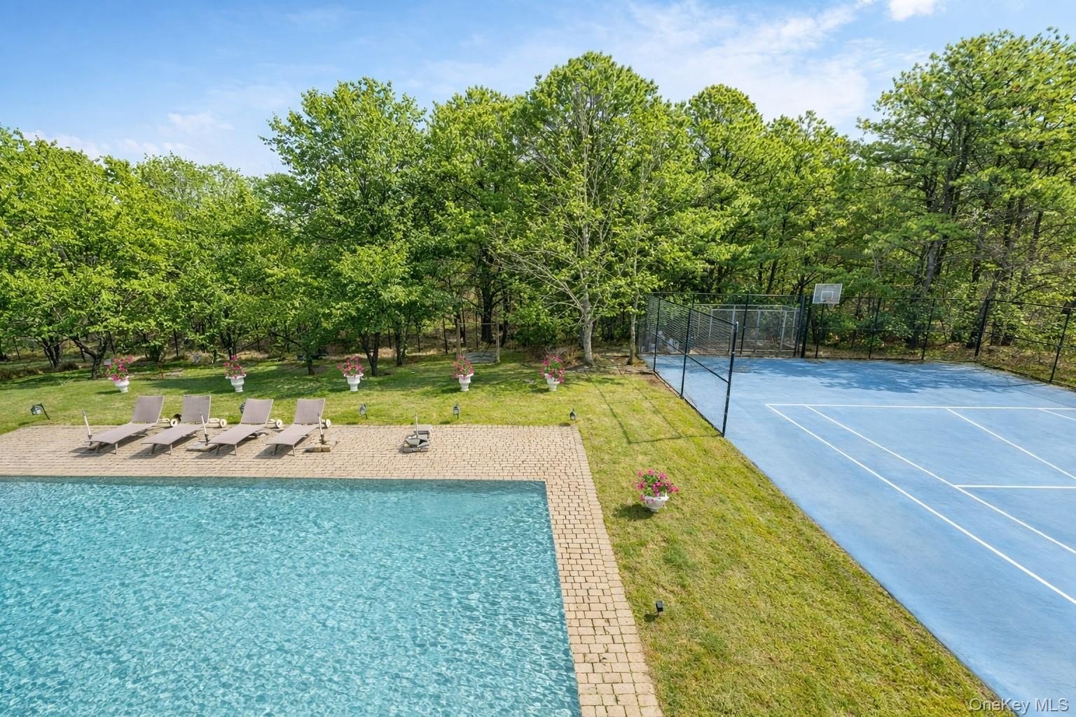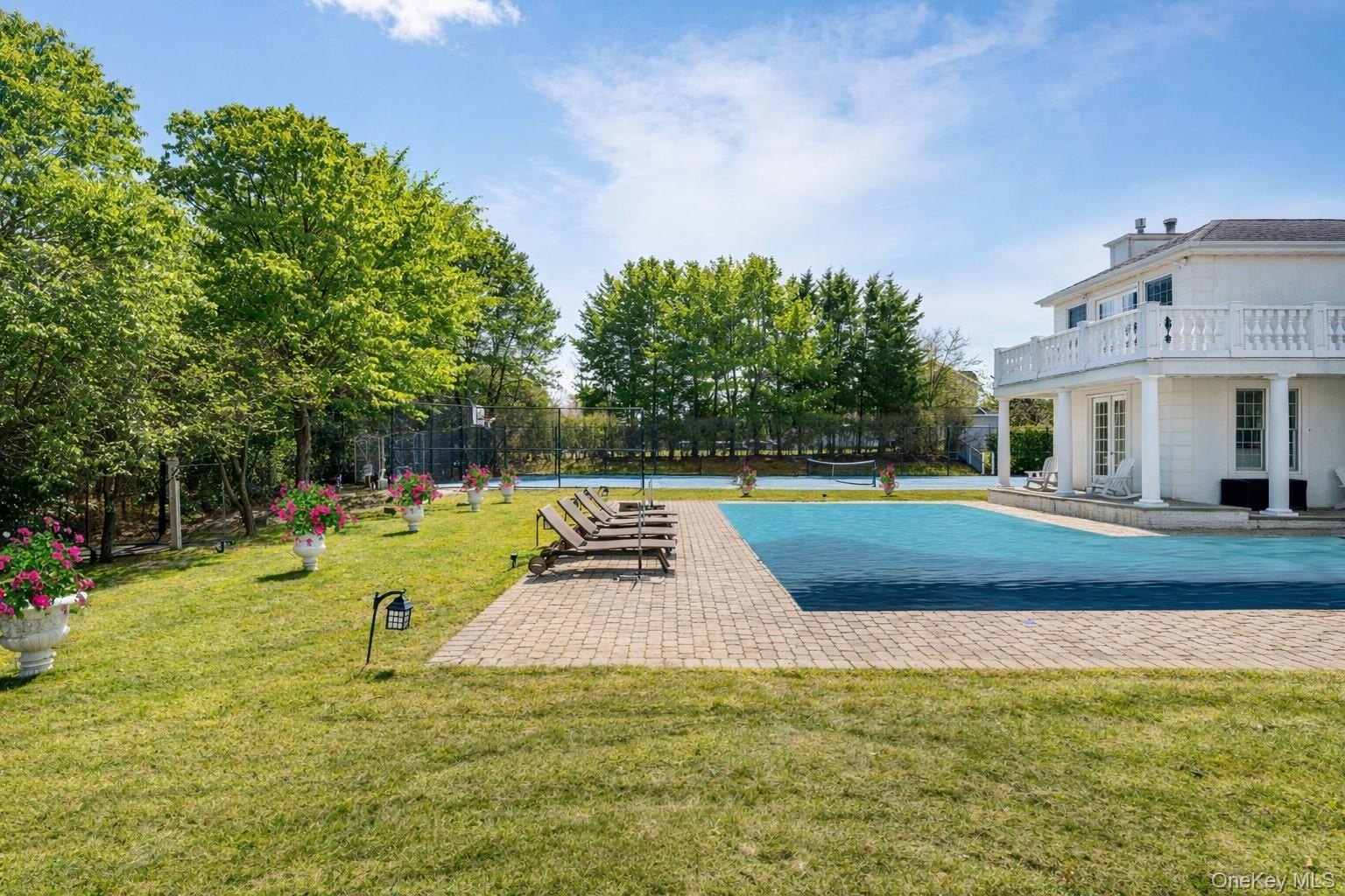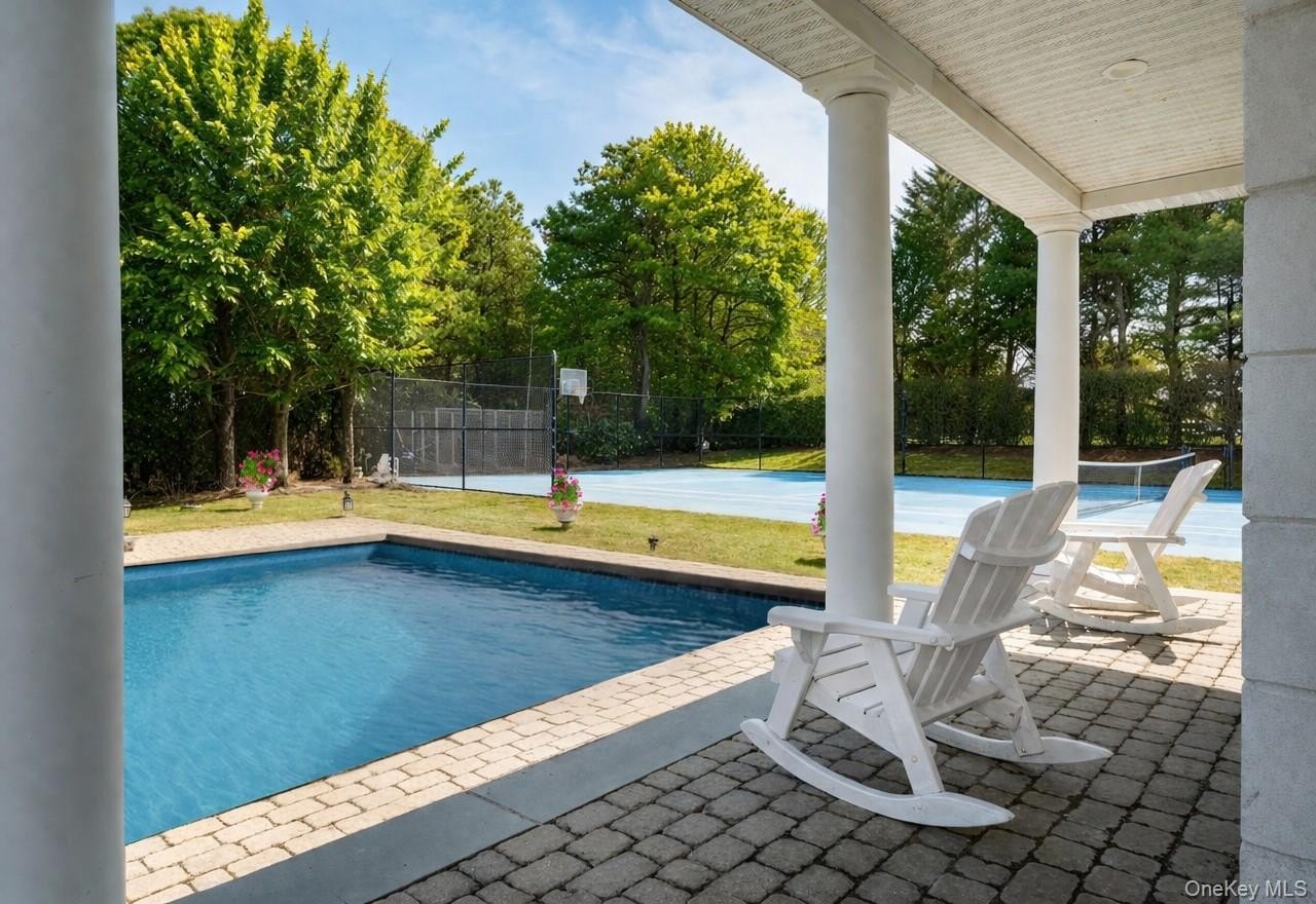 Welcome to 3 Polo Grounds Lane, a beautifully appointed, impeccably maintained, move in condition, and manicured grounds Mediterranean-inspired estate set on a full acre in the heart of East Quogue. Located in a cul de sac private neighborhood designed and constructed in the highest standards by a builder as his summer Hamptons retreat. The home is surrounded on two sides with protected land where no one can build. It's offered for year around living or effortless Hamptons vacations. From the moment you enter the gracious open foyer, the home unfolds into an expansive, light-filled great living room with soaring 20-foot ceilings and a dramatic wall of French doors to create a seamless connection to the outdoors that invites you to the oversized heated pool, expansive paved terraces surrounded by peace, and lush mature landscaping, and full-size all-weather tennis court. A striking double-sided gas fireplace anchors both the open foyer and living room as well as the formal dining area, setting an inviting yet sophisticated tone for intimate gatherings and grand scale entertaining alike. Formal dining room is a generously proportioned room with a fireplace and French doors that overlooks the garden and has great flow into the living room and kitchen. The state-of-the-art bright chefs eat-in kitchen is a true showpiece, thoughtfully designed with a large center island, marble countertops, backsplash, custom inset cabinetry, and a generous built-in pantry. A distinctive Italian painted sink adds a unique design element, while premium appliances from Viking, Thermador, and Miele deliver a chef-caliber experience. French doors open directly to al fresco dining, creating effortless indoor-outdoor flow. The first level features a stylish junior suite with a beautifully appointed full bath and direct French door access to the pool and outdoor entertaining areas. An additional room on this level-complete with a deep built-in closet and full bath-offers exceptional flexibility as a private office, den, or lounge. The upstairs is a dramatic bright, catwalk that overlooks the main living space below, enhancing the home's architectural openness. The private primary generously sized suite occupies its own wing and serves as a serene retreat, featuring a gas fireplace and a private deck with sweeping views of the pool, tennis court, and manicured grounds. Two spacious walk-in closets with custom built-ins and a light-filled bath with soaking tub, double vanity, and oversized shower complete the suite. Two additional guest bedrooms provide comfort and privacy-one with its own balcony-while sharing a well-appointed full bath. Juliet balconies throughout the home further enhance its Mediterranean character, adding elegance, charm, and an airy sense of openness. The expansive finished lower level offers a large recreation area, with a spacious lounge, gym area, laundry room, cedar closet, and abundant storage. Outdoors, the property lives like a private resort. It is bathed in sunlight all day for your Hamptons enjoyment. It features an expansive front and rear lawn that unfolds into a private oasis. Relax beside the oversized heated pool, beautifully illuminated for evening enjoyment, or entertain beneath the mature vine pergola. A private all-weather tennis court offers recreation at your doorstep, while specimen trees, perennial gardens, vegetable garden, lush plantings, and curated landscape lighting create a setting of complete privacy and year-round beauty. This smart home is designed for modern living, allowing you to control entrance to home, heating, air conditioning, lighting, alarm, cameras, oil, pool temperature, remotely. A separate oversized two-car garage with additional second-floor storage completes this exceptional offering. Ideally located just minutes from the Hamptons' renowned ocean beaches, highway, as well as nearby village shops and restaurants, 3 Polo Grounds is a must-see!
