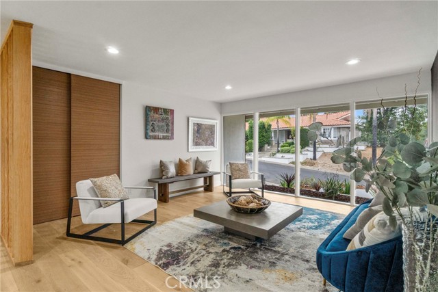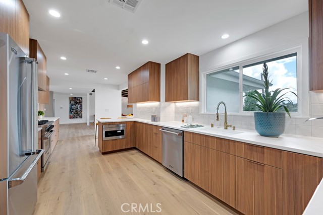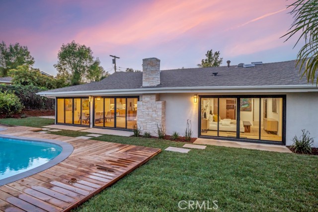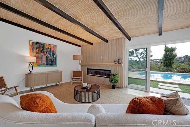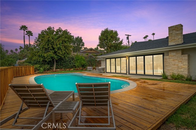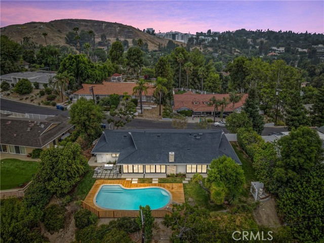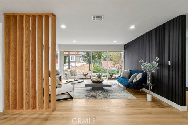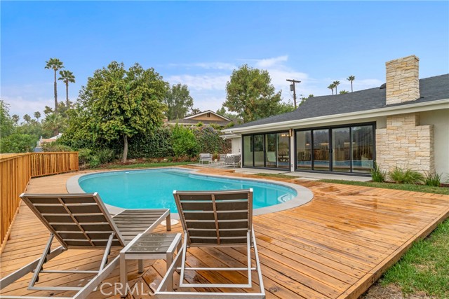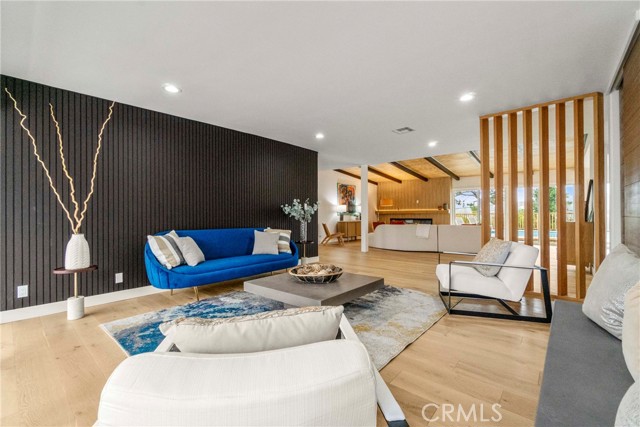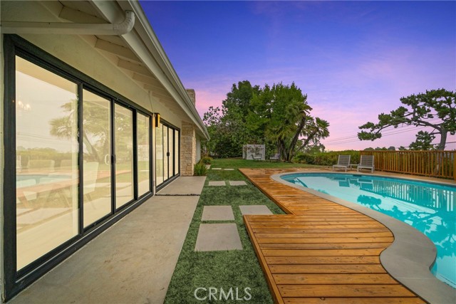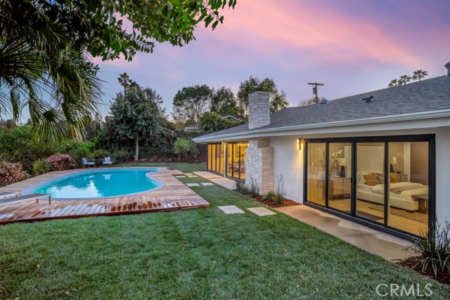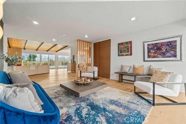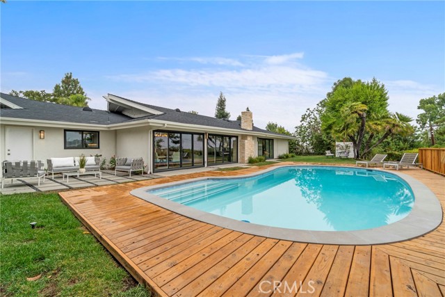 Welcome to your serene, single-story, mid-century modern dream home, completely reimagined and remodeled to perfection. Located in the hills of the coveted Vista De Oro neighborhood. This stunning view home blends natural wood elements, an open floor plan, abundant natural light, and modern amenities for the ultimate in comfort and style.Step inside and be captivated by the warmth of white oak flooring and thoughtfully designed natural accents throughout. At the heart of the home is a chef’s dream, gourmet kitchen featuring custom cabinetry, pristine white quartz countertops, and imported “Zellige Fez” backsplash. Equipped with top-of-the-line Viking stainless steel appliances, including a refrigerator, dishwasher, and range. The spacious open floor plan is complemented by high vaulted ceilings, creating a light and airy ambiance. This exquisite home features a large living room area with a natural wood design 2replace, dining room perfect for hosting and entertaining, and large family room with a glass wall overlooking the outdoors. This Superb home features five bedrooms and three luxurious bathrooms, including a primary suite designed to be a tranquil retreat. The primary suite offers a walk-in closet and an opulent bathroom featuring a large spa-like shower with imported “Porcelanosa” tile from Spain and a freestanding soaking tub.Designed for relaxation and family entertainment, the lush backyard includes a grassy lawn, a large deck surrounding a sparkling pool with sweeping views. It’s the perfect setting for hosting gatherings, enjoying gourmet al fresco dinners, or simply unwinding in your private oasis.Conveniently located near upscale shopping, fine dining, and entertainment, this home strikes the perfect balance between modern luxury and everyday convenience.