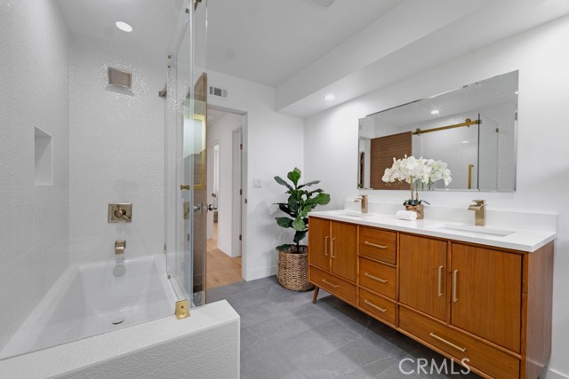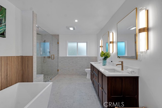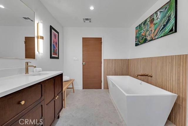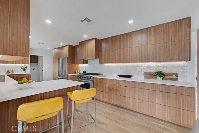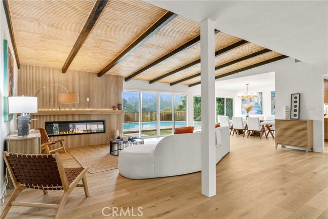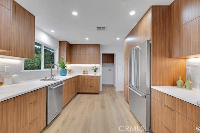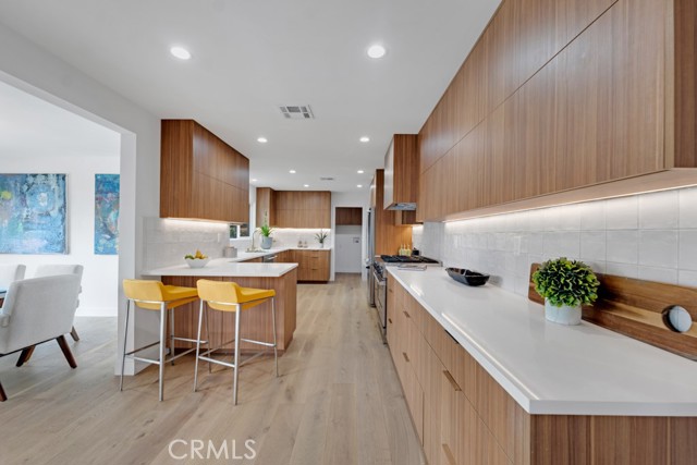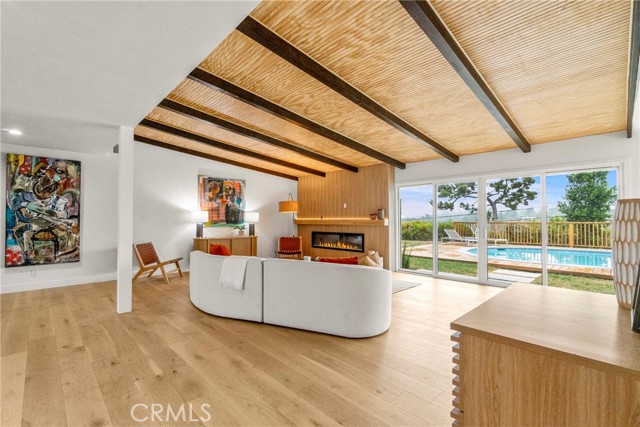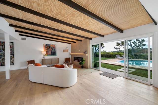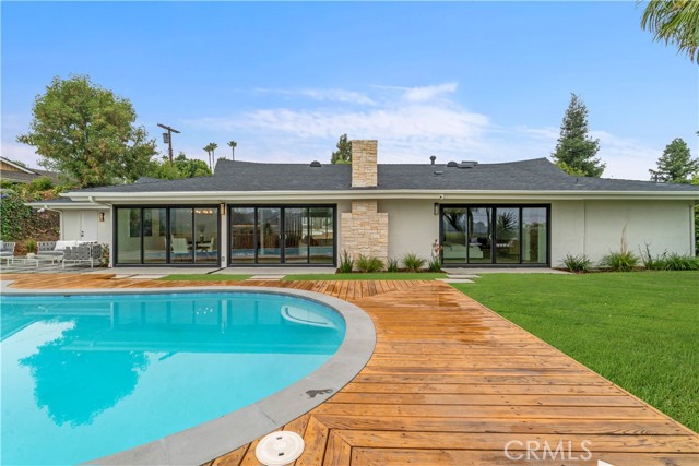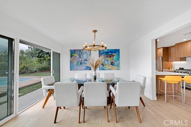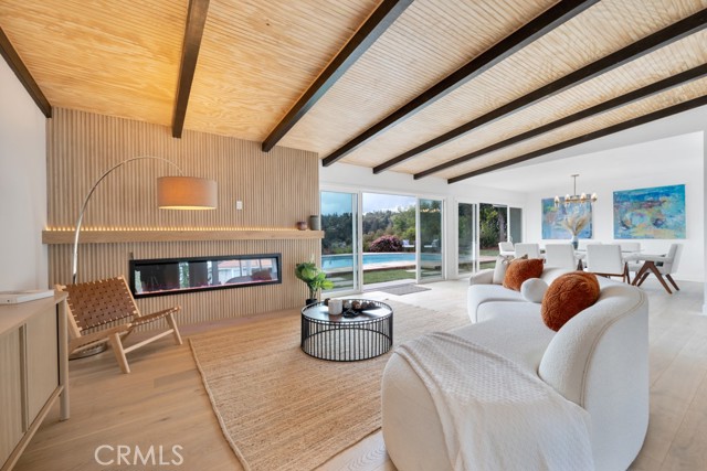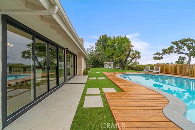 Welcome to your serene, single-story, mid-century modern dream home, completely reimagined and remodeled to perfection. Located in the hills of the coveted Vista De Oro neighborhood. This stunning view home blends natural wood elements, an open floor plan, abundant natural light, and modern amenities for the ultimate in comfort and style.Step inside and be captivated by the warmth of white oak flooring and thoughtfully designed natural accents throughout. At the heart of the home is a chef’s dream, gourmet kitchen featuring custom cabinetry, pristine white quartz countertops, and imported “Zellige Fez” backsplash. Equipped with top-of-the-line Viking stainless steel appliances, including a refrigerator, dishwasher, and range. The spacious open floor plan is complemented by high vaulted ceilings, creating a light and airy ambiance. This exquisite home features a large living room area with a natural wood design 2replace, dining room perfect for hosting and entertaining, and large family room with a glass wall overlooking the outdoors. This Superb home features five bedrooms and three luxurious bathrooms, including a primary suite designed to be a tranquil retreat. The primary suite offers a walk-in closet and an opulent bathroom featuring a large spa-like shower with imported “Porcelanosa” tile from Spain and a freestanding soaking tub.Designed for relaxation and family entertainment, the lush backyard includes a grassy lawn, a large deck surrounding a sparkling pool with sweeping views. It’s the perfect setting for hosting gatherings, enjoying gourmet al fresco dinners, or simply unwinding in your private oasis.Conveniently located near upscale shopping, fine dining, and entertainment, this home strikes the perfect balance between modern luxury and everyday convenience.