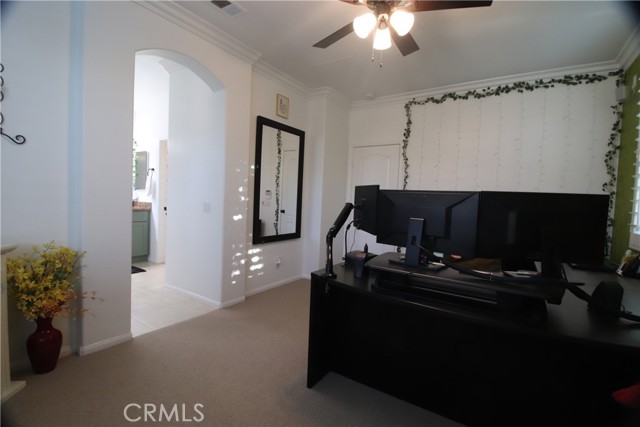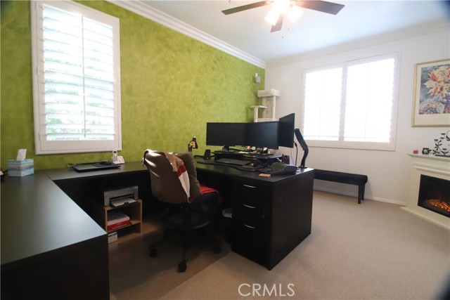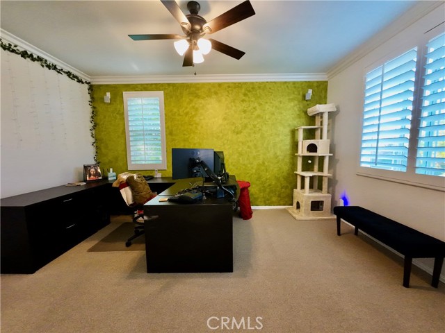 Plantation shutters and crown molding throughout with Hunter ceiling fans, along with built in sound and security systems.