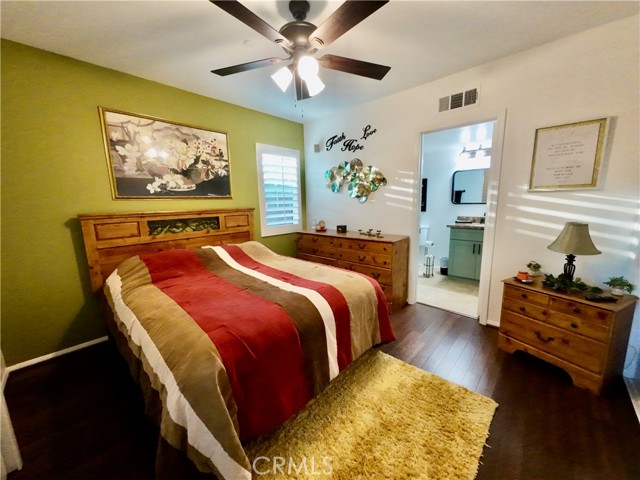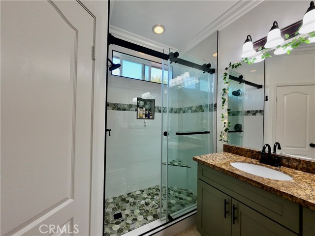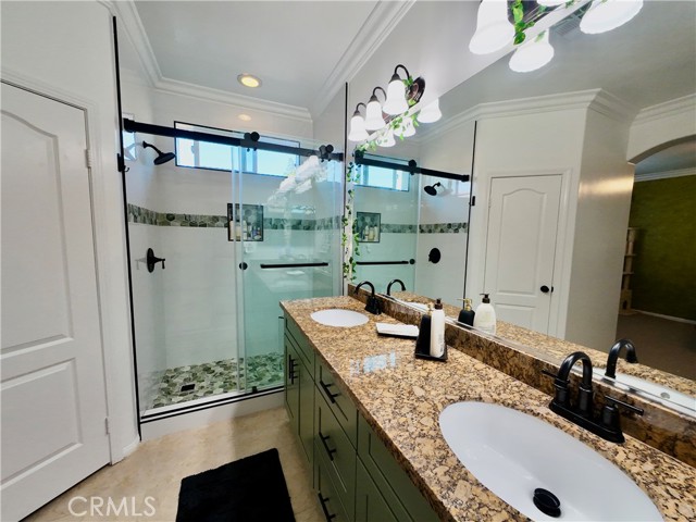 The large master suite features two walk in closets, double bathroom sinks and a modern frameless clear glass shower with a built-in seat.