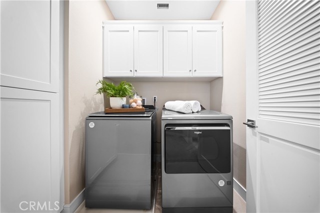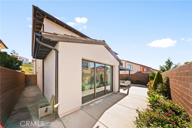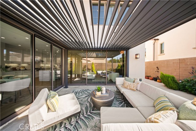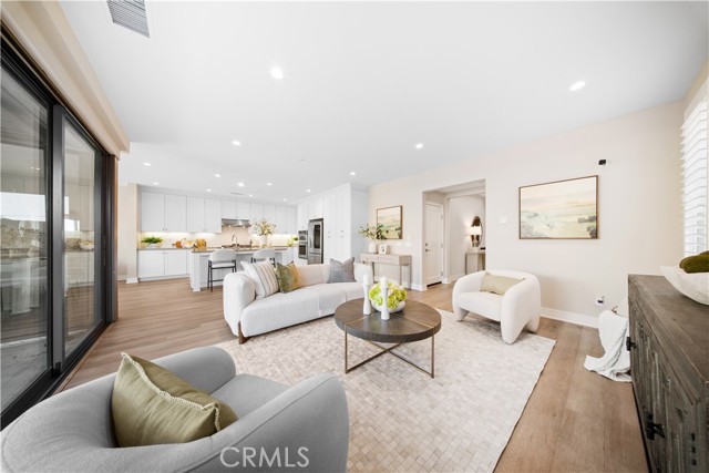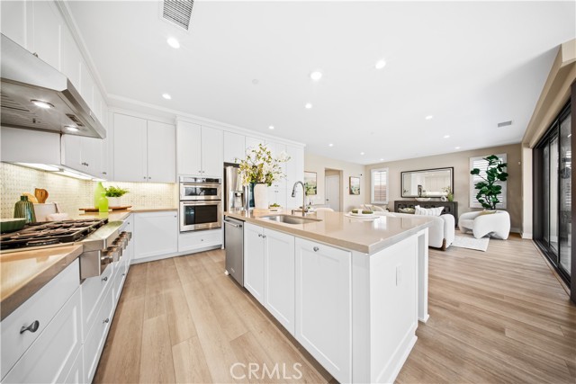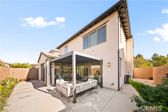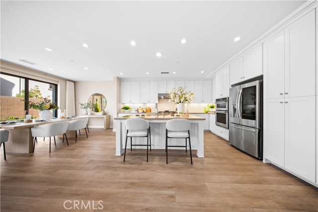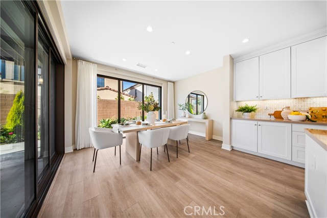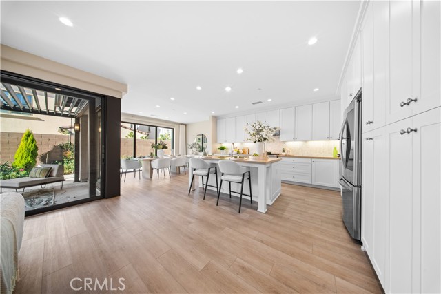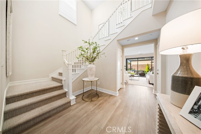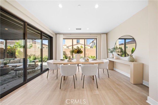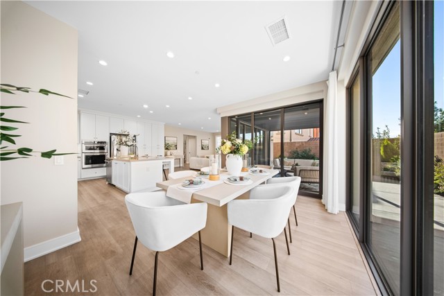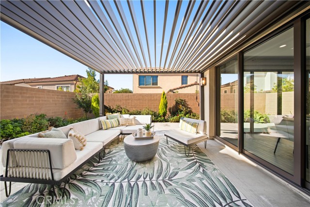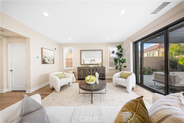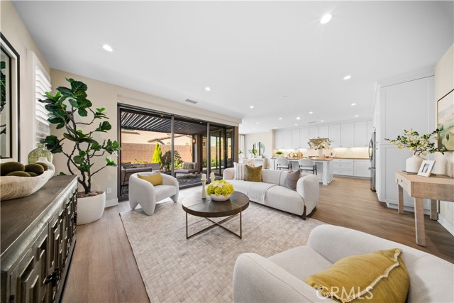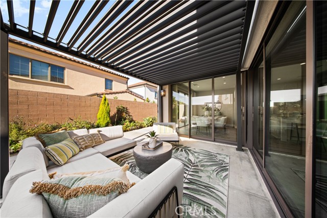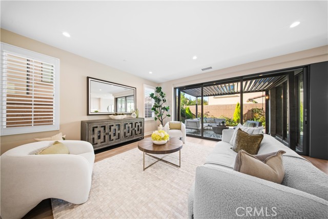Upon entering, the two-story foyer enhances the sense of grandeur. The inviting first floor features an open floor plan, highlighted by beautiful hardwood floors and expansive panoramic sliding doors that flood the great room with natural light. The seamless connection to the modern backyard, complete with an adjustable sunshade canopy, creates the perfect space for both relaxation and family gatherings, providing endless opportunities to enjoy the beautiful California weather. The gourmet kitchen is a chef’s dream, featuring top-of-the-line stainless steel appliances, a central island, sleek granite countertops with an upgraded full backsplash, and elegant white cabinetry that offers ample storage for all your culinary needs.