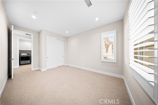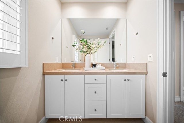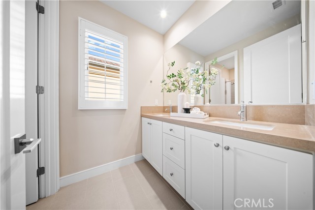 The upstairs is complete with three bedrooms, including the master suite, and a conveniently located laundry room. The luxurious master suite offers a serene retreat, featuring large windows that bathe the room in natural light. The en-suite bathroom is a spa-like oasis, with dual vanities, a soaking tub, a walk-in shower, and a spacious walk-in closet to accommodate all your wardrobe needs. The two additional bedrooms are generously sized, each filled with natural light and equipped with elegant plantation shutters for a touch of sophistication and privacy. The secondary bathroom is equally impressive, with dual sinks and a stylish shower-in-tub accented by a chic backsplash, offering both comfort and convenience.