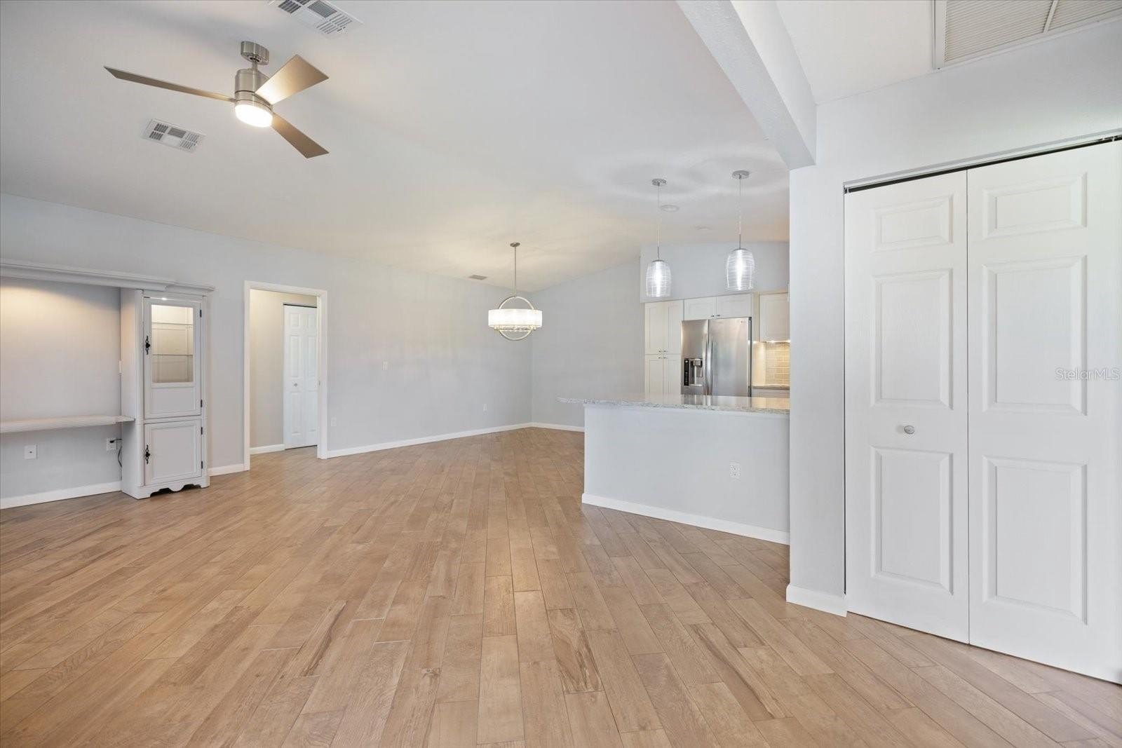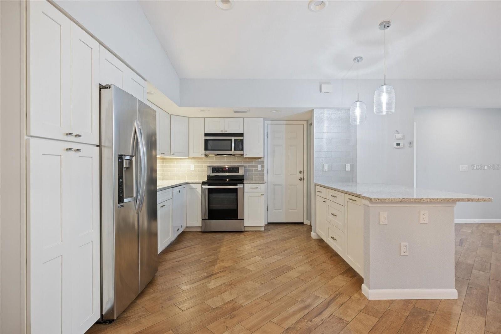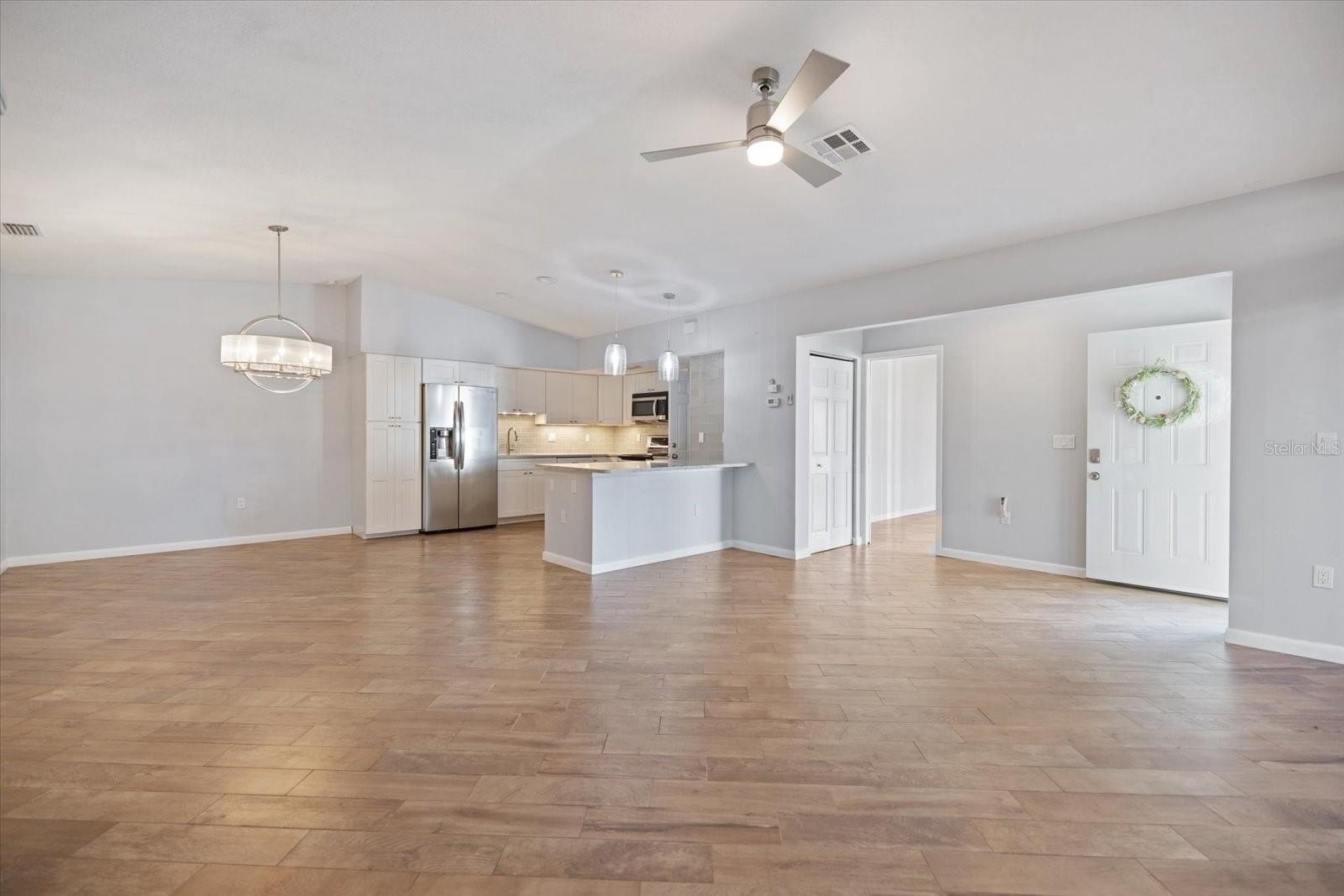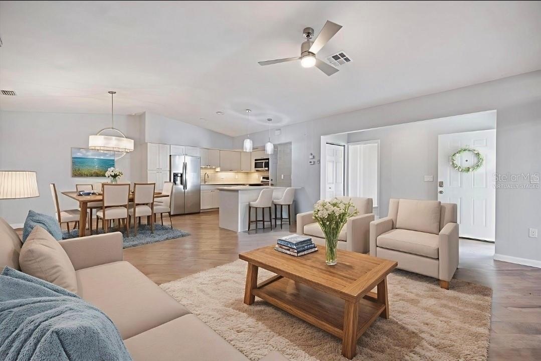 Step inside to discover a masterfully reimagined villa where quality, comfort, and design come together effortlessly. Thoughtfully renovated in 2017, this home features high end finishes throughout including durable faux wood porcelain plank tile flooring in every room creating a seamless, elegant look. The open concept layout with modern textured vaulted ceilings brings in a bright and airy Great Room feel that opens to the Dining Area and show stopping Kitchen that is perfect for entertaining family and friends. The kitchen is a showpiece, designed to impress, with crisp white soft close cabinetry, pull out trash cabinet & pantry shelves, luxurious quartz countertops, and peninsula island for additional counter space featuring a stunning glass tile accent wall. This true 3-bedroom split plan offers flexibility and privacy for guests, a home office, or hobbies.