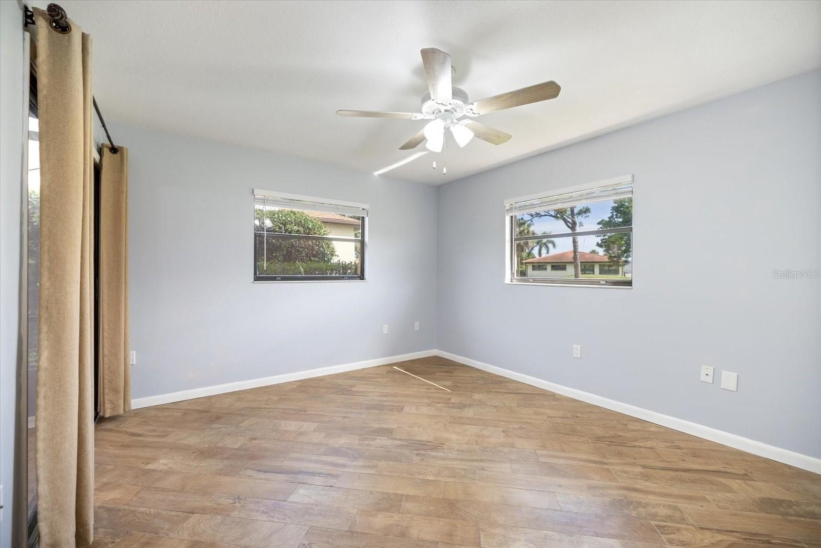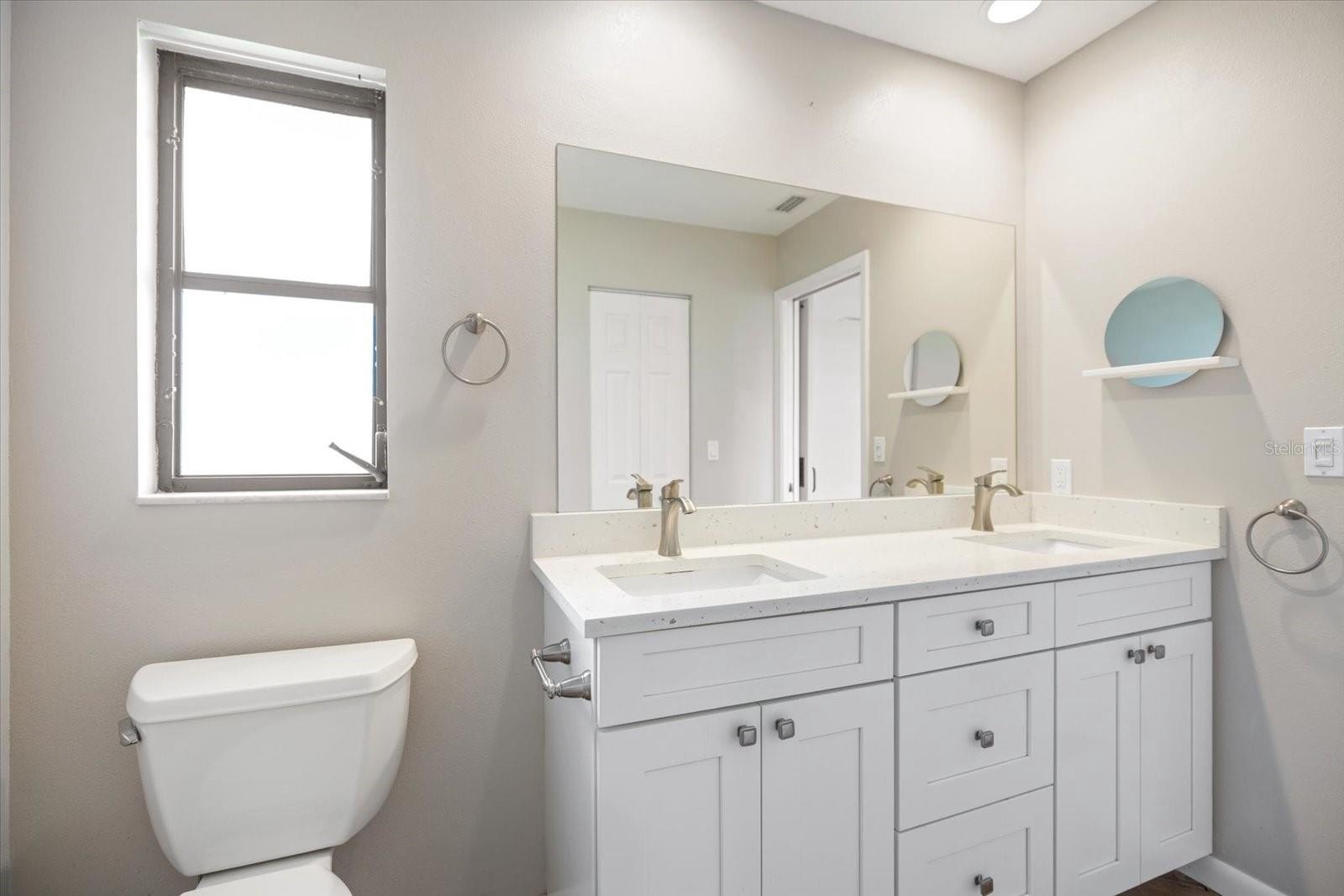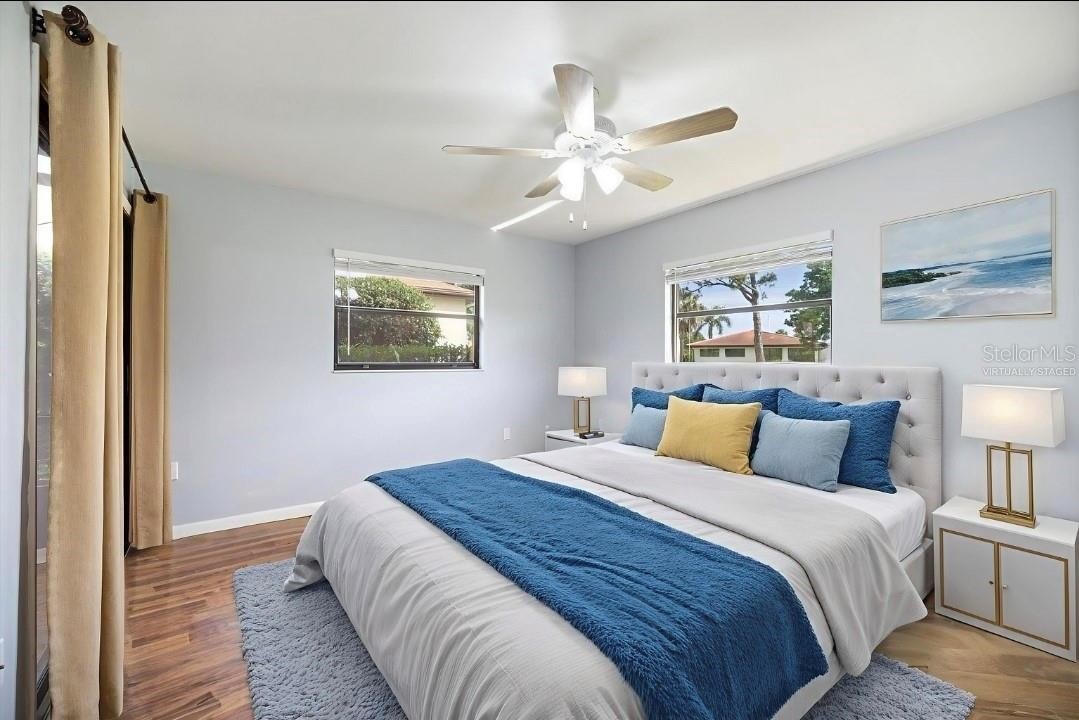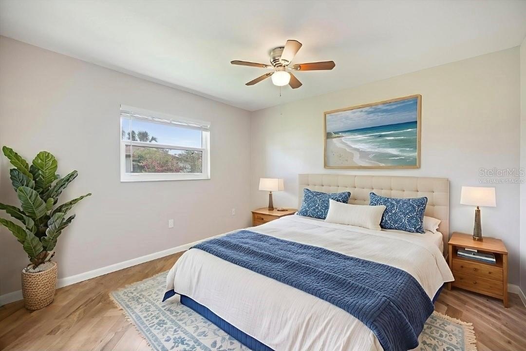 Additional 2017 upgrades include: electrical switches and outlets, energy efficient LED recessed lighting, sleek ceiling fans and contemporary fixtures, replaced interior doors and hardware, updated guest bathroom, primary suite with double vanities, quartz countertops with mother-of-pearl detail, and a spa style travertine walk in shower. Current owners finished out the extensive remodel done by previous owner with new appliances (except for dishwasher) in 2016, ring doorbell, barn door in Primary Bedroom, and painted throughout in 2023 except for Bedroom #2 that has a brand-new hurricane impact window.