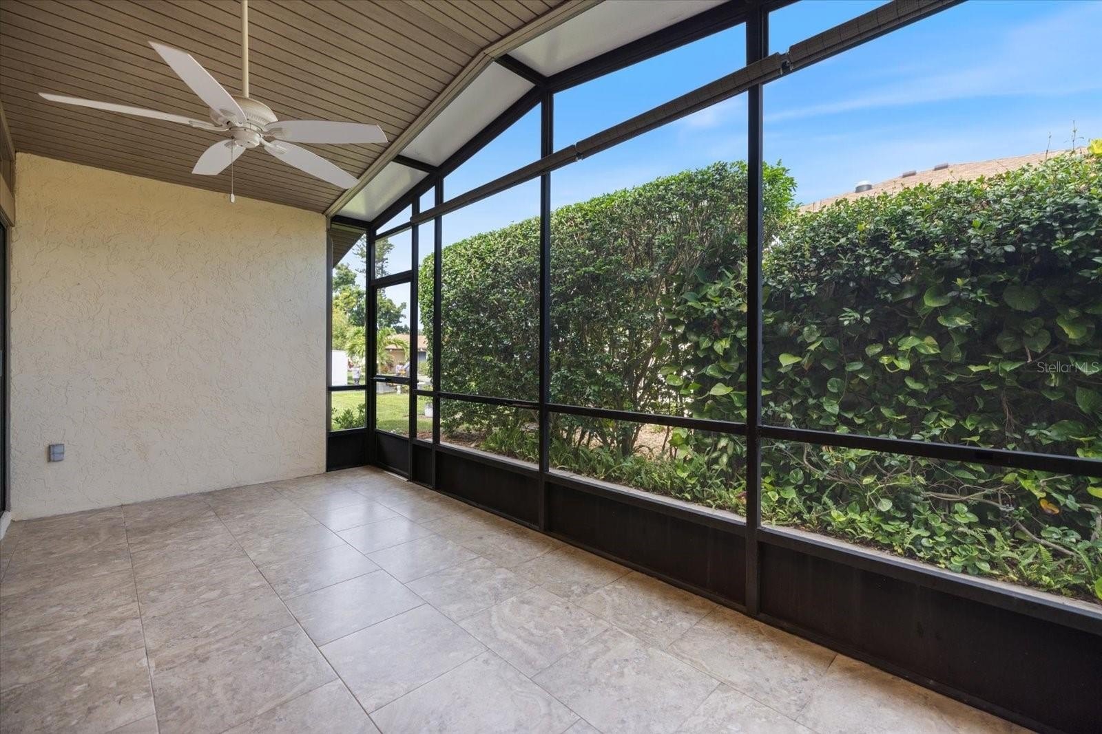 Step out to the spacious screened lanai, to upgraded 20" porcelain tile flooring and wall of sliders that open to offer an inviting indoor-outdoor lifestyle in the cooler months. The lanai provides both privacy and tranquility with a “wall” of jasmine that blooms in the spring filling the air with fragrance and just steps from the community pool.