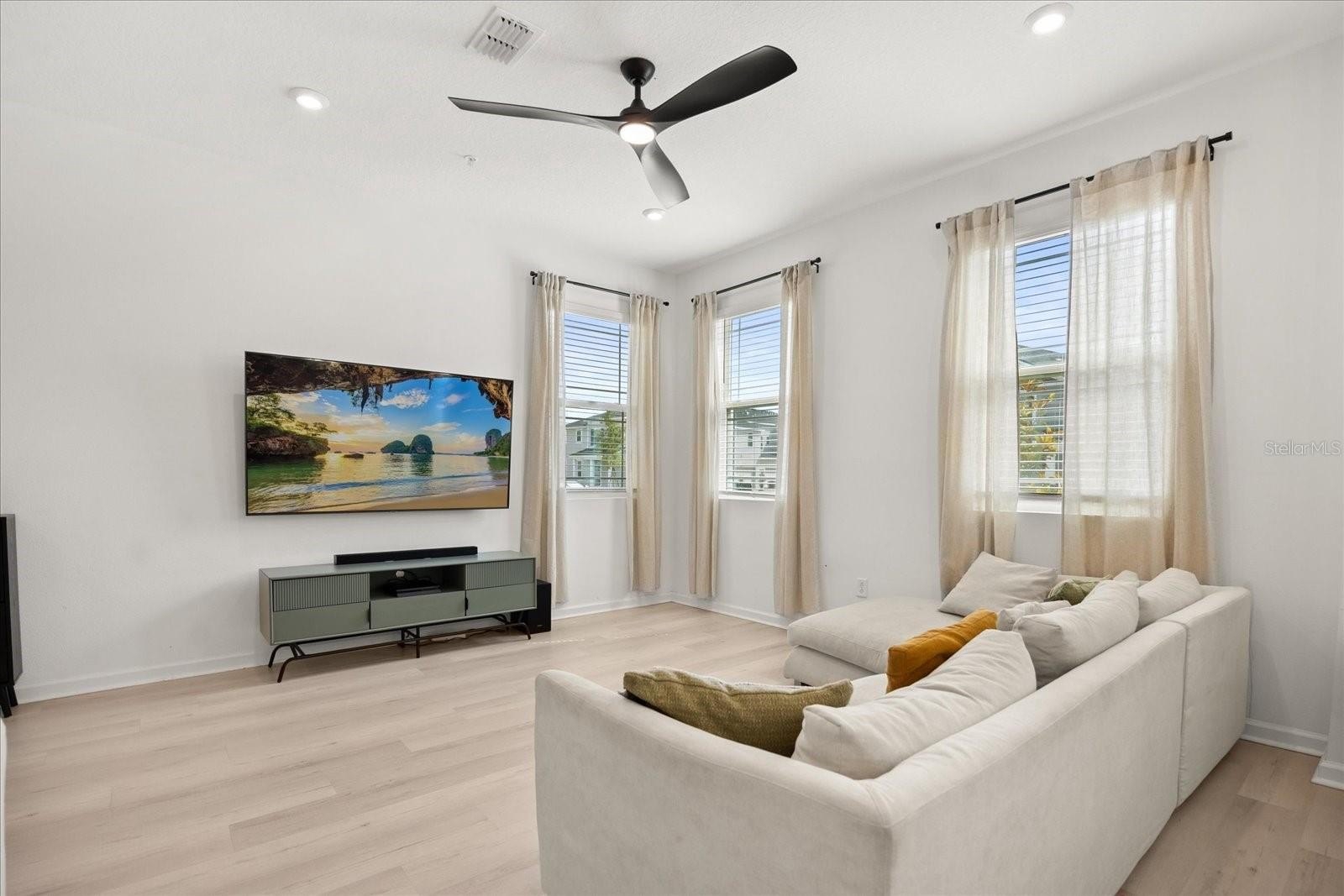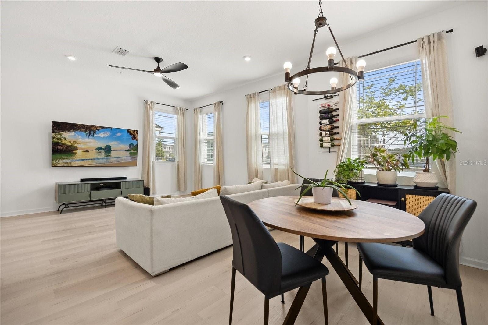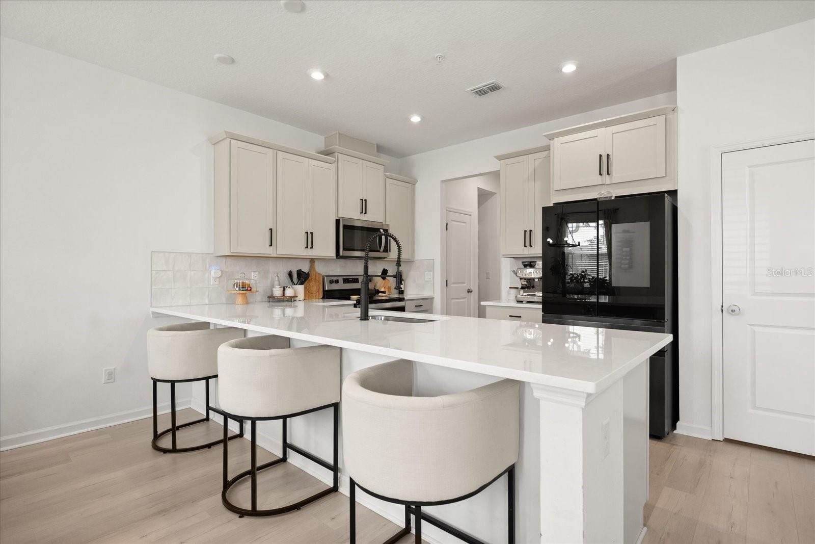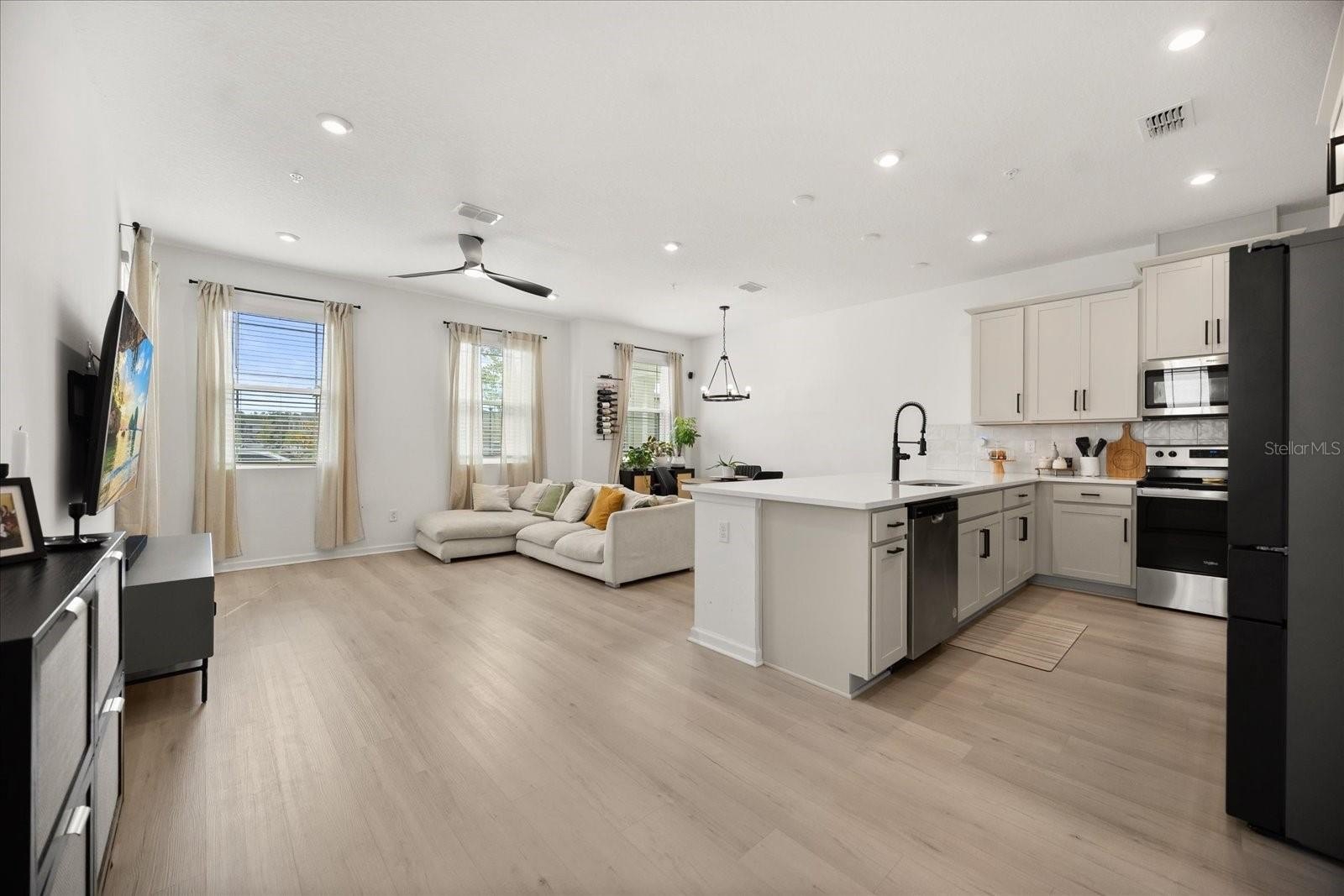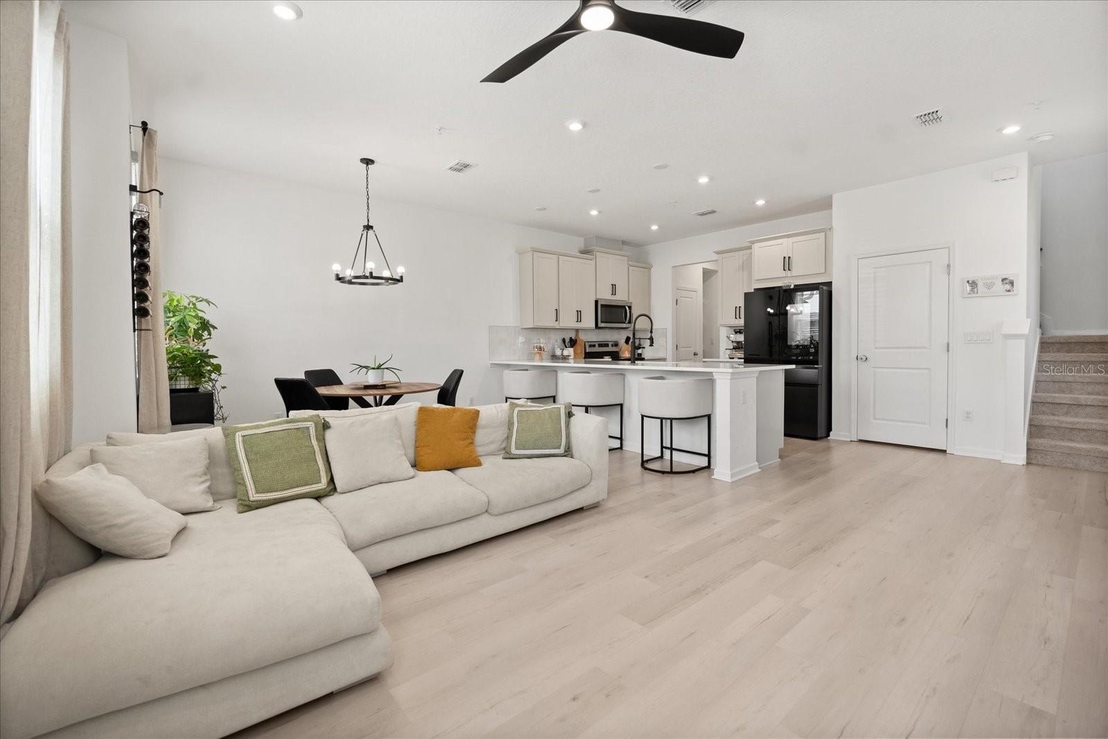 Step inside to a bright, airy interior featuring sleek quartz countertops, stainless steel appliances, and stylish black accents in the gourmet kitchen—ideal for entertaining or daily living. The spacious living and dining areas flow seamlessly, enhanced by abundant natural light, chic ceiling fans, and luxury vinyl plank flooring throughout the main level. Upstairs, discover a versatile loft space, three generous bedrooms including a luxurious owner's suite with an ensuite bath and walk-in closet, plus additional well-appointed bathrooms with modern fixtures and tiled surrounds.