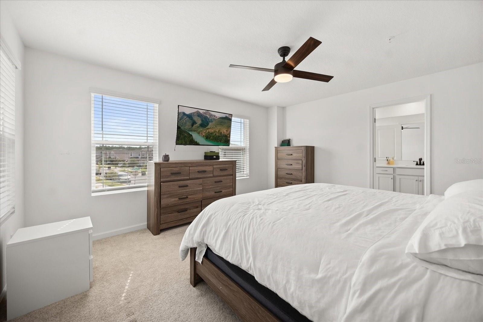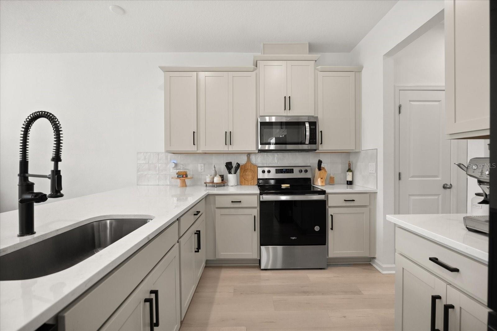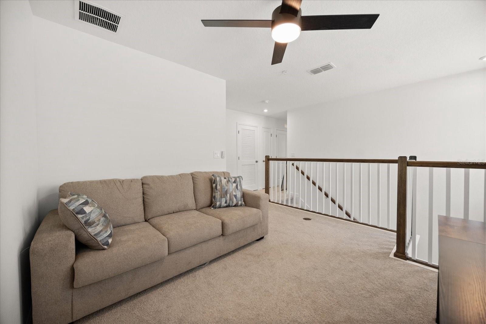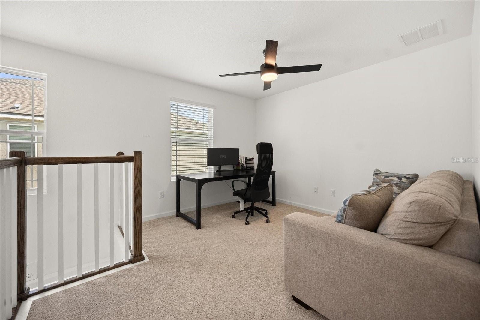 Step inside to a bright, airy interior featuring sleek quartz countertops, stainless steel appliances, and stylish black accents in the gourmet kitchen—ideal for entertaining or daily living. The spacious living and dining areas flow seamlessly, enhanced by abundant natural light, chic ceiling fans, and luxury vinyl plank flooring throughout the main level. Upstairs, discover a versatile loft space, three generous bedrooms including a luxurious owner's suite with an ensuite bath and walk-in closet, plus additional well-appointed bathrooms with modern fixtures and tiled surrounds.