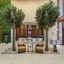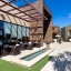 The main living space opens to an outdoor summer kitchen area with sink and grill, perfect for entertaining. The second-floor master suite features a private balcony, adding an elegant touch and additional space to relax.