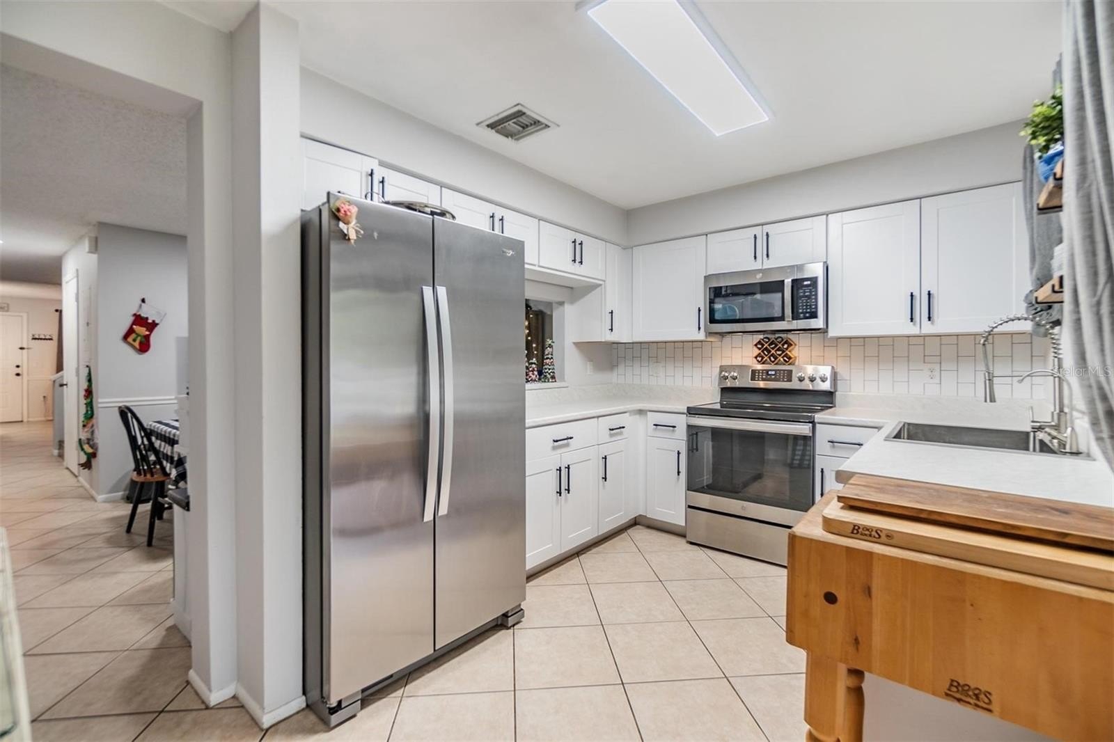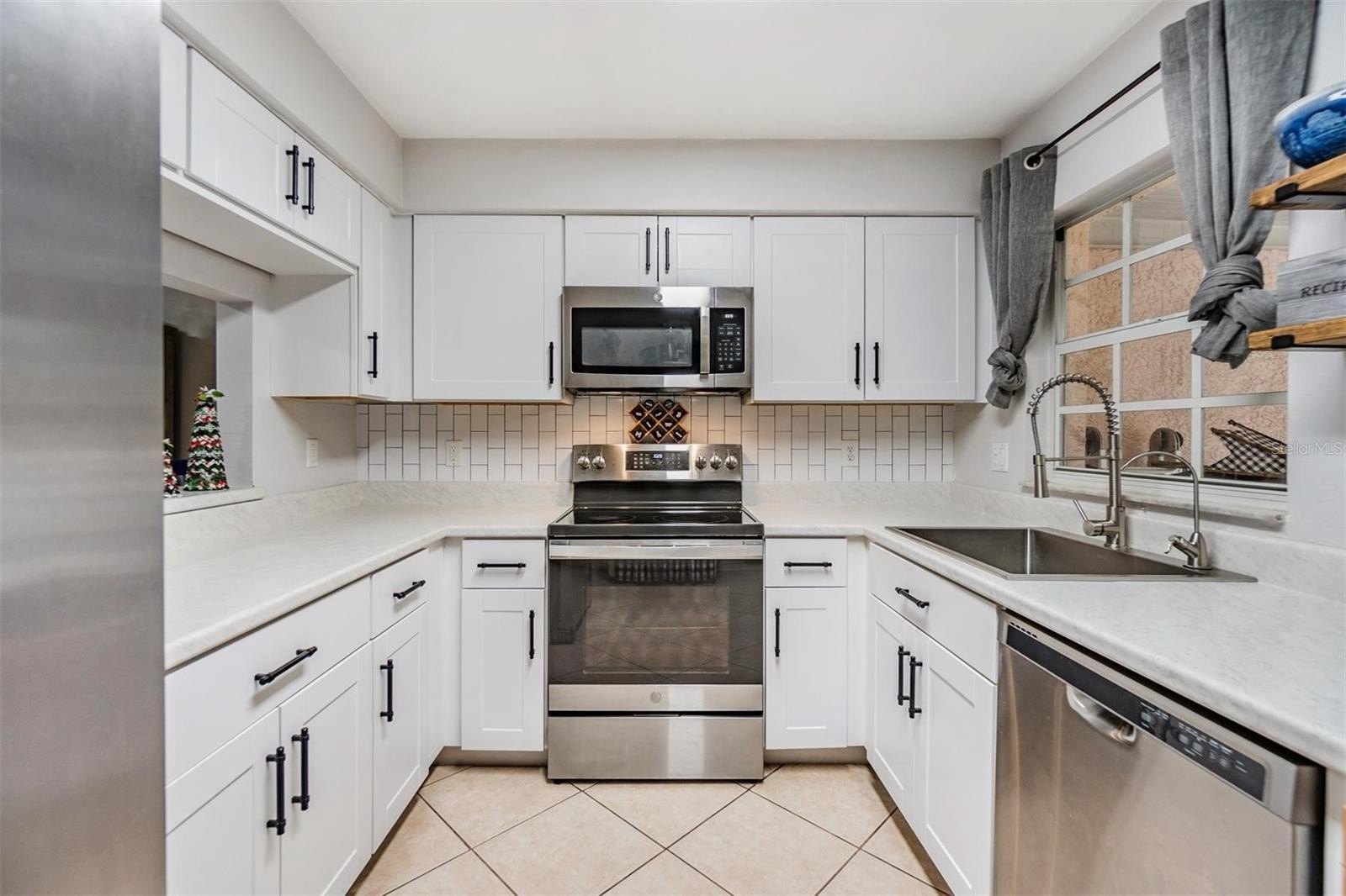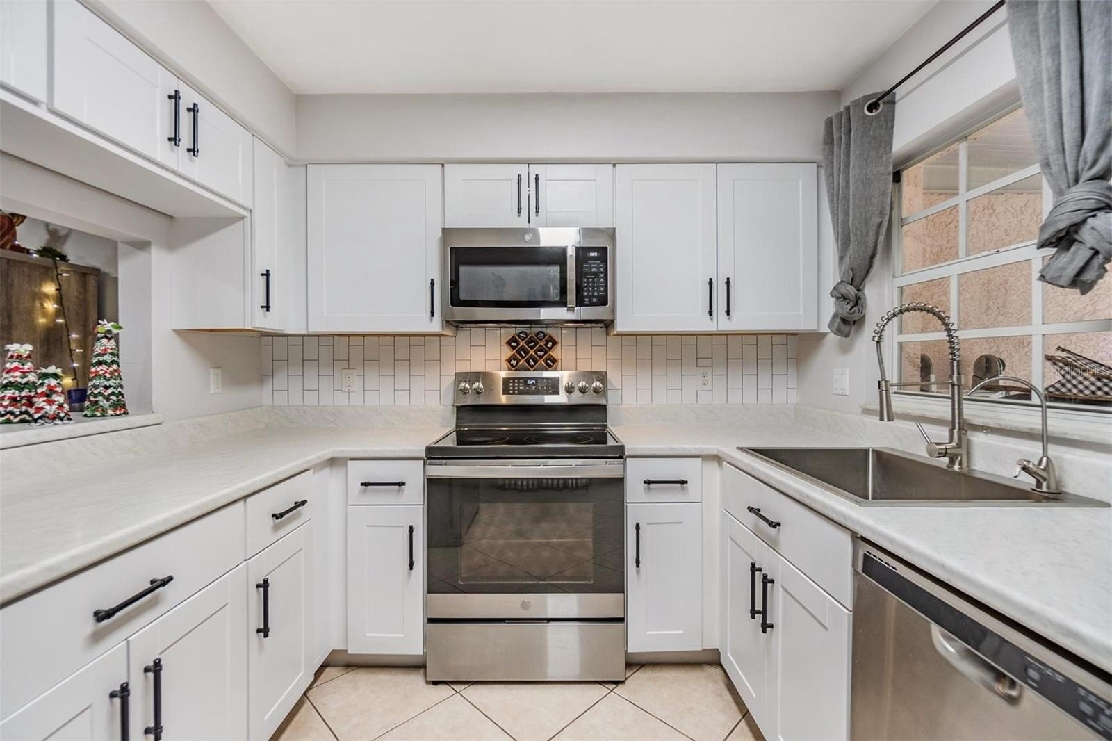 Enjoy modern finishes throughout with no carpet— ceramic tile covers the first floor, while sleek laminate enhances the upstairs. The fully renovated kitchen is a true highlight, showcasing brand-new white cabinetry, stainless steel appliances, coordinating backsplash, and a contemporary countertop. The spacious living room flows seamlessly into the dining area, perfect for entertaining.