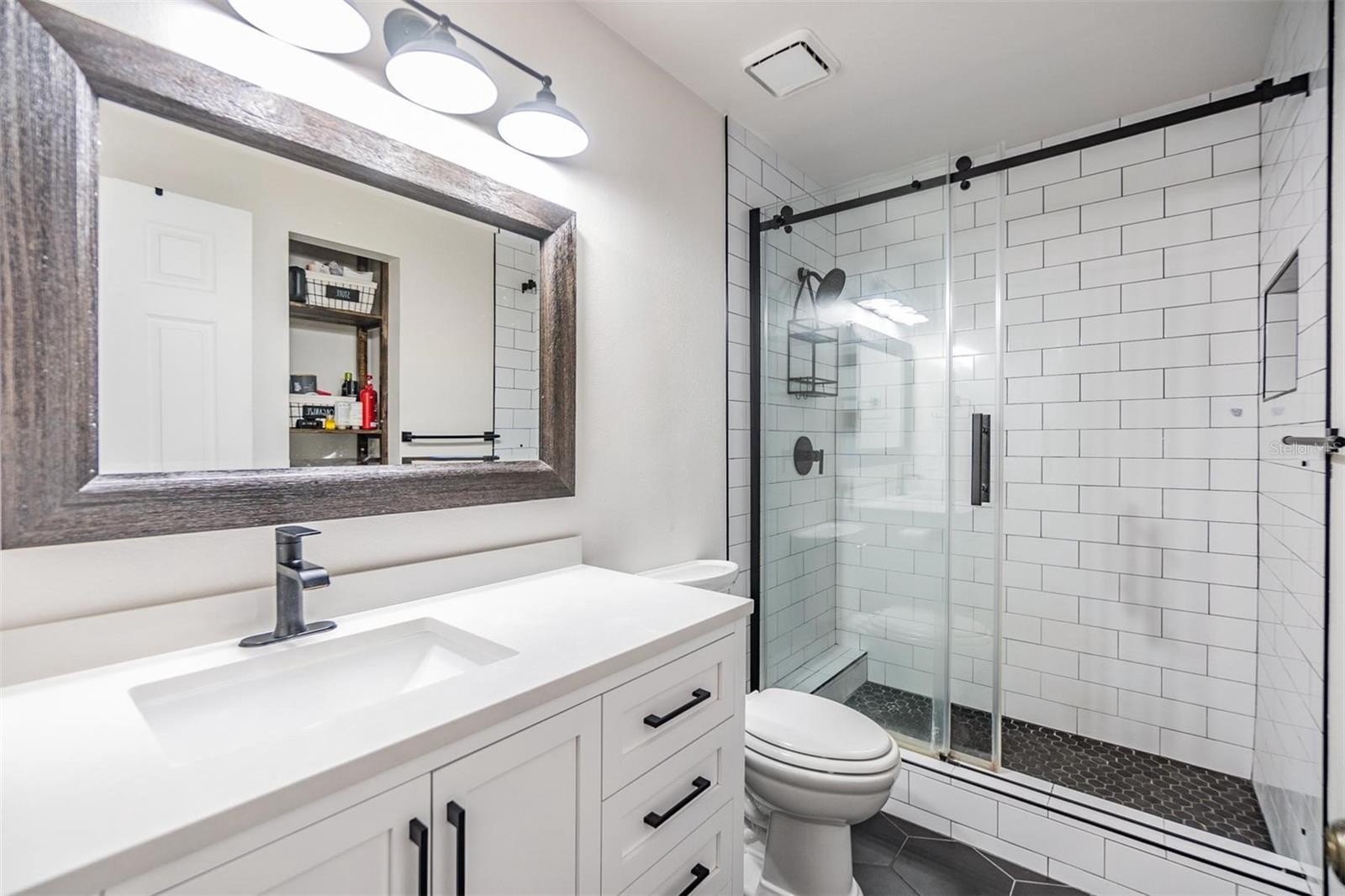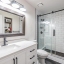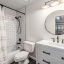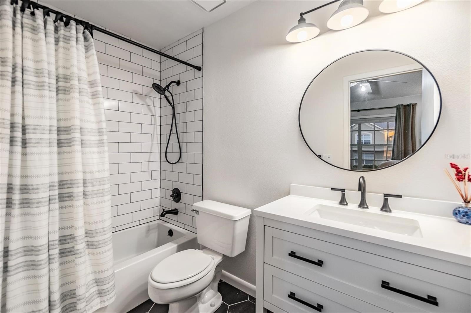 The generous primary suite accommodates king-sized furniture and offers a walk-in closet, along with a stunning en-suite bath featuring a tiled shower with glass doors, modern vanity, and built-in shelving. The second bedroom also boasts its own updated en-suite bath, making it perfect for family or guests.