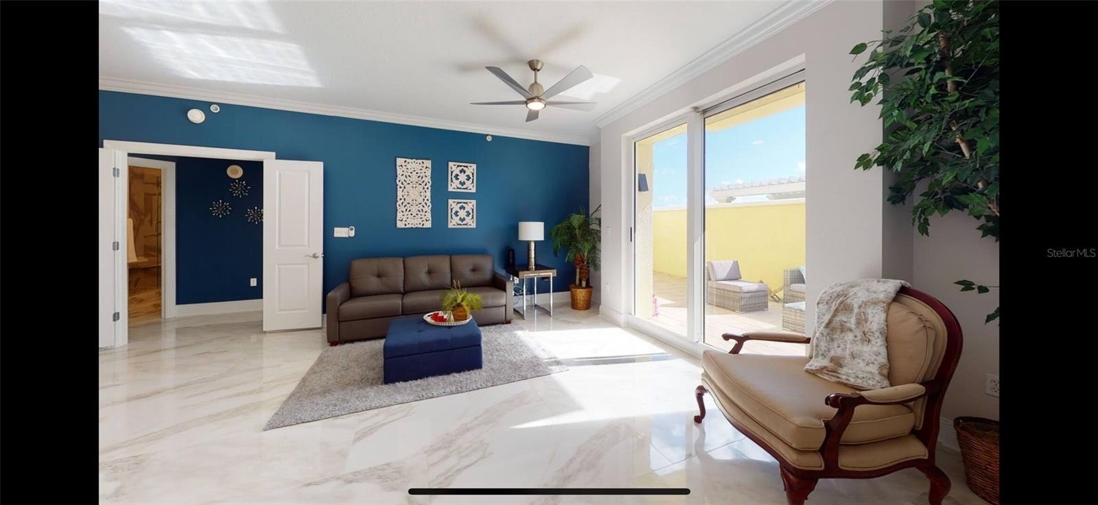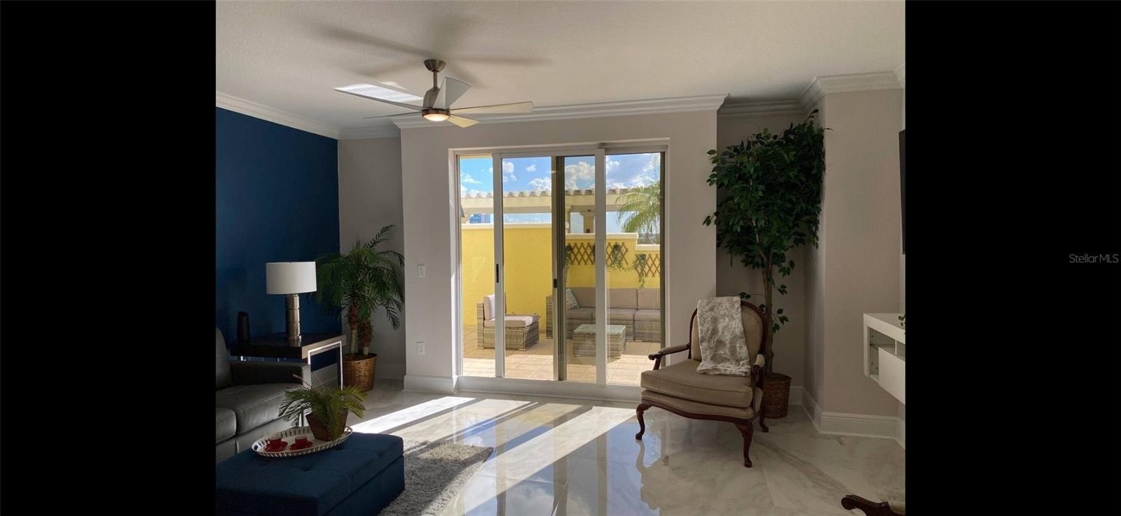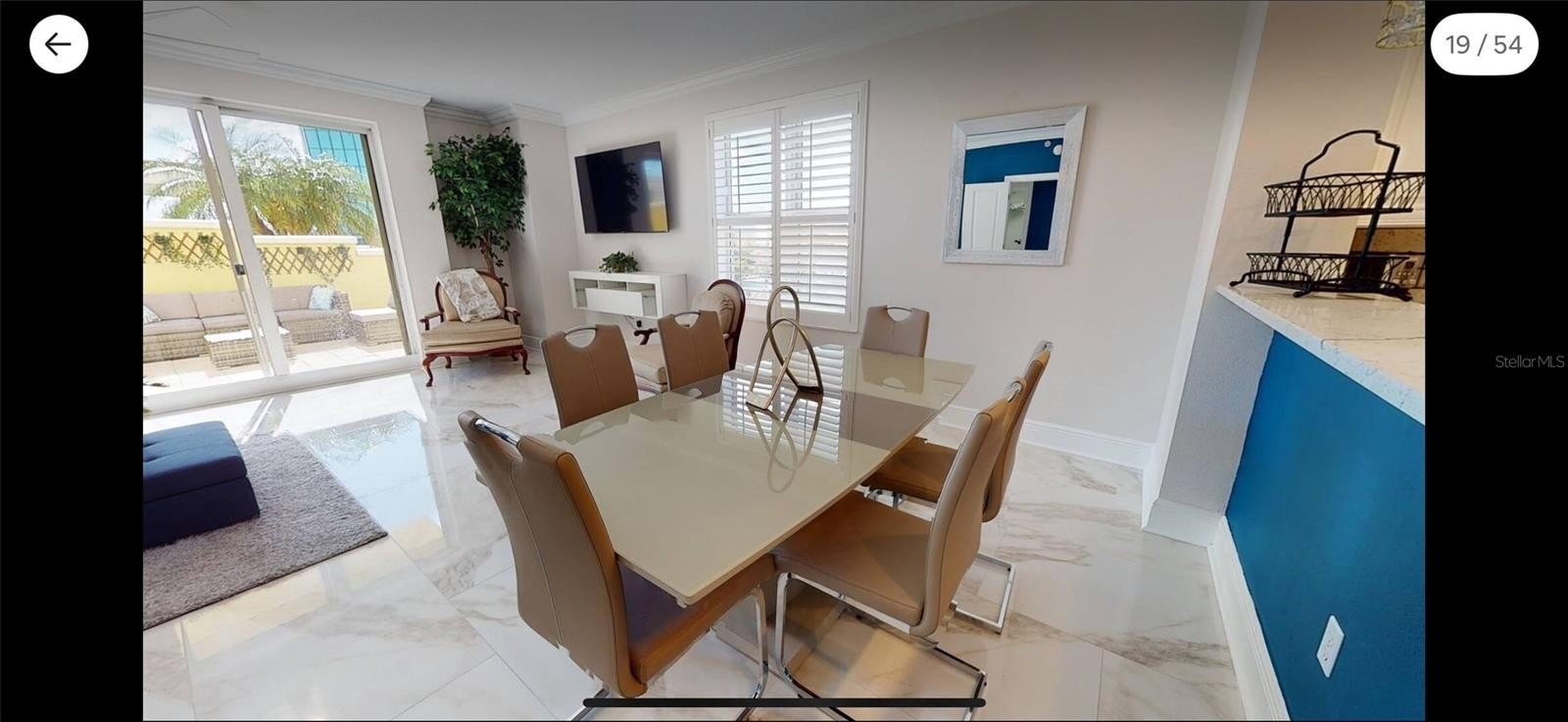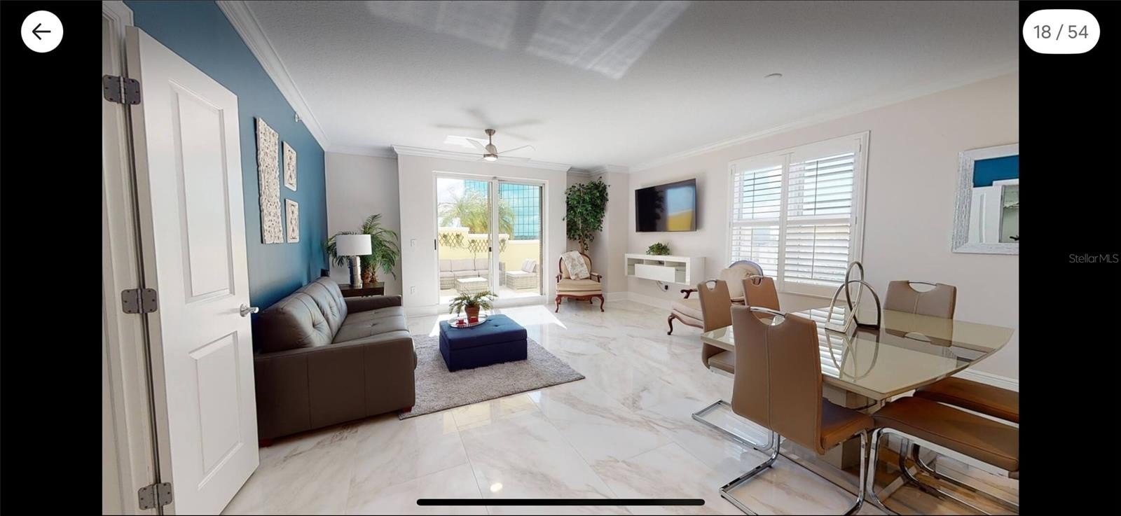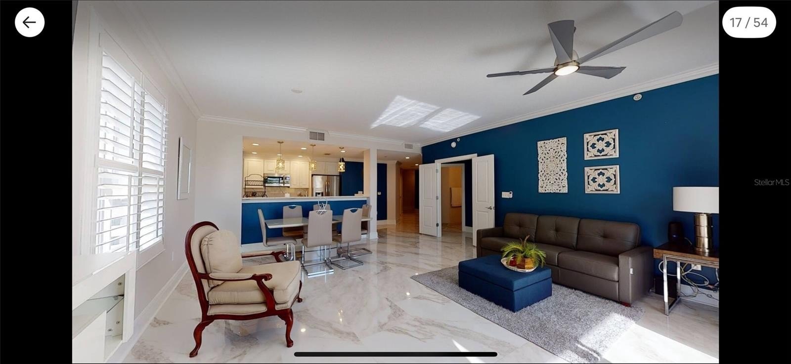 Inside, this open-concept corner unit boasts 2 bedrooms and 2 bathrooms, offering 1,484 sq ft of spacious living perfect for hosting family and friends. Enjoy a large, private patio with a privacy wall, hurricane shutters, and assigned parking, along with guest spaces for added convenience. The kitchen comes complete with stainless steel appliances (all included) and plenty of room for cooking and entertaining. Elegant crown molding, ceiling fans throughout, and luxury porcelain tile enhance the Florida-ready aesthetic, while the in-unit laundry closet adds practical convenience.