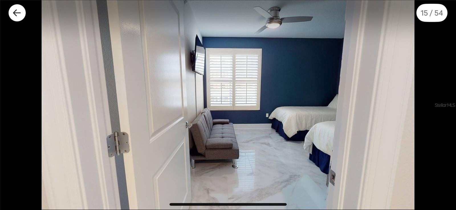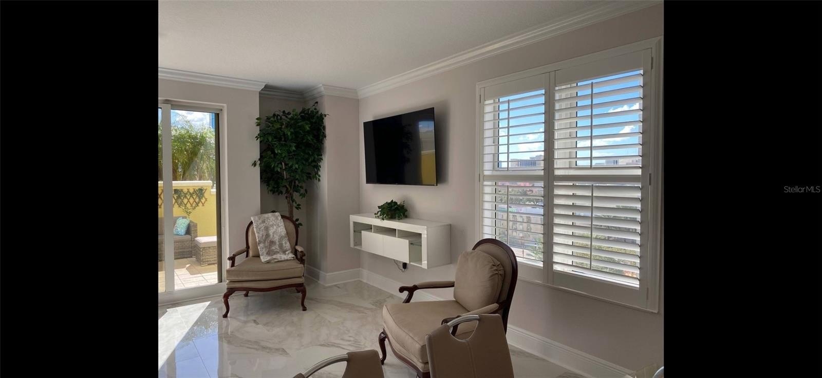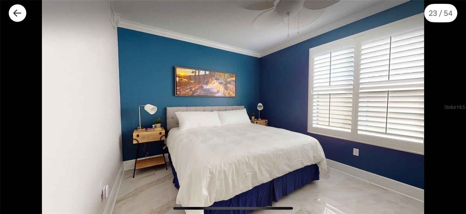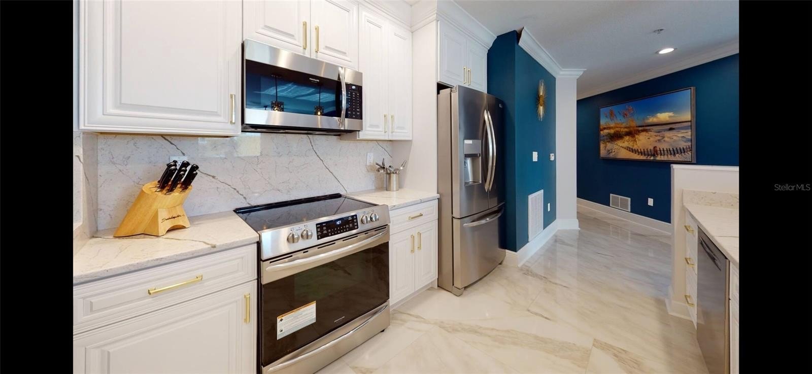 Inside, this open-concept corner unit boasts 2 bedrooms and 2 bathrooms, offering 1,484 sq ft of spacious living perfect for hosting family and friends. Enjoy a large, private patio with a privacy wall, hurricane shutters, and assigned parking, along with guest spaces for added convenience. The kitchen comes complete with stainless steel appliances (all included) and plenty of room for cooking and entertaining. Elegant crown molding, ceiling fans throughout, and luxury porcelain tile enhance the Florida-ready aesthetic, while the in-unit laundry closet adds practical convenience.