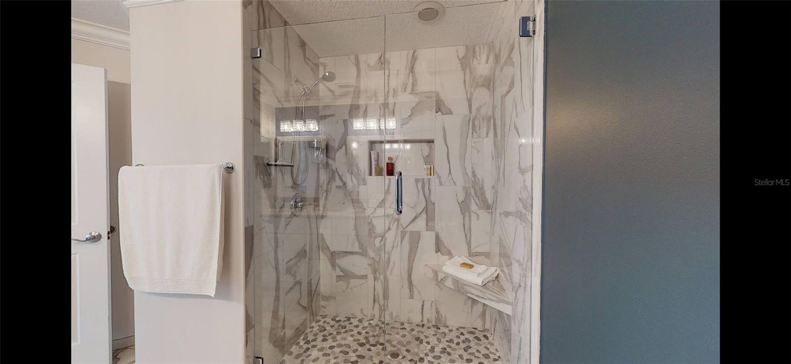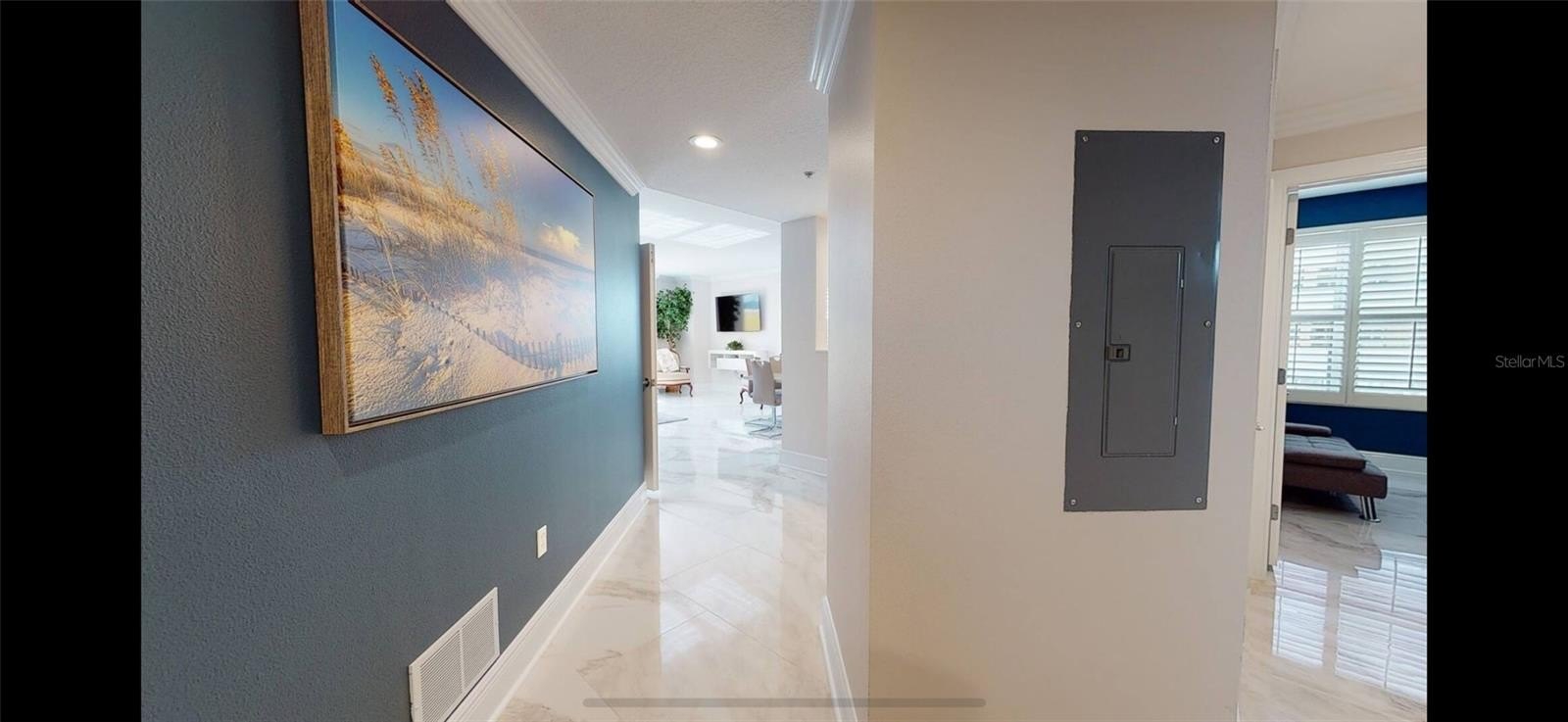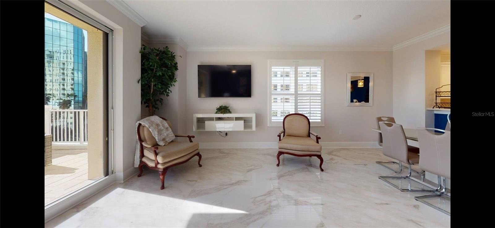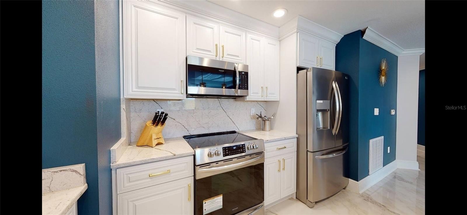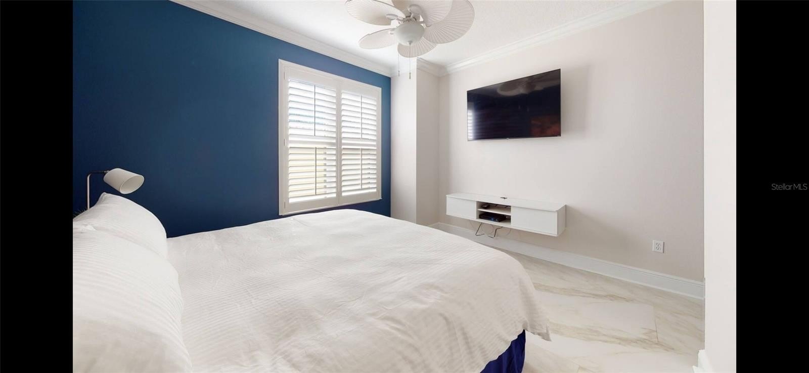 Inside, this open-concept corner unit boasts 2 bedrooms and 2 bathrooms, offering 1,484 sq ft of spacious living perfect for hosting family and friends. Enjoy a large, private patio with a privacy wall, hurricane shutters, and assigned parking, along with guest spaces for added convenience. The kitchen comes complete with stainless steel appliances (all included) and plenty of room for cooking and entertaining. Elegant crown molding, ceiling fans throughout, and luxury porcelain tile enhance the Florida-ready aesthetic, while the in-unit laundry closet adds practical convenience.
