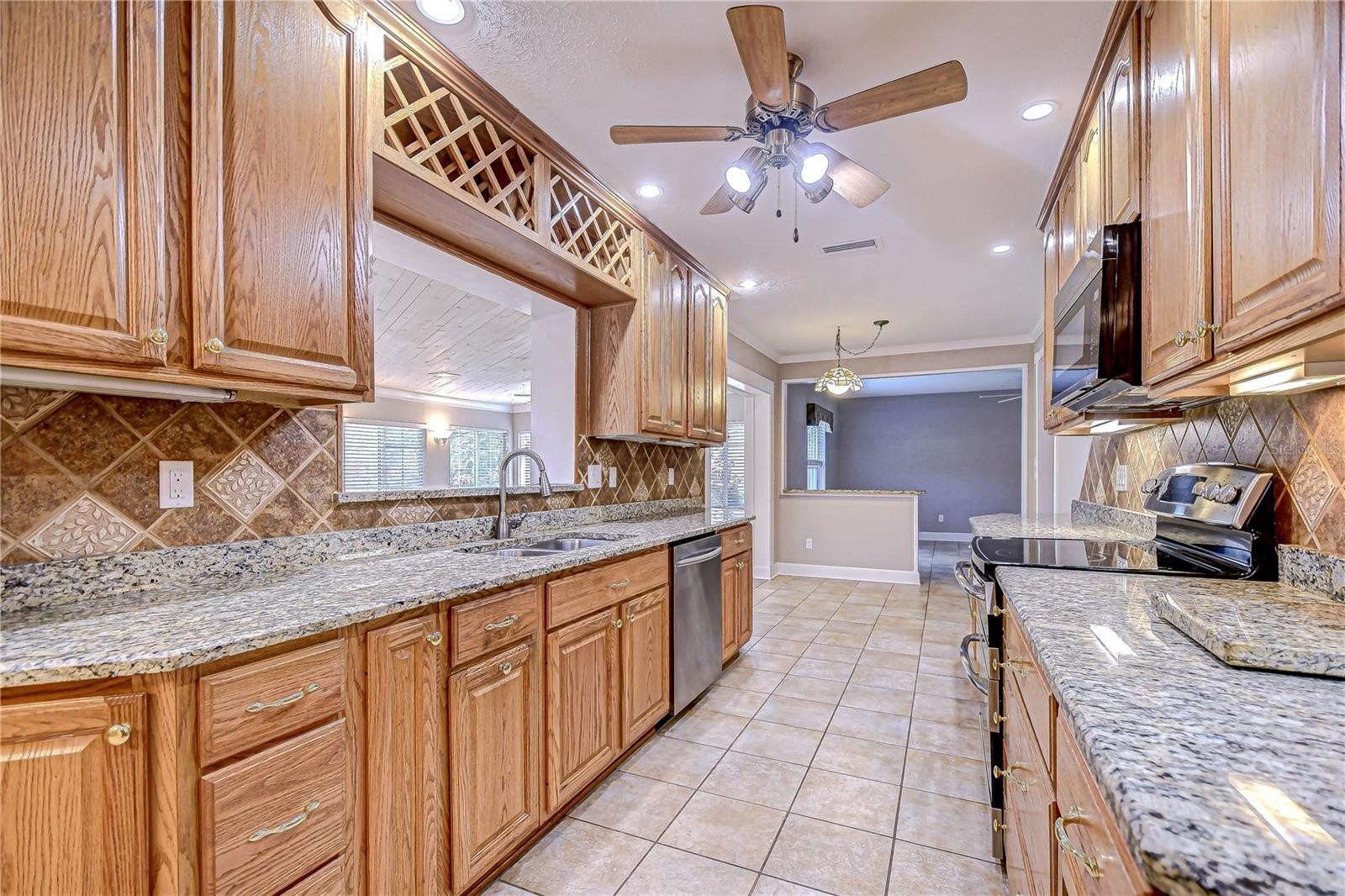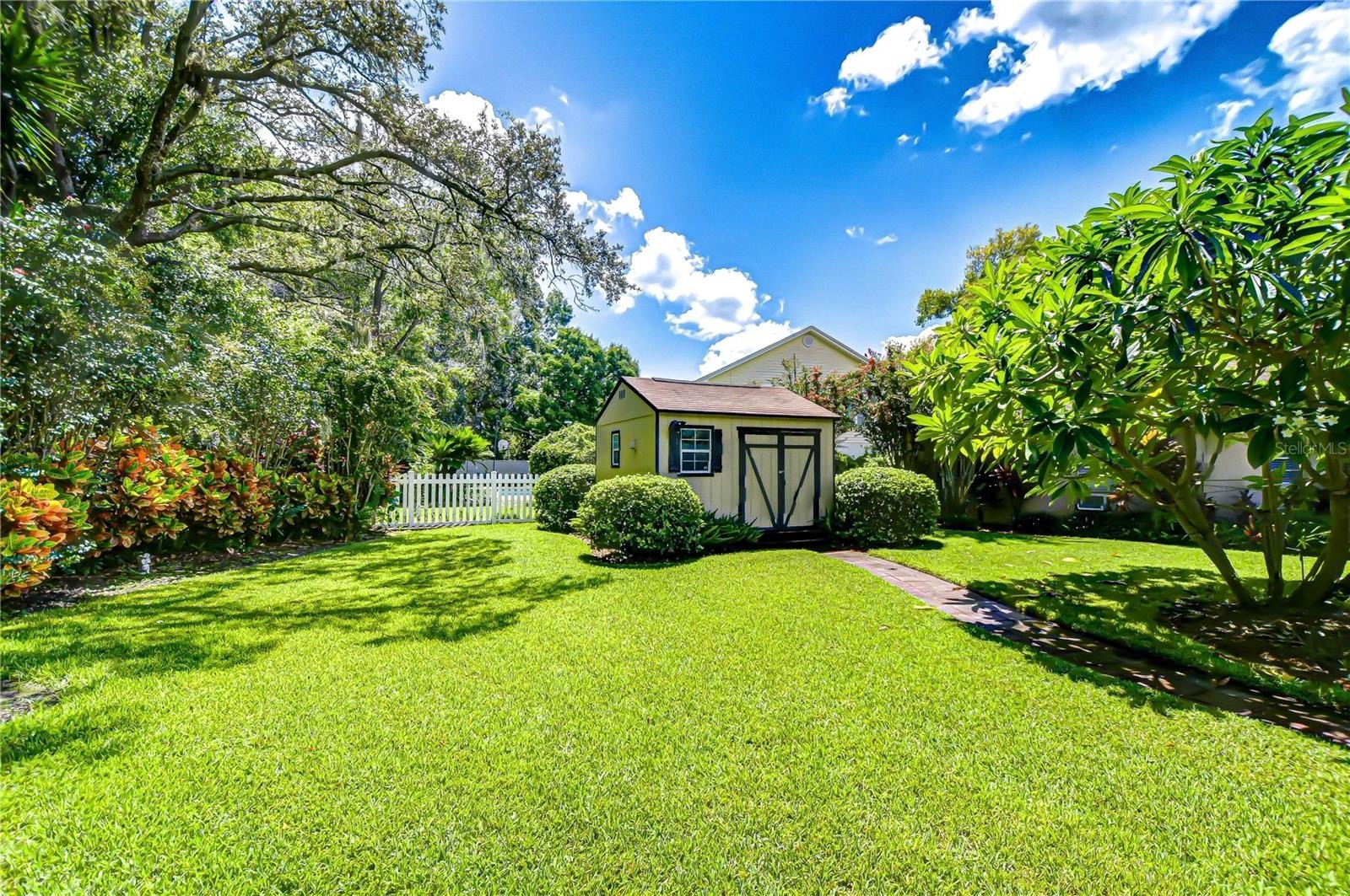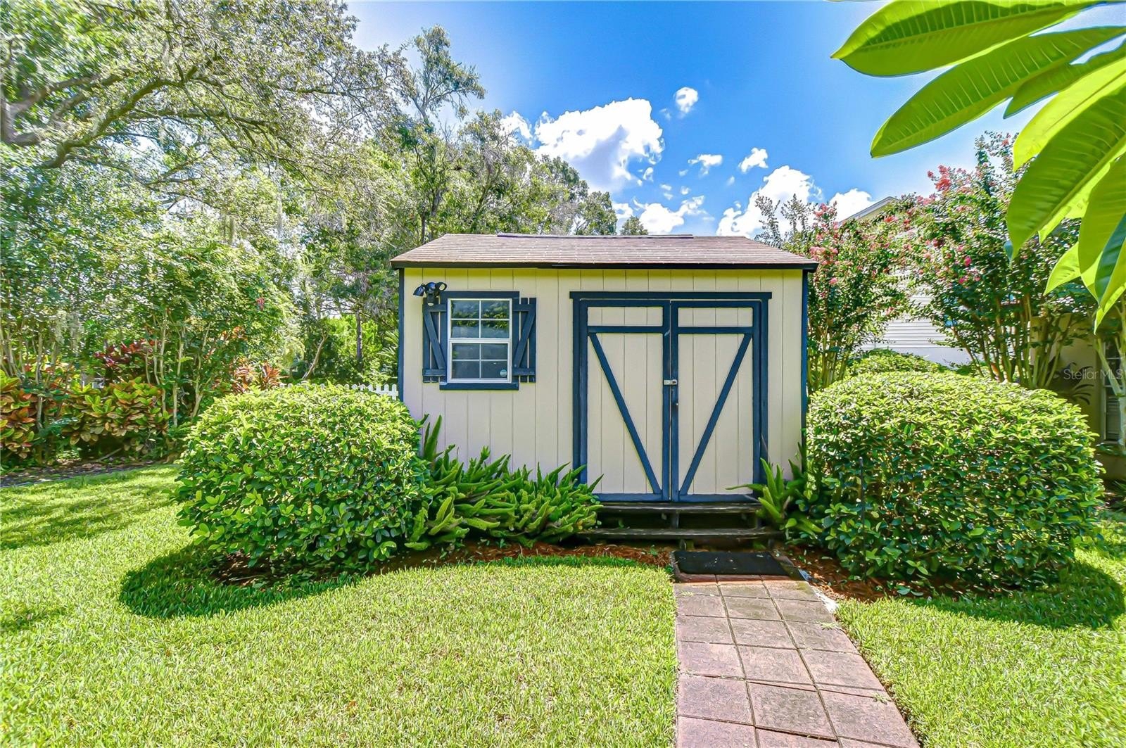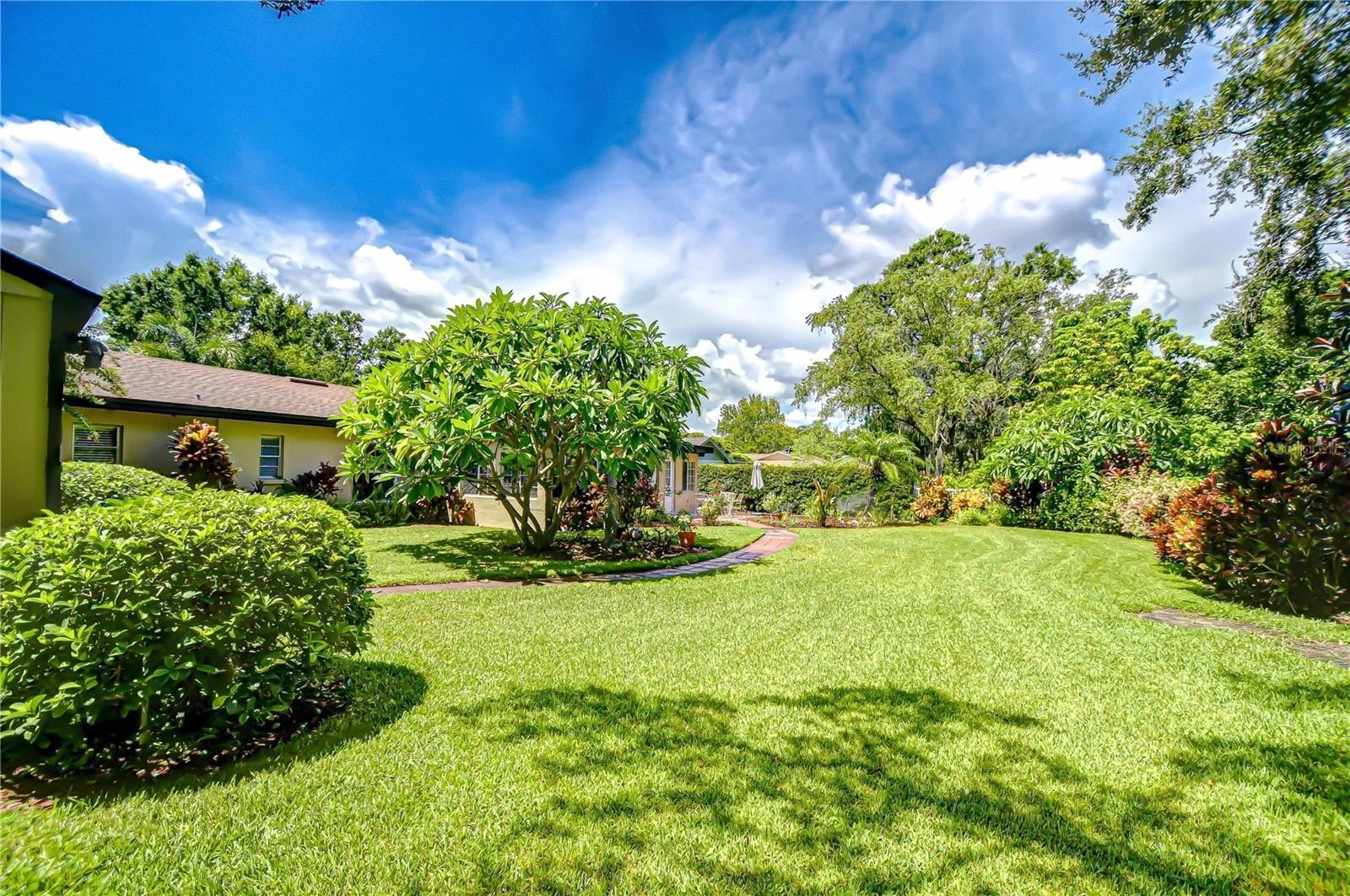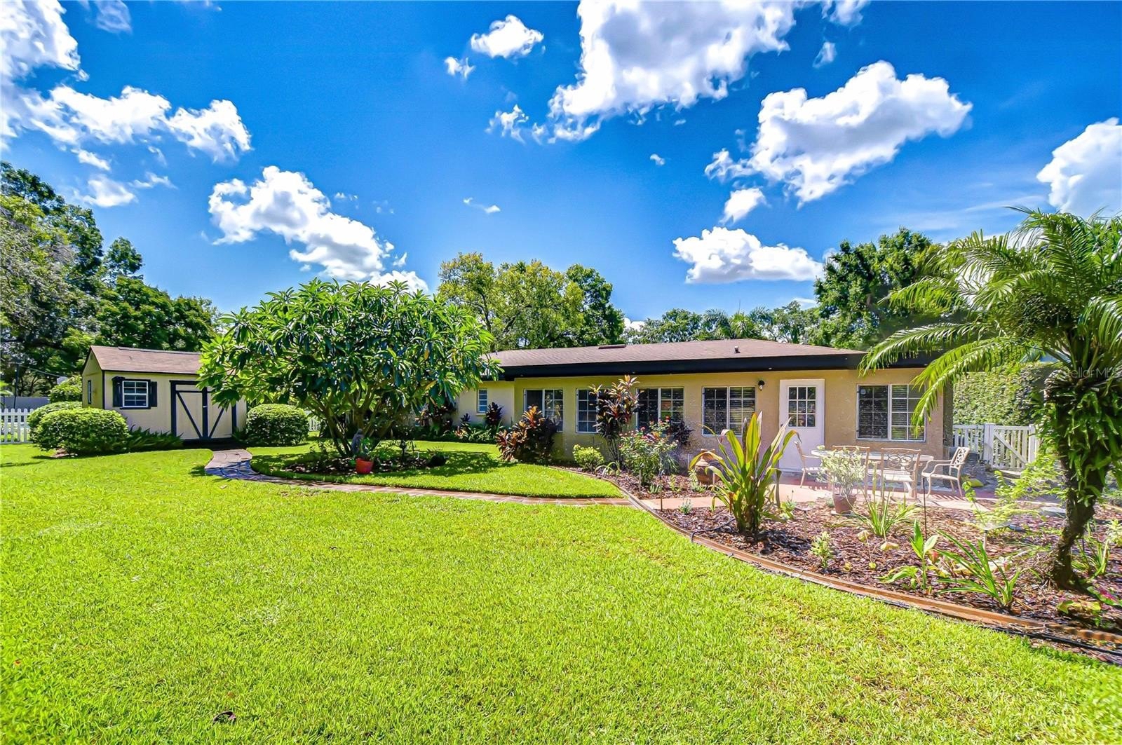 Timeless Carrollwood Beauty – Rarely Available Single-Owner Gem. Perfectly situated in the heart of Carrollwood, this 4-bedroom, 2-bath residence has been lovingly cared for by the same family since 1979, a true rarity in today’s market. Offering 2,319 sq. ft. of inviting living space, the home blends modern updates with classic character, from the paver driveway and manicured landscaping to the brick façade accented by shutters on the front windows and coach lights. A brick walkway leads to the portico entrance with a wood front door featuring an oval glass insert, while a RING doorbell adds modern convenience—an inviting introduction to the beautifully maintained interiors that await. Step inside to a welcoming foyer with a convenient hall closet, where pride of ownership is immediately apparent. The freshly painted interior showcases warm wood floors flowing through the living and dining rooms and all four bedrooms, while ceramic tile enhances the kitchen, family room, and enclosed Florida room. The formal living room features a charming bay window that fills the space with natural light, accented by elegant crown molding. The adjoining dining room also offers crown molding, providing a warm and inviting setting for gatherings and celebrations. At the heart of the home, the kitchen boasts oak cabinetry offering abundant storage, gleaming granite countertops, and a decorative tile backsplash with custom Decora tile accent. A stainless double sink with an open pass-through overlooks the Florida room, while a second prep area with matching cabinets, counters, and backsplash adds convenience for cooking and entertaining. From the kitchen, flow into the enclosed Florida room, enhanced with crown molding, three ceiling fans, a storage closet, and direct access to the backyard. A granite-topped counter creates a seamless transition to the family room, where a built-in media center completes this versatile living space. Down the hallway, accented with a classic chair rail, you’ll find the updated hall bath featuring a granite-topped vanity with double drawers and an undermount sink, a large tiled shower enclosed with seamless glass and highlighted by a Listello contrast pattern, and a convenient built-in linen closet. The spacious primary suite offers a wall-length double closet and a private ensuite with separate vanities, a seamless glass-enclosed tiled shower, a built-in linen closet, and custom shelving. Three additional bedrooms are generously sized, providing comfort and versatility for family or guests. Outdoors, discover your own tropical oasis, designed for both relaxation and entertaining. A paved patio area is thoughtfully separated by mulched and stone sections, surrounded by stunning landscaping. Adding to the appeal is a built-in, air-conditioned shed, offering the perfect solution for year-round storage or workshop space.