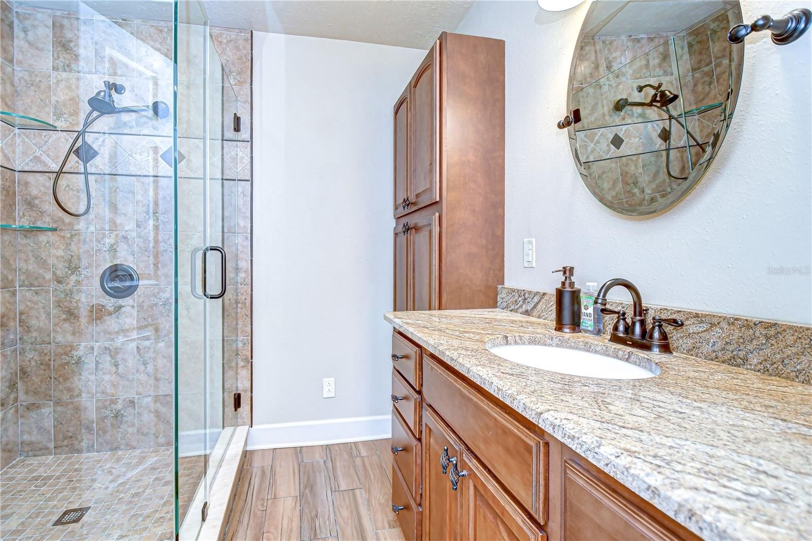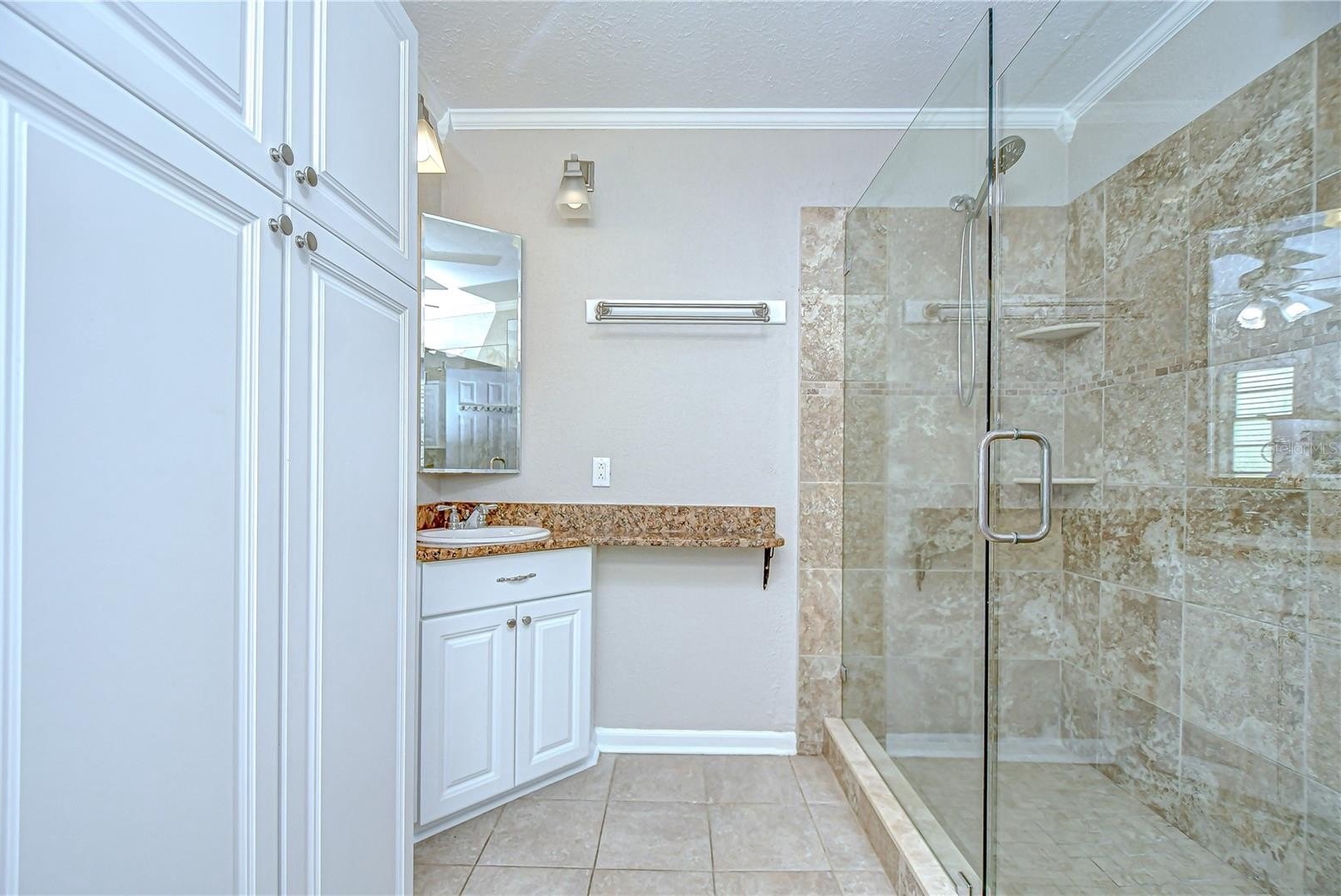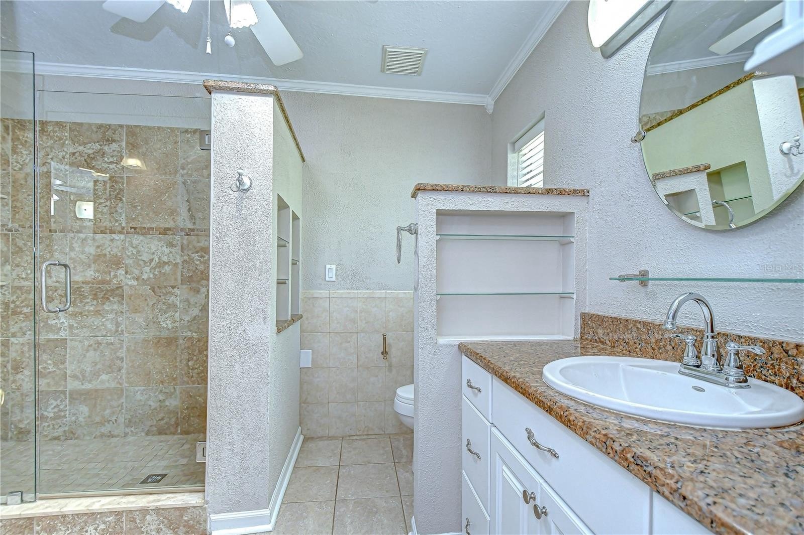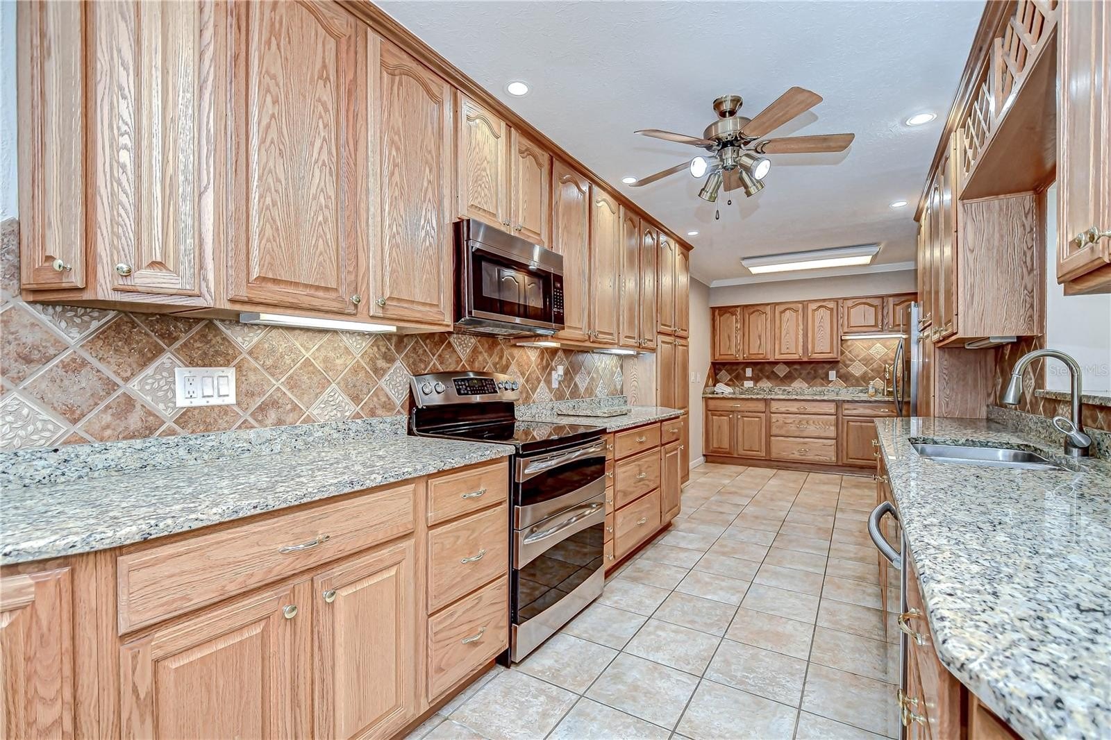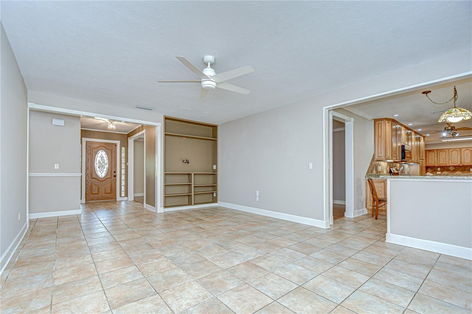 Timeless Carrollwood Beauty – Rarely Available Single-Owner Gem. Perfectly situated in the heart of Carrollwood, this 4-bedroom, 2-bath residence has been lovingly cared for by the same family since 1979, a true rarity in today’s market. Offering 2,319 sq. ft. of inviting living space, the home blends modern updates with classic character, from the paver driveway and manicured landscaping to the brick façade accented by shutters on the front windows and coach lights. A brick walkway leads to the portico entrance with a wood front door featuring an oval glass insert, while a RING doorbell adds modern convenience—an inviting introduction to the beautifully maintained interiors that await. Step inside to a welcoming foyer with a convenient hall closet, where pride of ownership is immediately apparent. The freshly painted interior showcases warm wood floors flowing through the living and dining rooms and all four bedrooms, while ceramic tile enhances the kitchen, family room, and enclosed Florida room. The formal living room features a charming bay window that fills the space with natural light, accented by elegant crown molding. The adjoining dining room also offers crown molding, providing a warm and inviting setting for gatherings and celebrations. At the heart of the home, the kitchen boasts oak cabinetry offering abundant storage, gleaming granite countertops, and a decorative tile backsplash with custom Decora tile accent. A stainless double sink with an open pass-through overlooks the Florida room, while a second prep area with matching cabinets, counters, and backsplash adds convenience for cooking and entertaining. From the kitchen, flow into the enclosed Florida room, enhanced with crown molding, three ceiling fans, a storage closet, and direct access to the backyard. A granite-topped counter creates a seamless transition to the family room, where a built-in media center completes this versatile living space. Down the hallway, accented with a classic chair rail, you’ll find the updated hall bath featuring a granite-topped vanity with double drawers and an undermount sink, a large tiled shower enclosed with seamless glass and highlighted by a Listello contrast pattern, and a convenient built-in linen closet. The spacious primary suite offers a wall-length double closet and a private ensuite with separate vanities, a seamless glass-enclosed tiled shower, a built-in linen closet, and custom shelving. Three additional bedrooms are generously sized, providing comfort and versatility for family or guests. Outdoors, discover your own tropical oasis, designed for both relaxation and entertaining. A paved patio area is thoughtfully separated by mulched and stone sections, surrounded by stunning landscaping. Adding to the appeal is a built-in, air-conditioned shed, offering the perfect solution for year-round storage or workshop space.