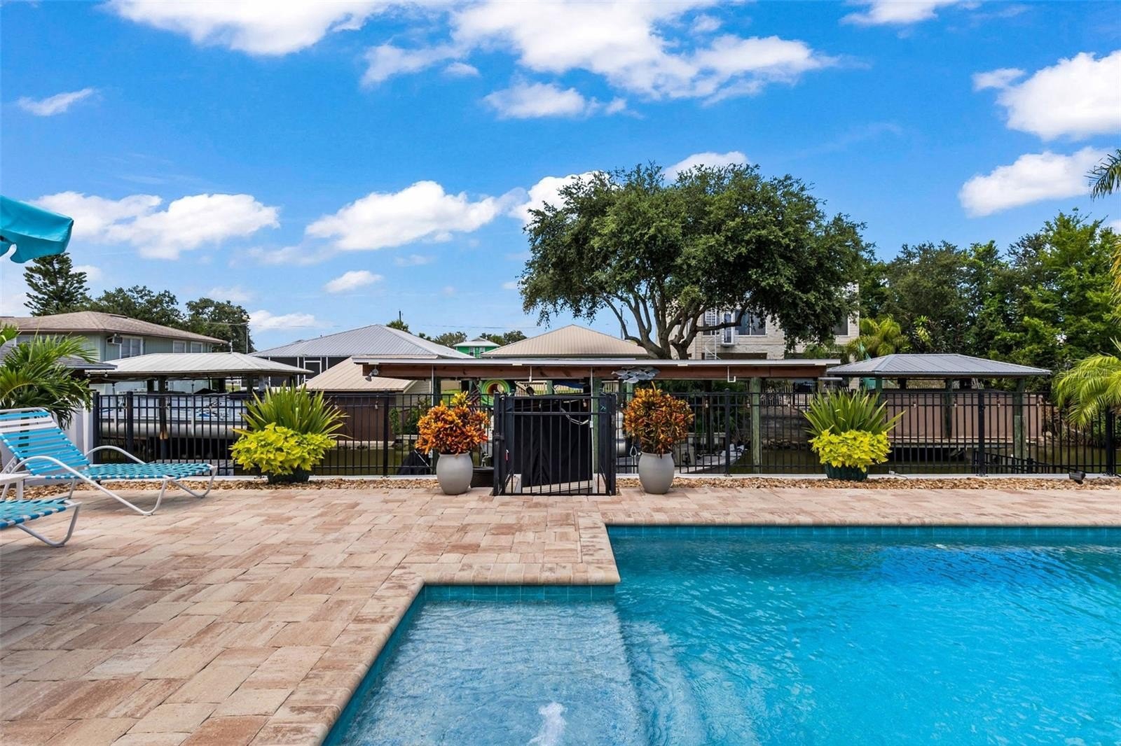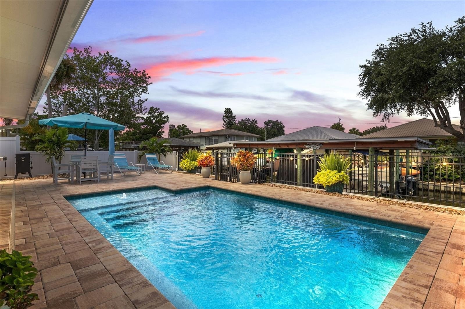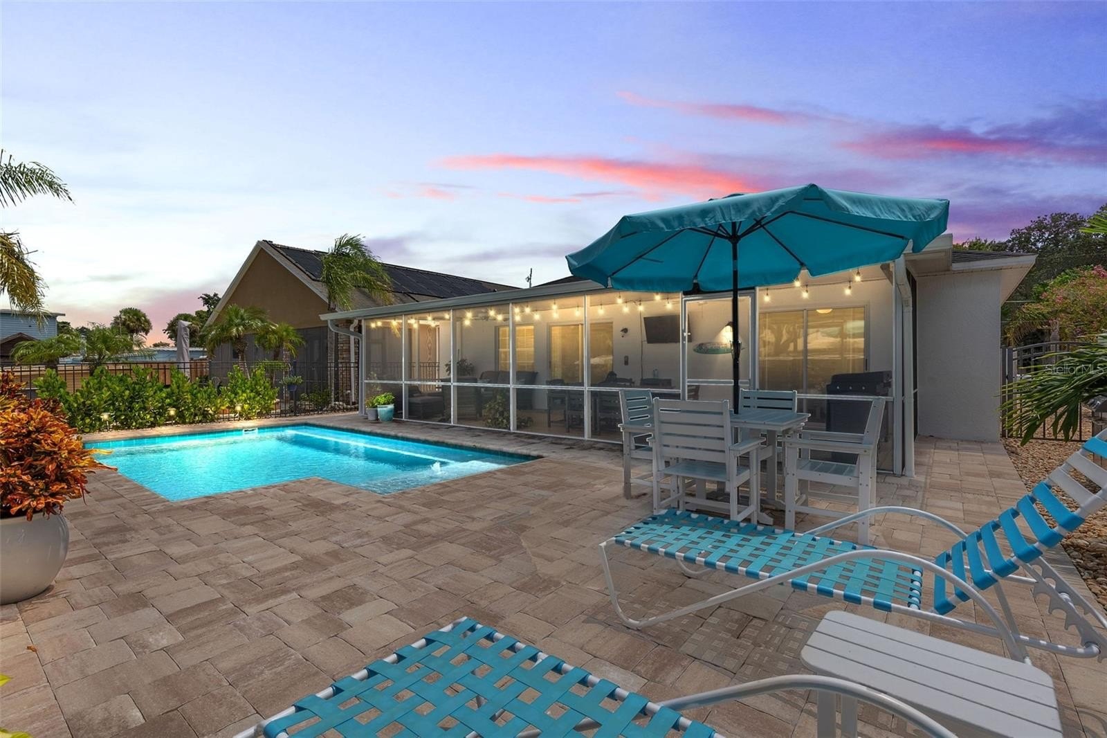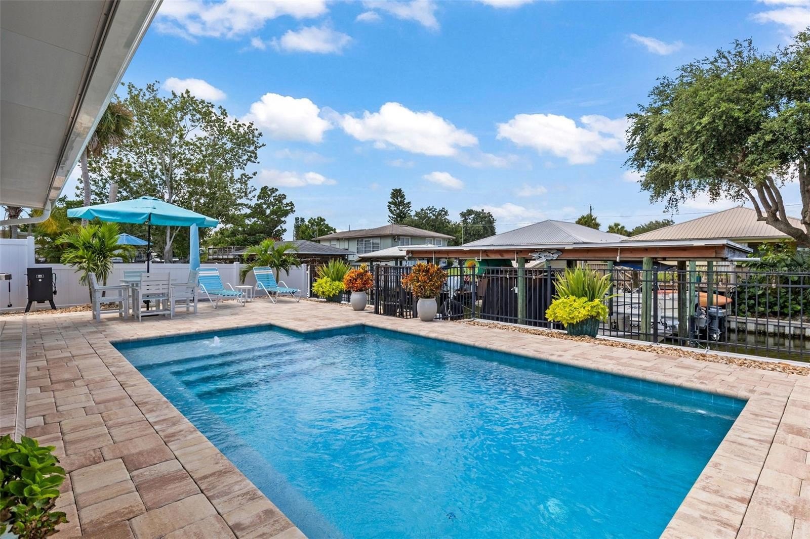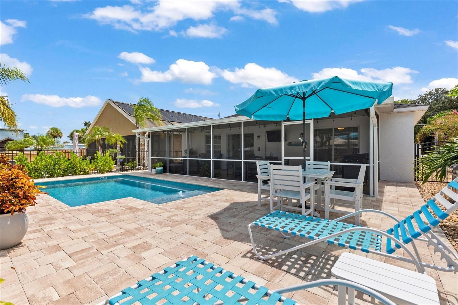 The home itself is immaculate, offering bright, open living spaces that flow seamlessly to the outdoors. The large kitchen is the heart of the home with tons of beautiful white cabinets and breakfast bar. The entire home has newer vinyl flooring, new roof and A/C in 2017 and 2018. The master suite has a custom-designed walk-in closet, and a slider to the large, newly screened patio and private backyard retreat where a new sparkling pool (2024), expansive paved patio, and waterfront views create the perfect setting for entertaining, relaxing, or soaking up the Florida sunshine. This home was designed for those who want it all—luxury, comfort, and the best of Florida’s outdoor living. With everything newer, and the no-maintenance yard, there's nothing left to do but have fun!