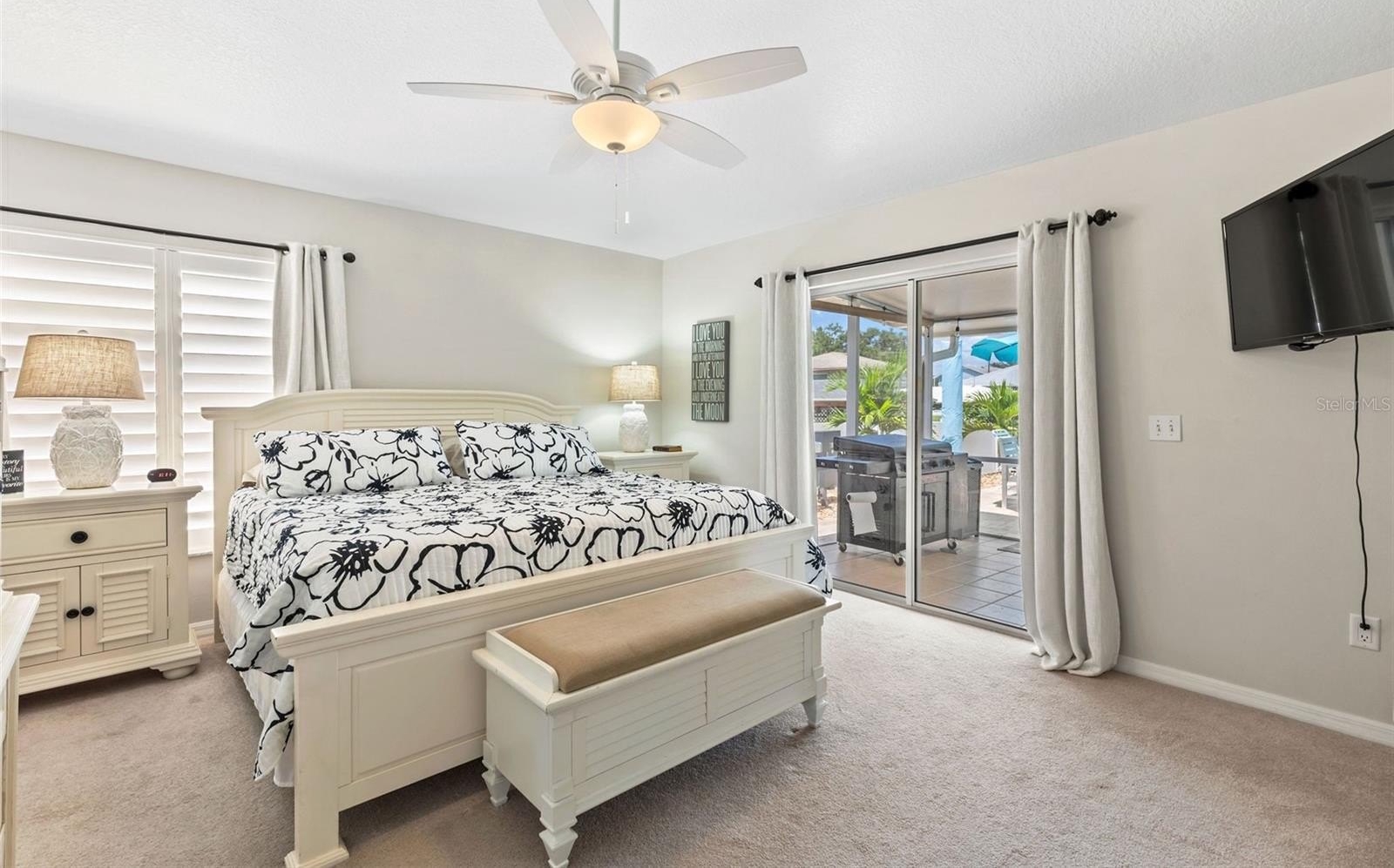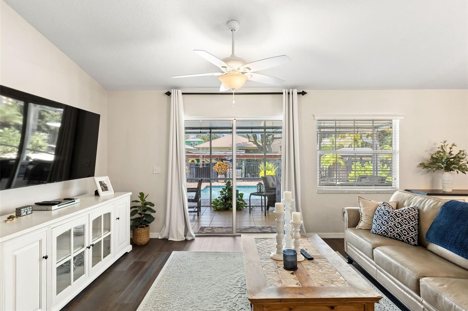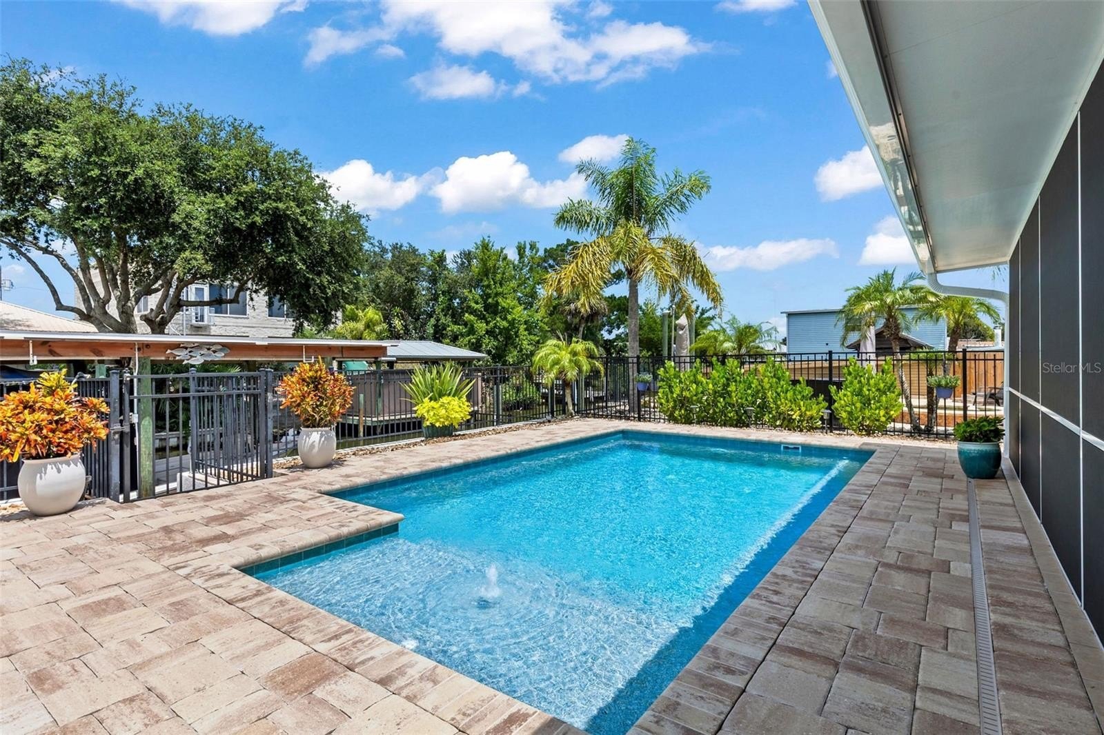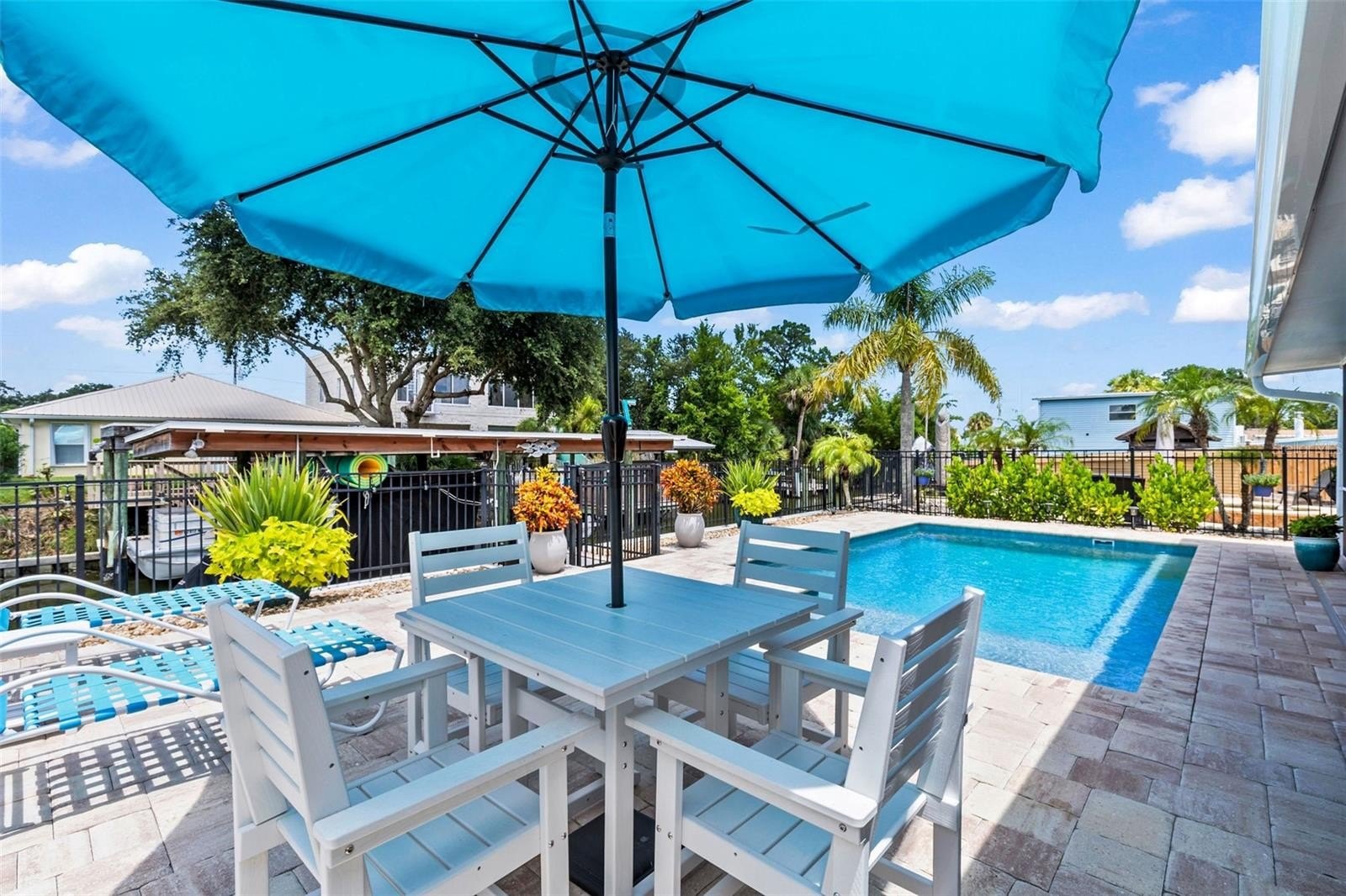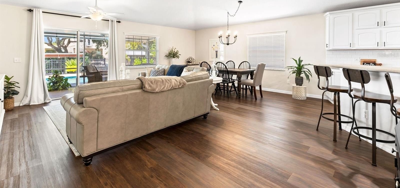The home itself is immaculate, offering bright, open living spaces that flow seamlessly to the outdoors. The large kitchen is the heart of the home with tons of beautiful white cabinets and breakfast bar. The entire home has newer vinyl flooring, new roof and A/C in 2017 and 2018. The master suite has a custom-designed walk-in closet, and a slider to the large, newly screened patio and private backyard retreat where a new sparkling pool (2024), expansive paved patio, and waterfront views create the perfect setting for entertaining, relaxing, or soaking up the Florida sunshine. This home was designed for those who want it all—luxury, comfort, and the best of Florida’s outdoor living. With everything newer, and the no-maintenance yard, there's nothing left to do but have fun!