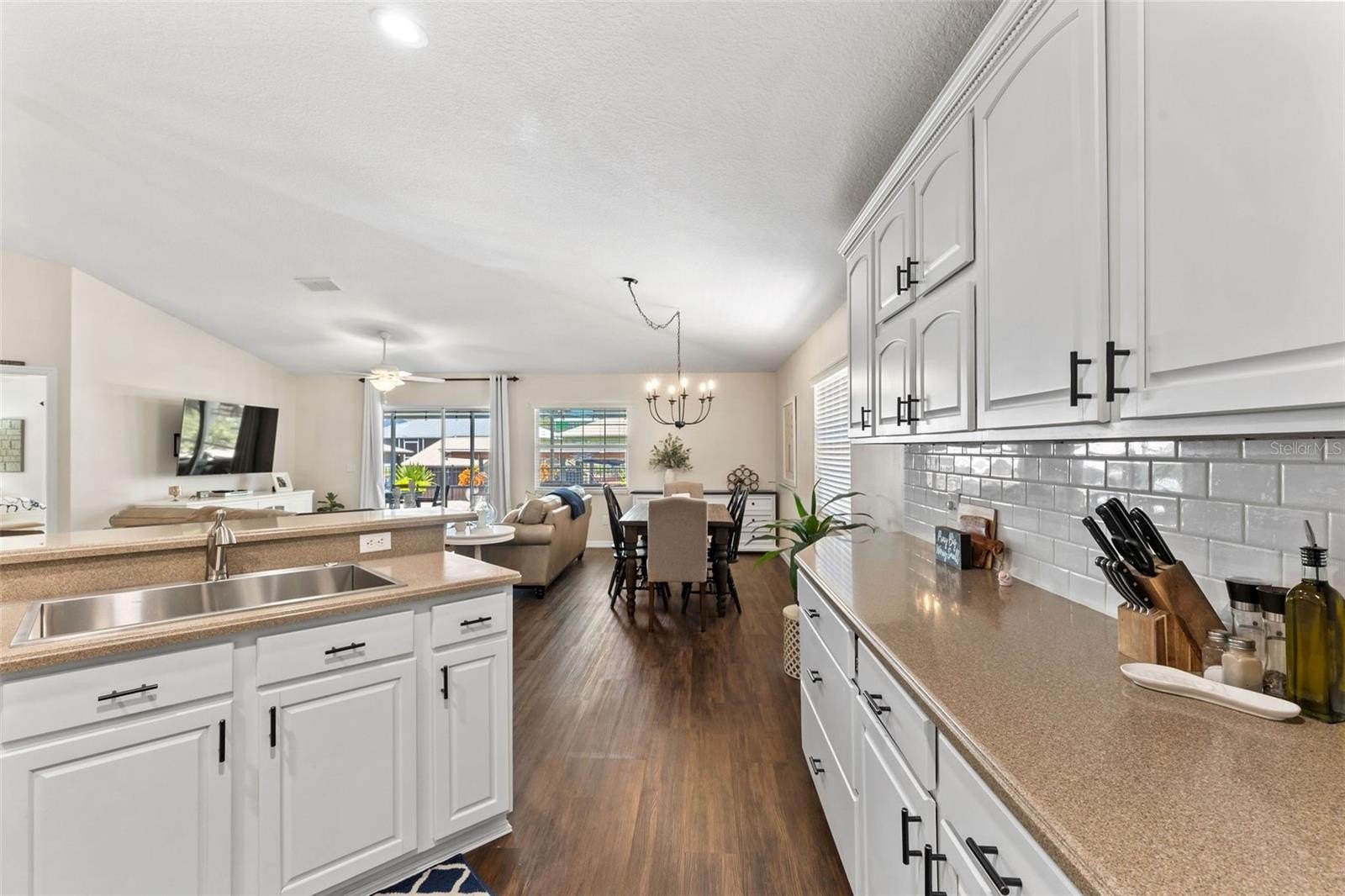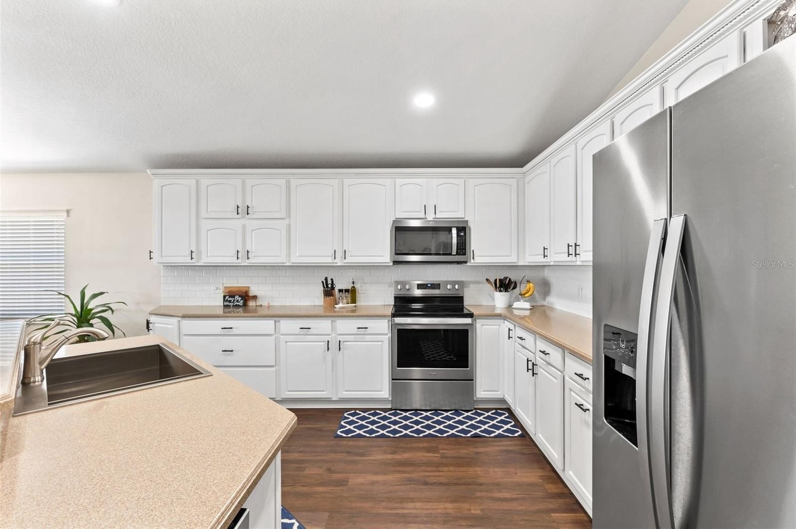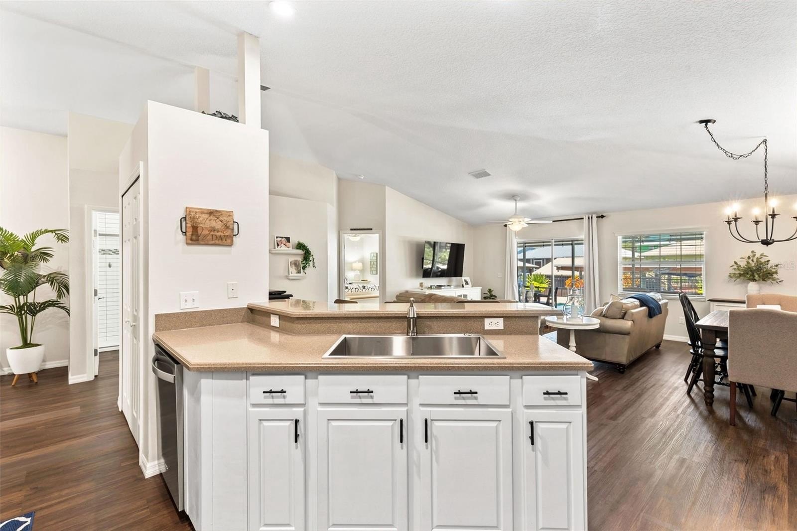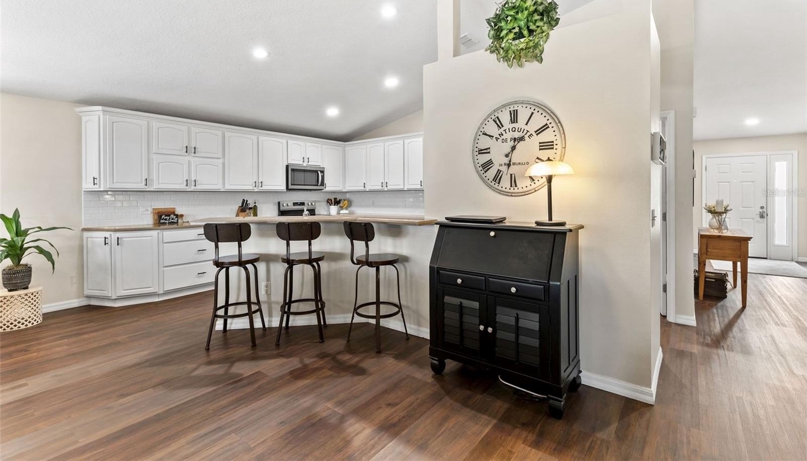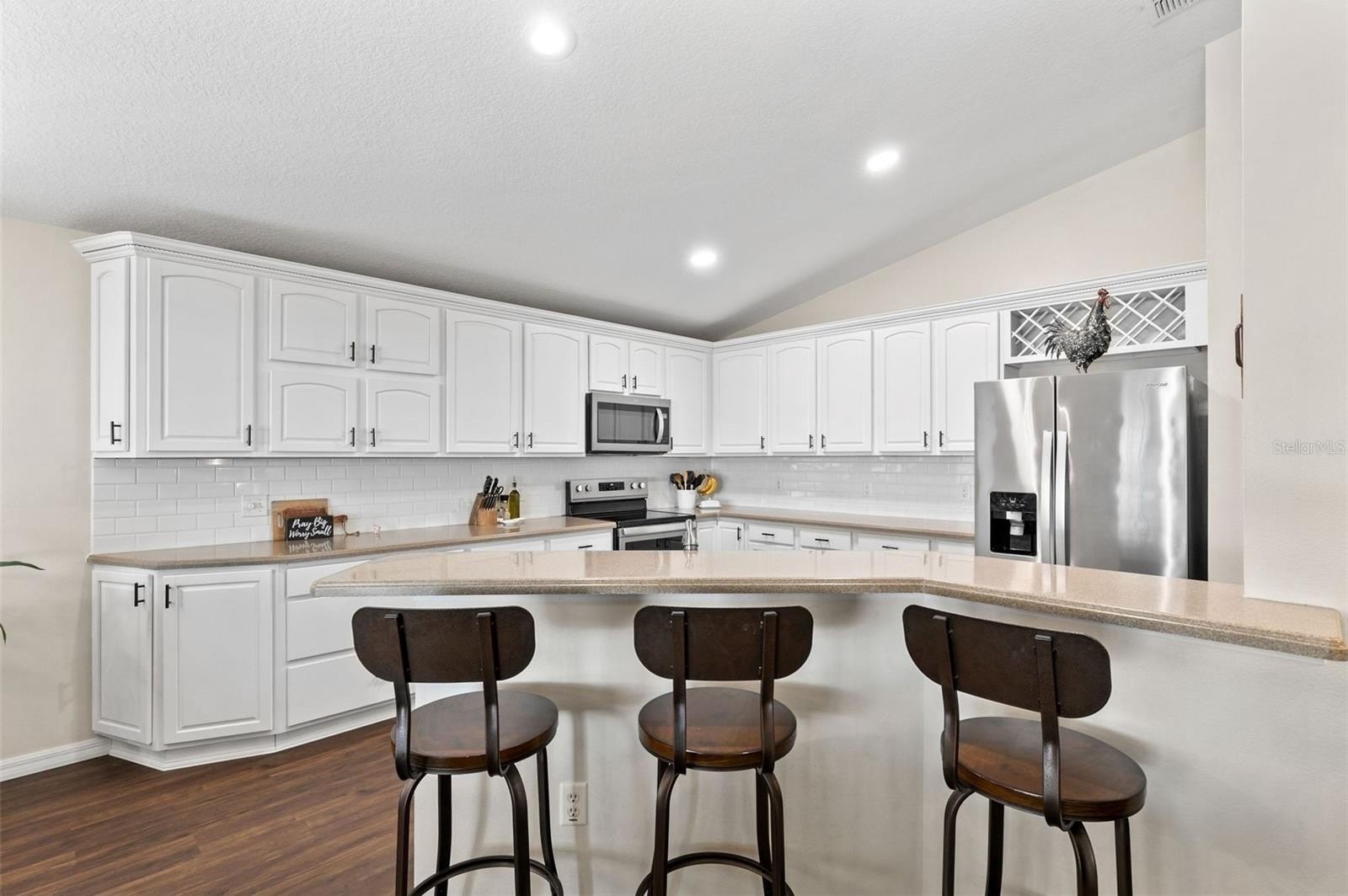 The home itself is immaculate, offering bright, open living spaces that flow seamlessly to the outdoors. The large kitchen is the heart of the home with tons of beautiful white cabinets and breakfast bar. The entire home has newer vinyl flooring, new roof and A/C in 2017 and 2018. The master suite has a custom-designed walk-in closet, and a slider to the large, newly screened patio and private backyard retreat where a new sparkling pool (2024), expansive paved patio, and waterfront views create the perfect setting for entertaining, relaxing, or soaking up the Florida sunshine. This home was designed for those who want it all—luxury, comfort, and the best of Florida’s outdoor living. With everything newer, and the no-maintenance yard, there's nothing left to do but have fun!